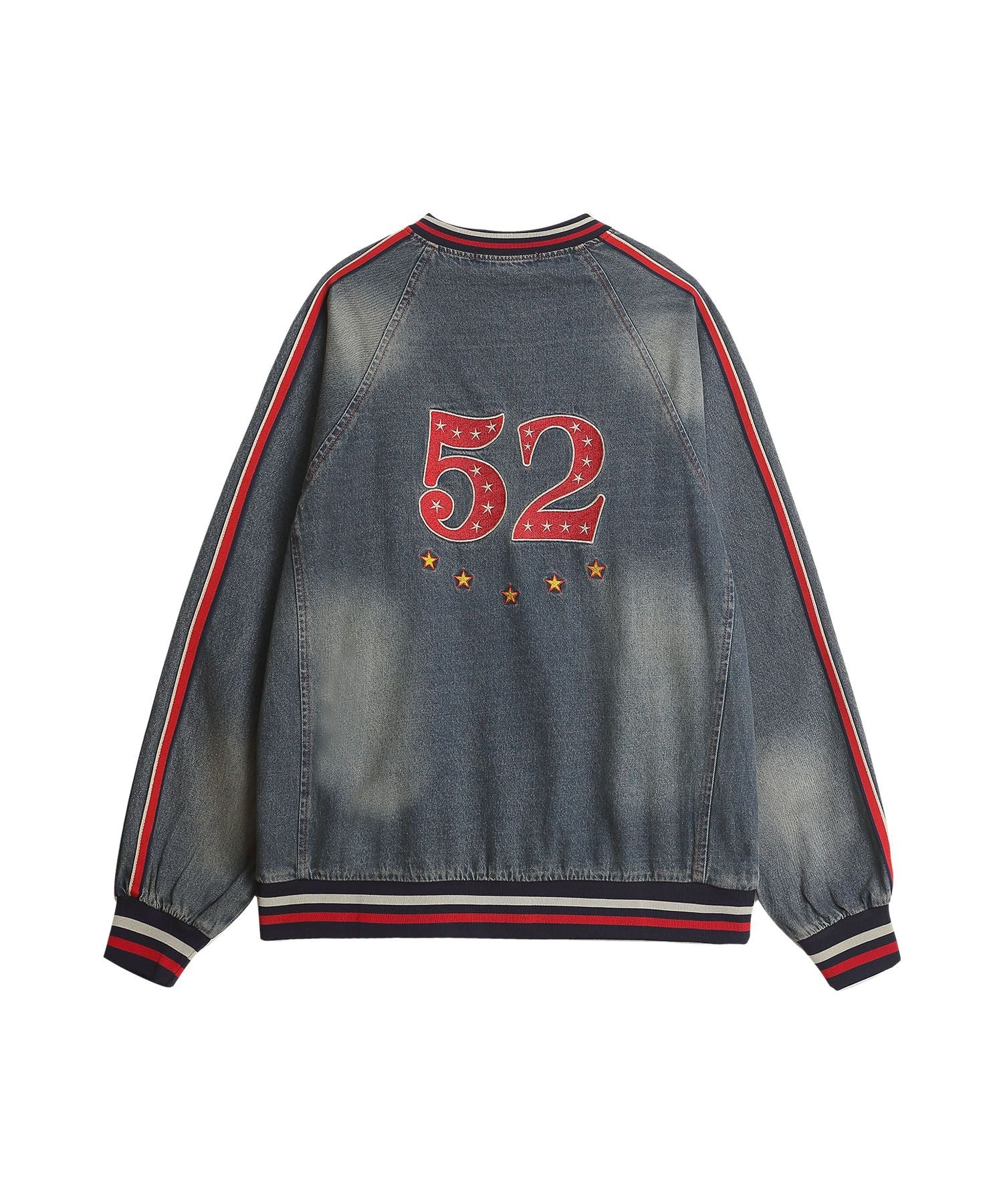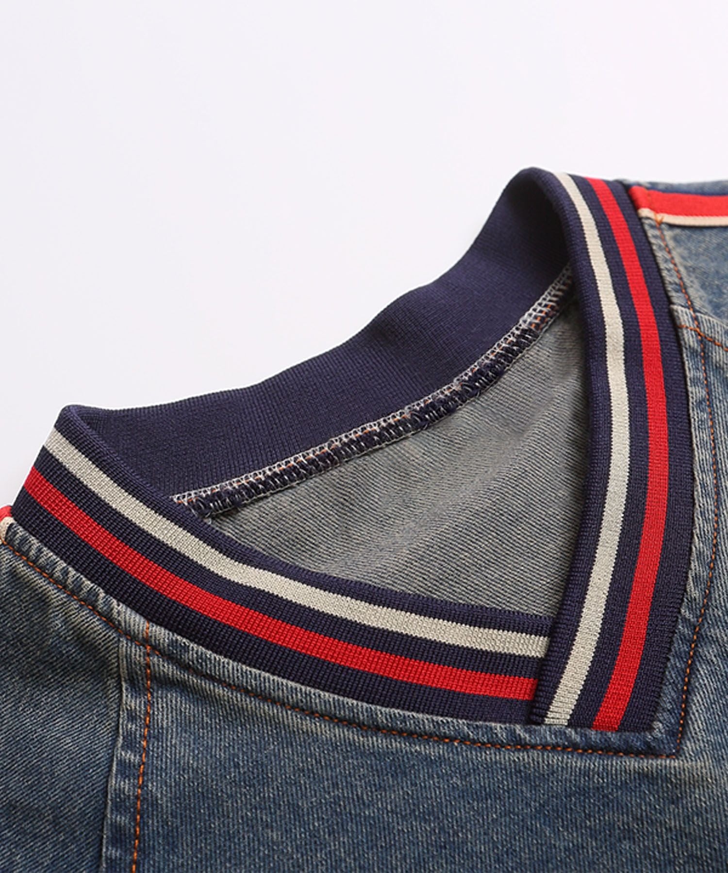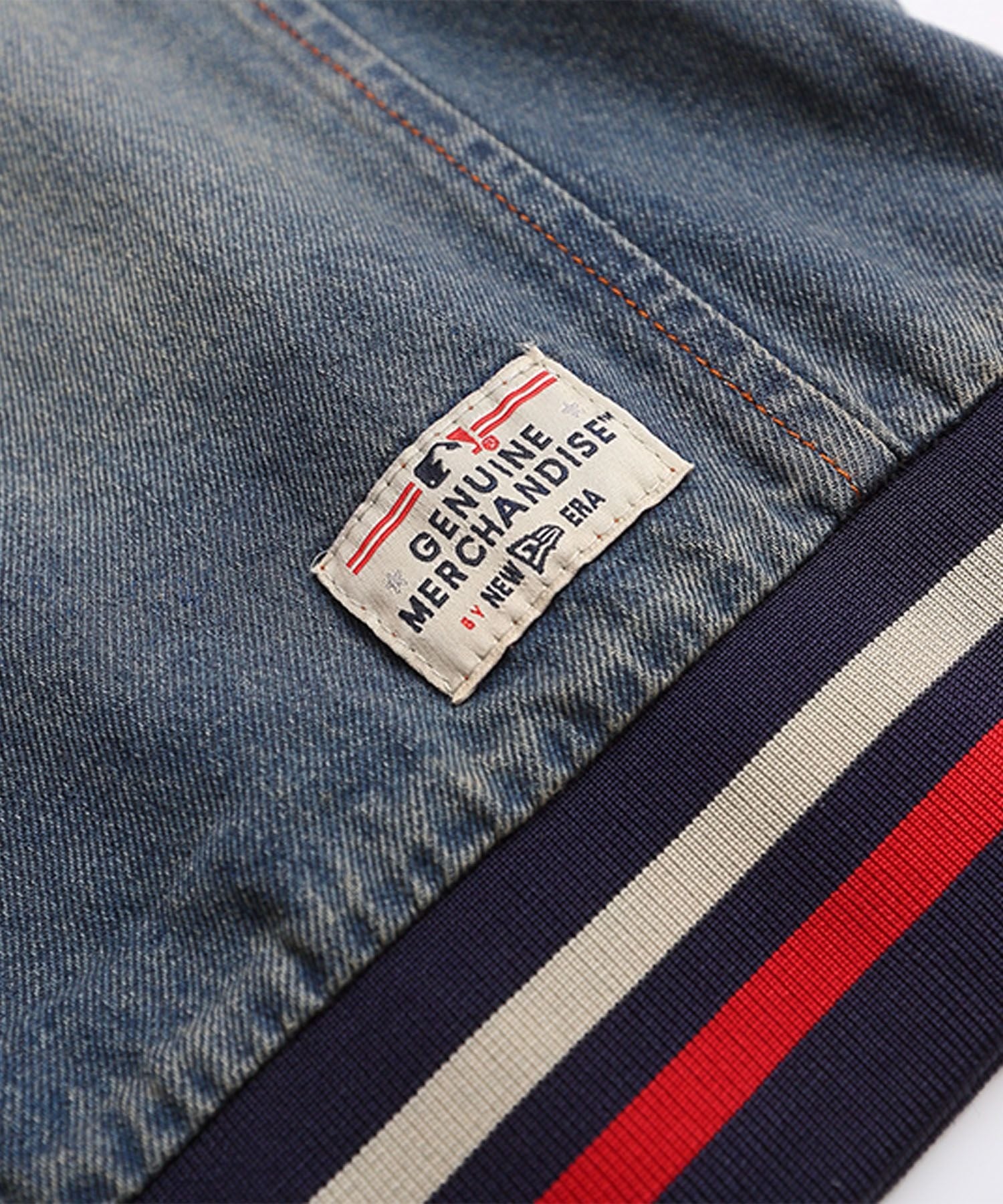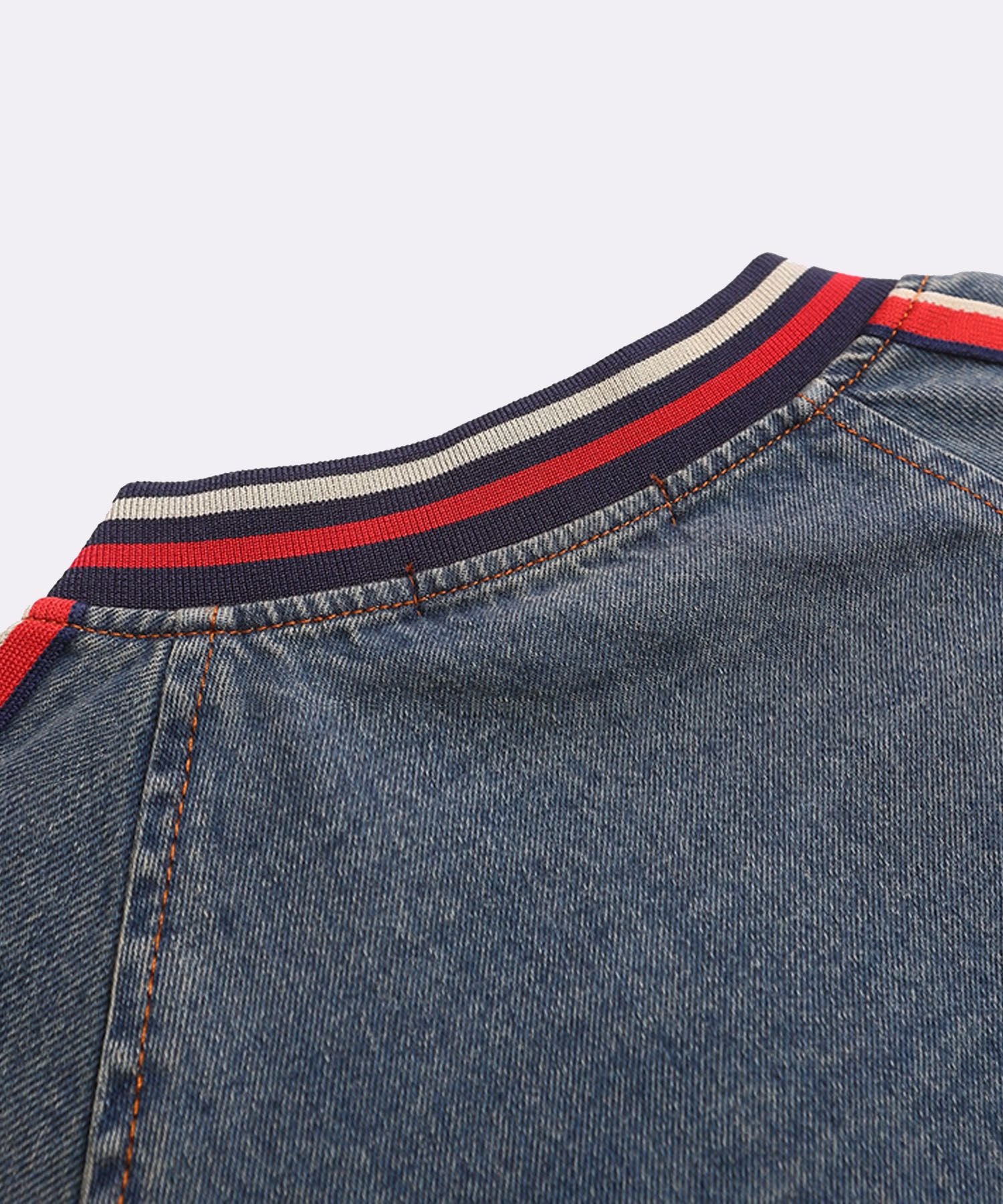 袖のサイドに配された赤×ネイビーのラインがスポーティーなアクセントとなり、デニム生地特有の色落ちフェード加工がこなれ感をプラス。ゆったりとしたシルエットで着心地も抜群です。