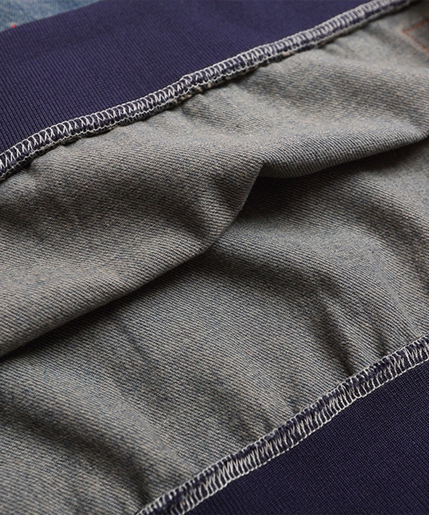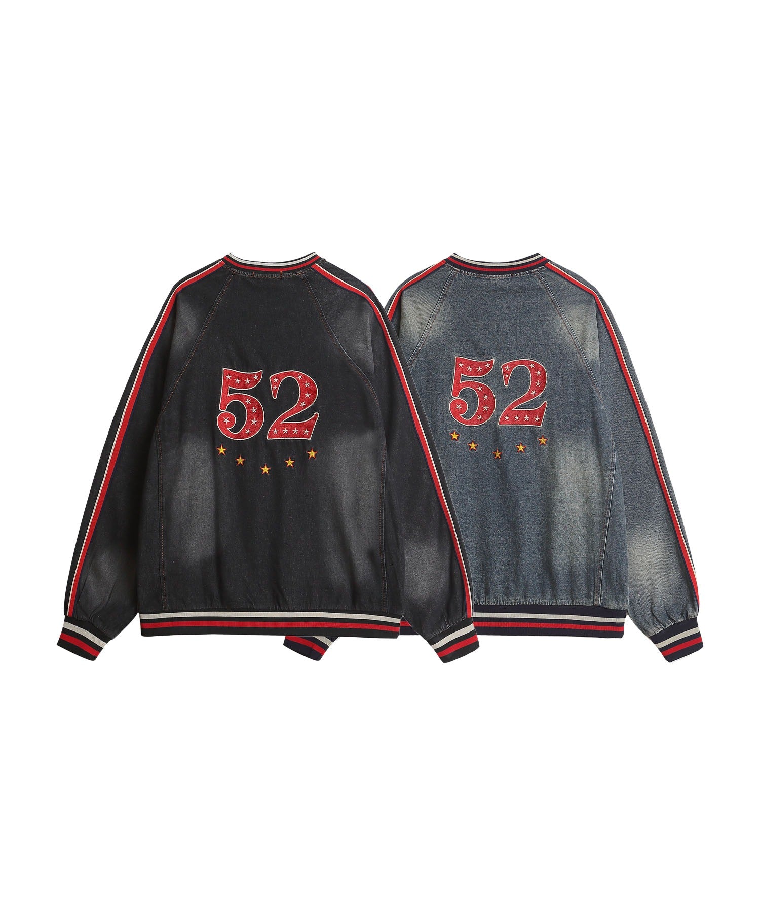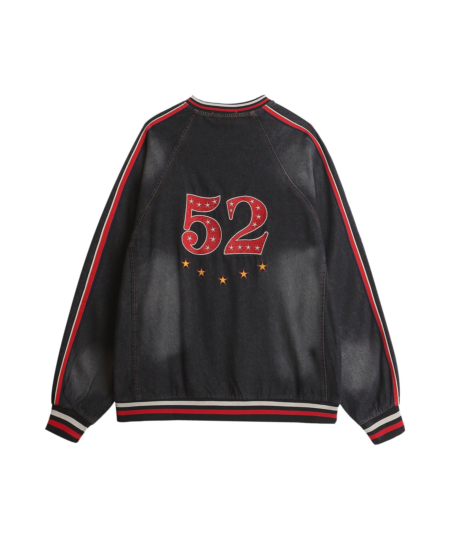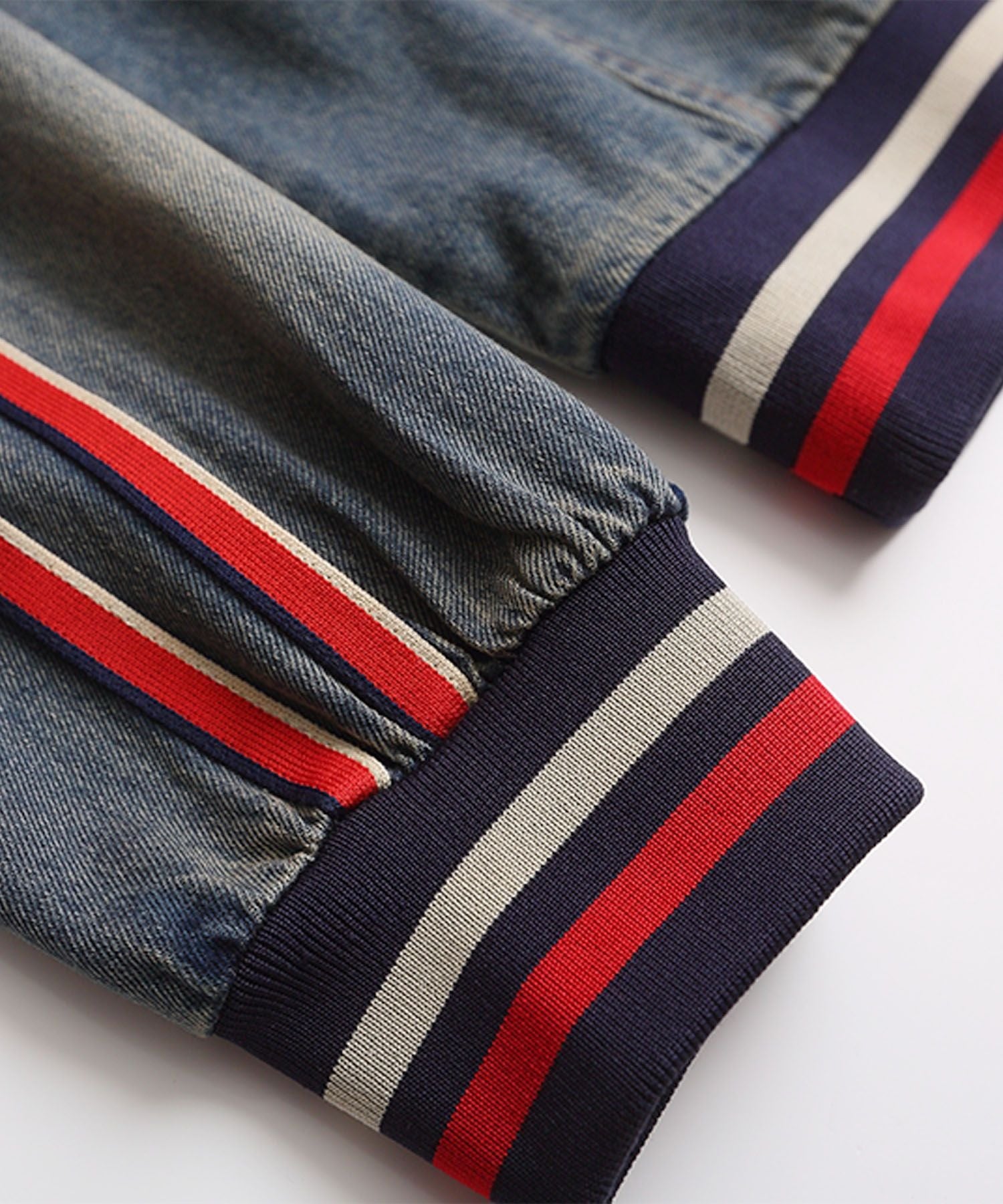 袖のサイドに配された赤×ネイビーのラインがスポーティーなアクセントとなり、デニム生地特有の色落ちフェード加工がこなれ感をプラス。ゆったりとしたシルエットで着心地も抜群です。