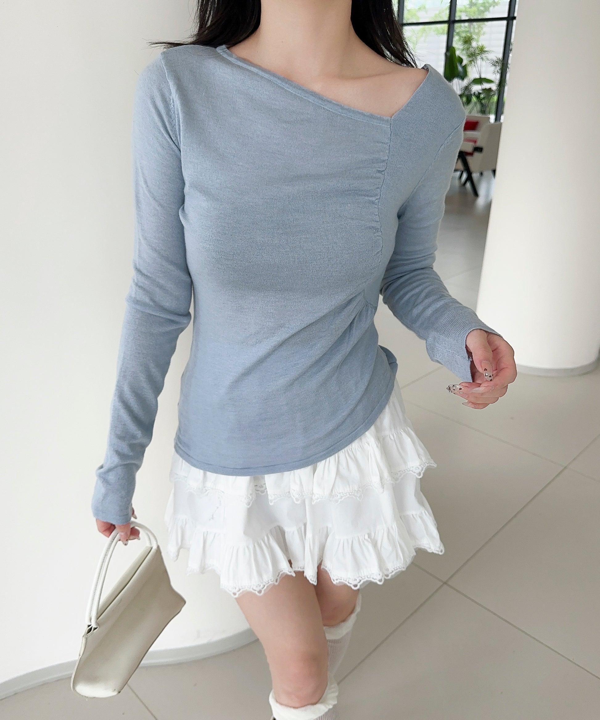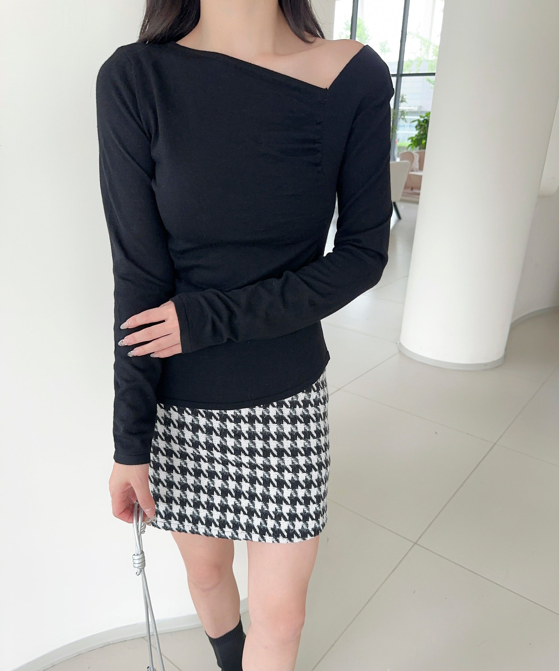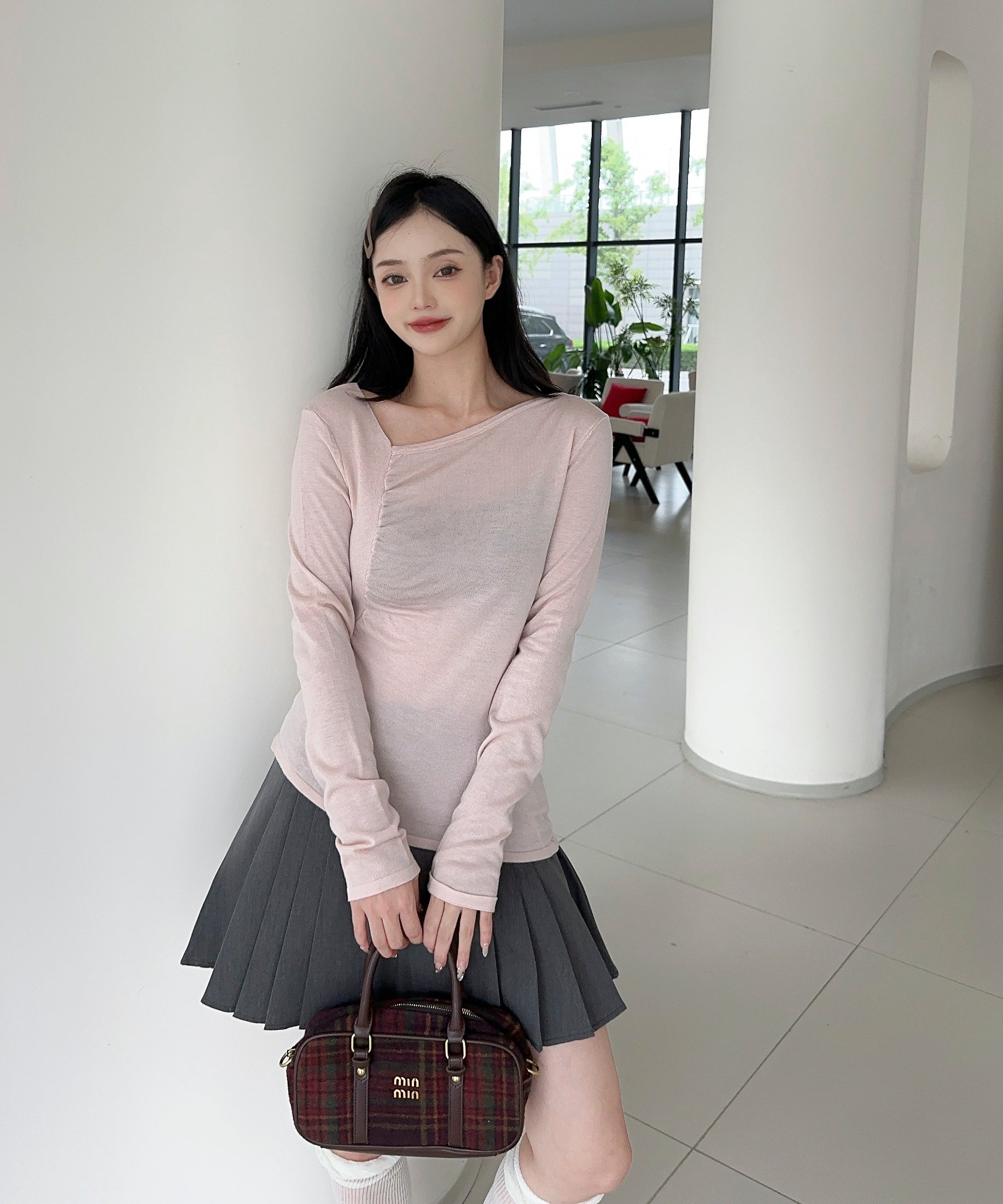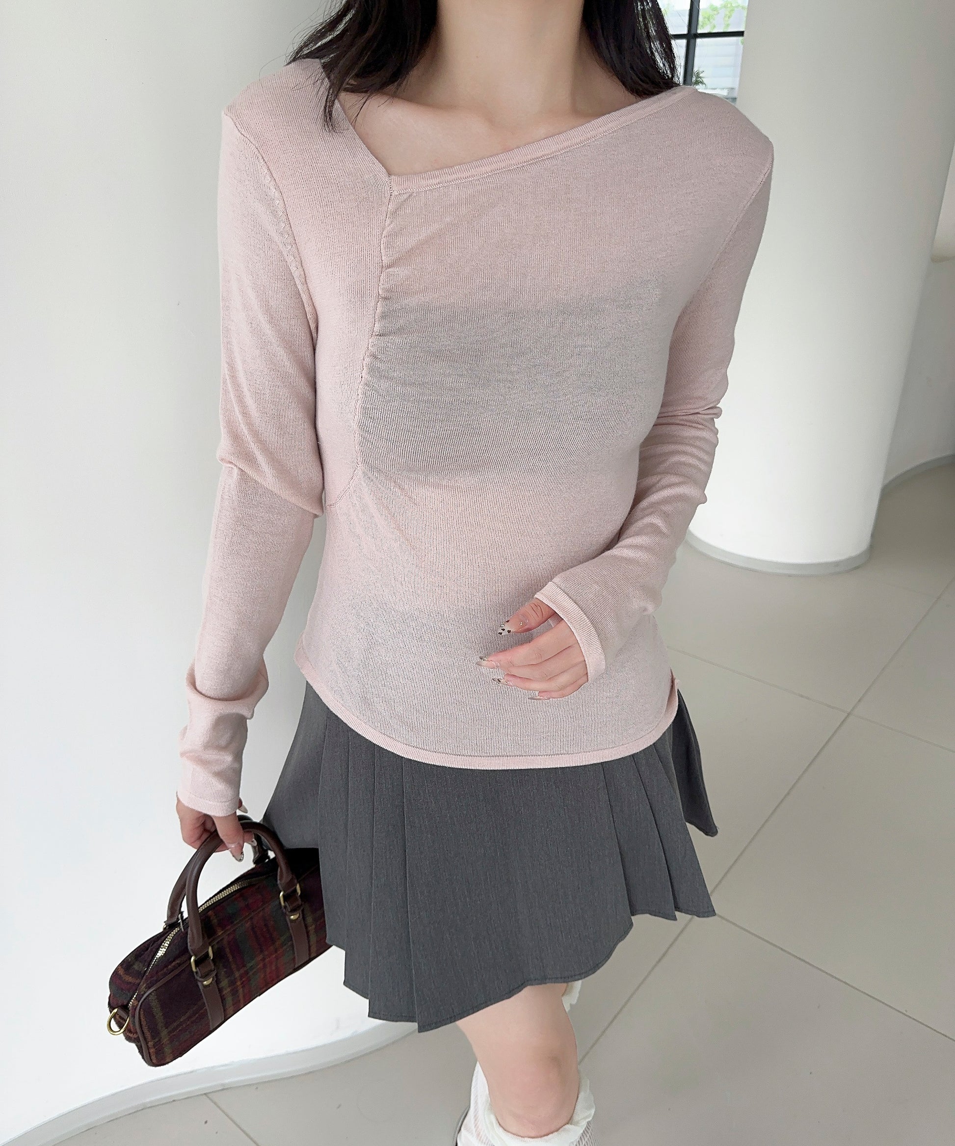 アシンメトリーデザインのニットトップス。大人の抜け感と遊び心をプラスします。