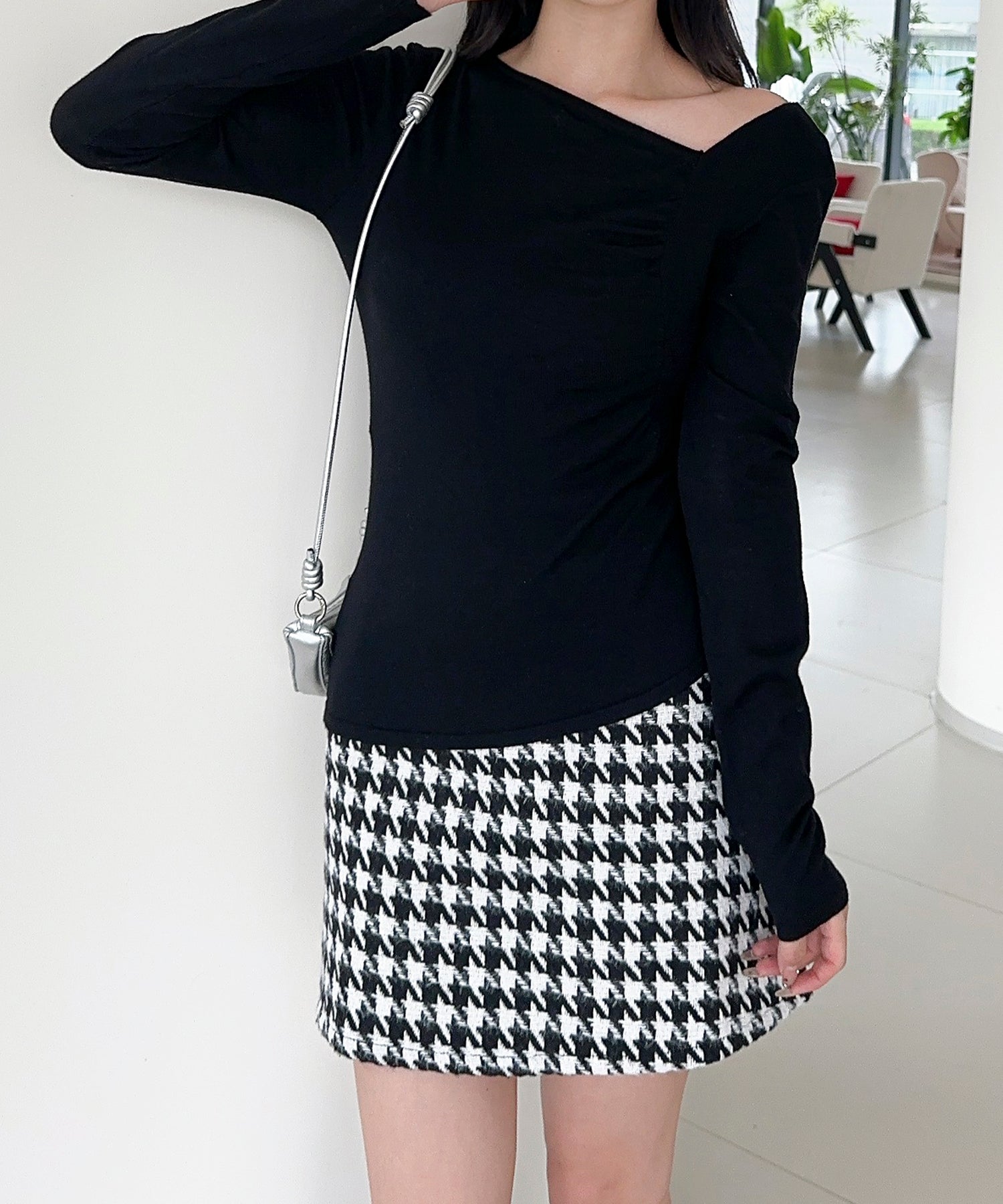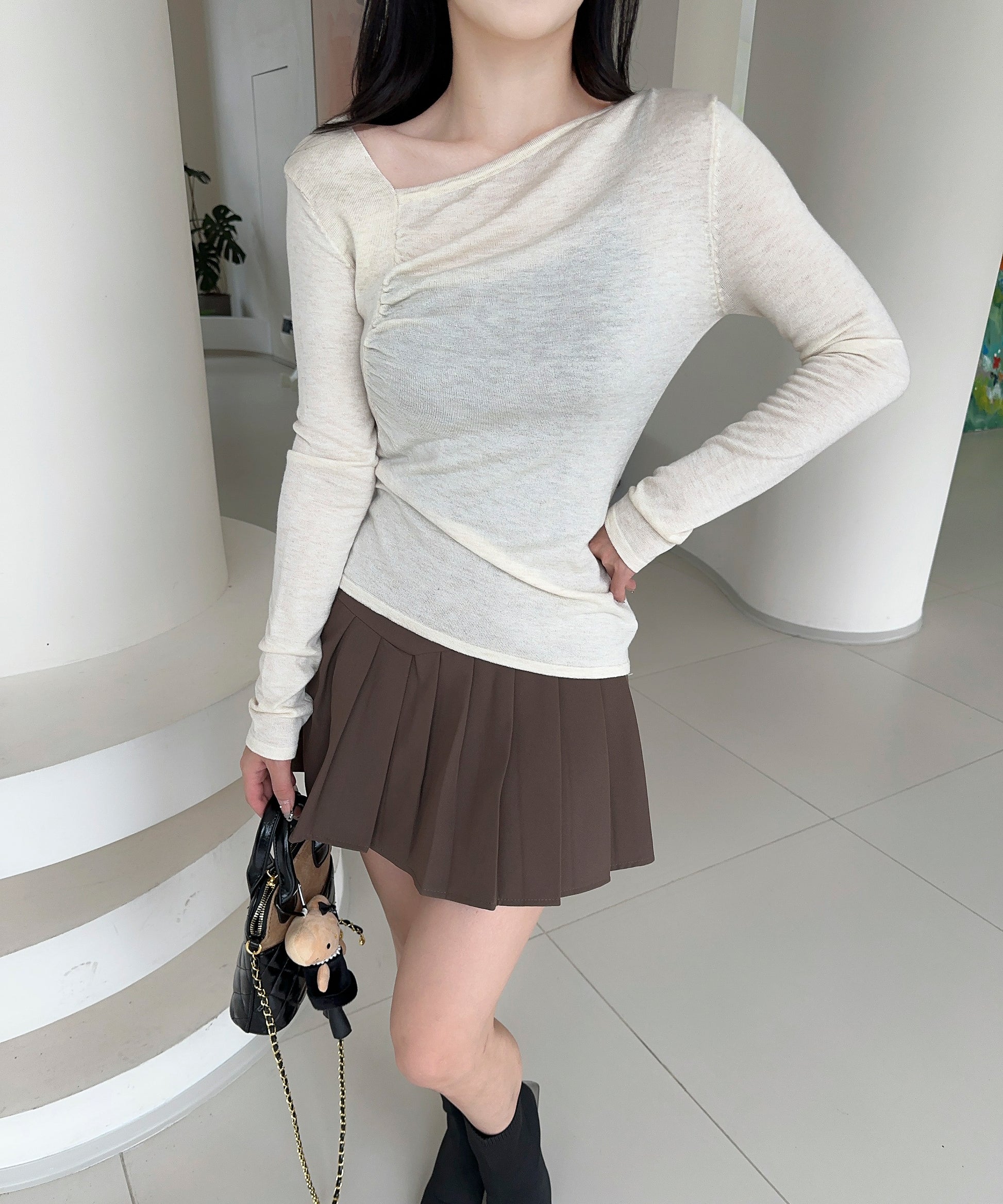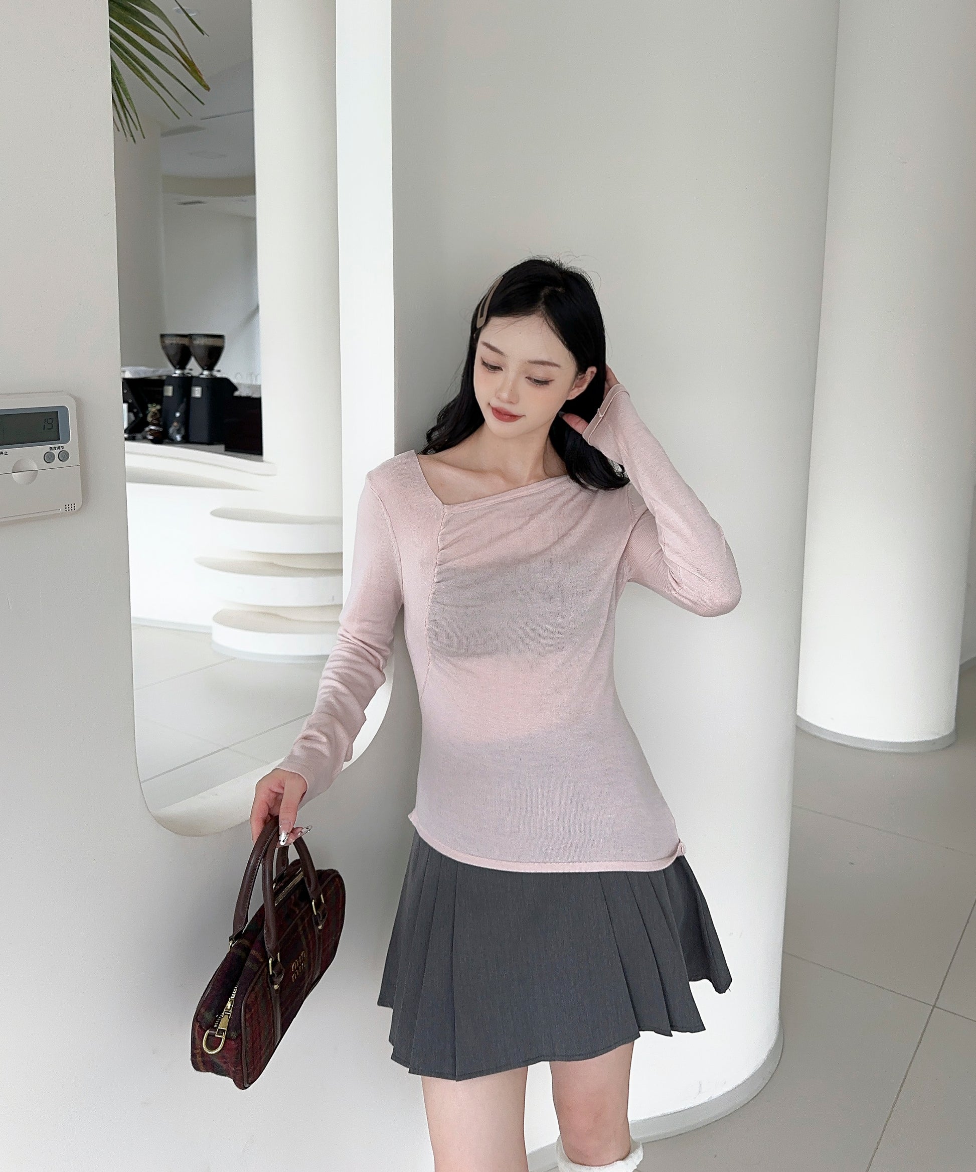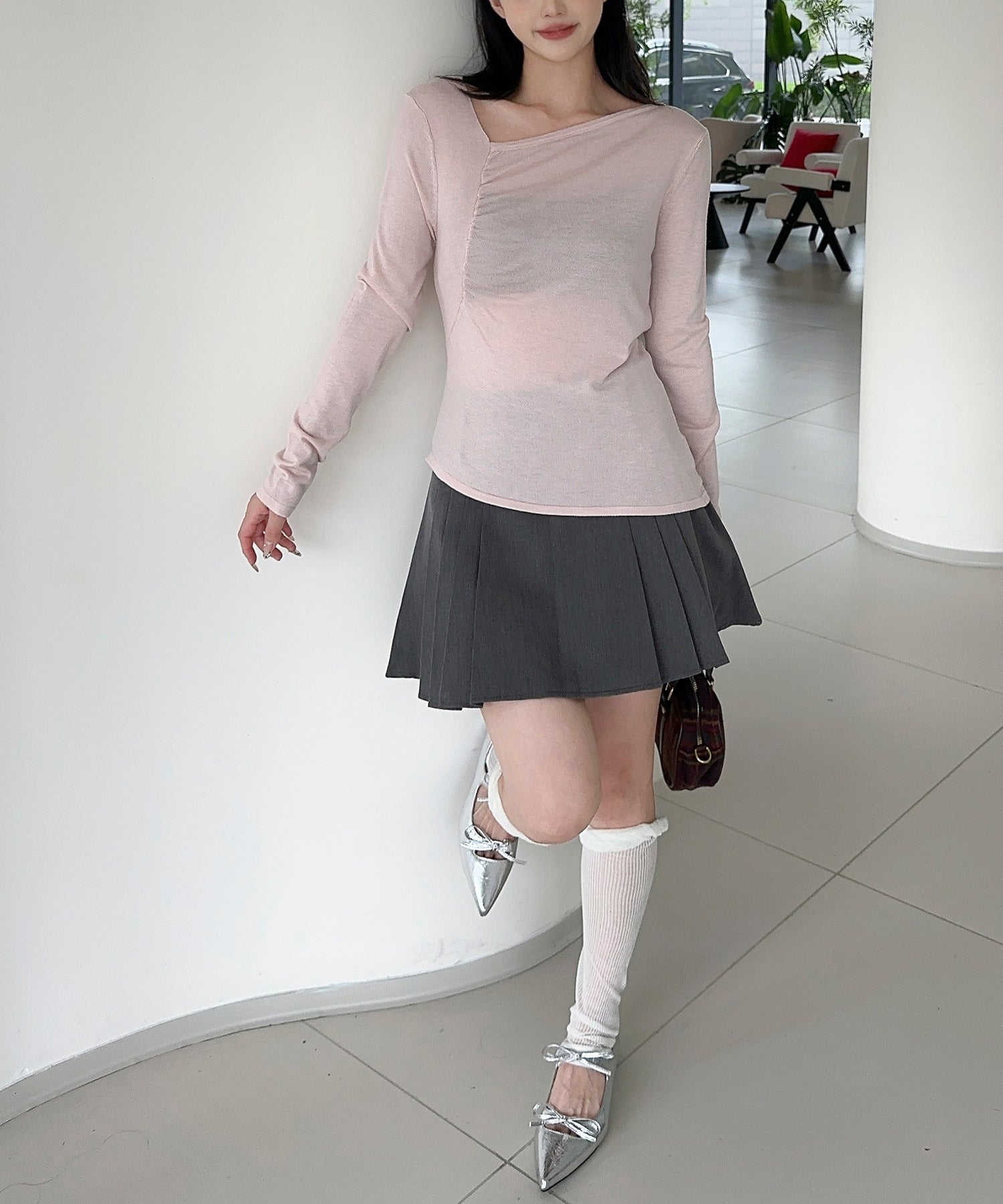 アシンメトリーデザインのニットトップス。大人の抜け感と遊び心をプラスします。