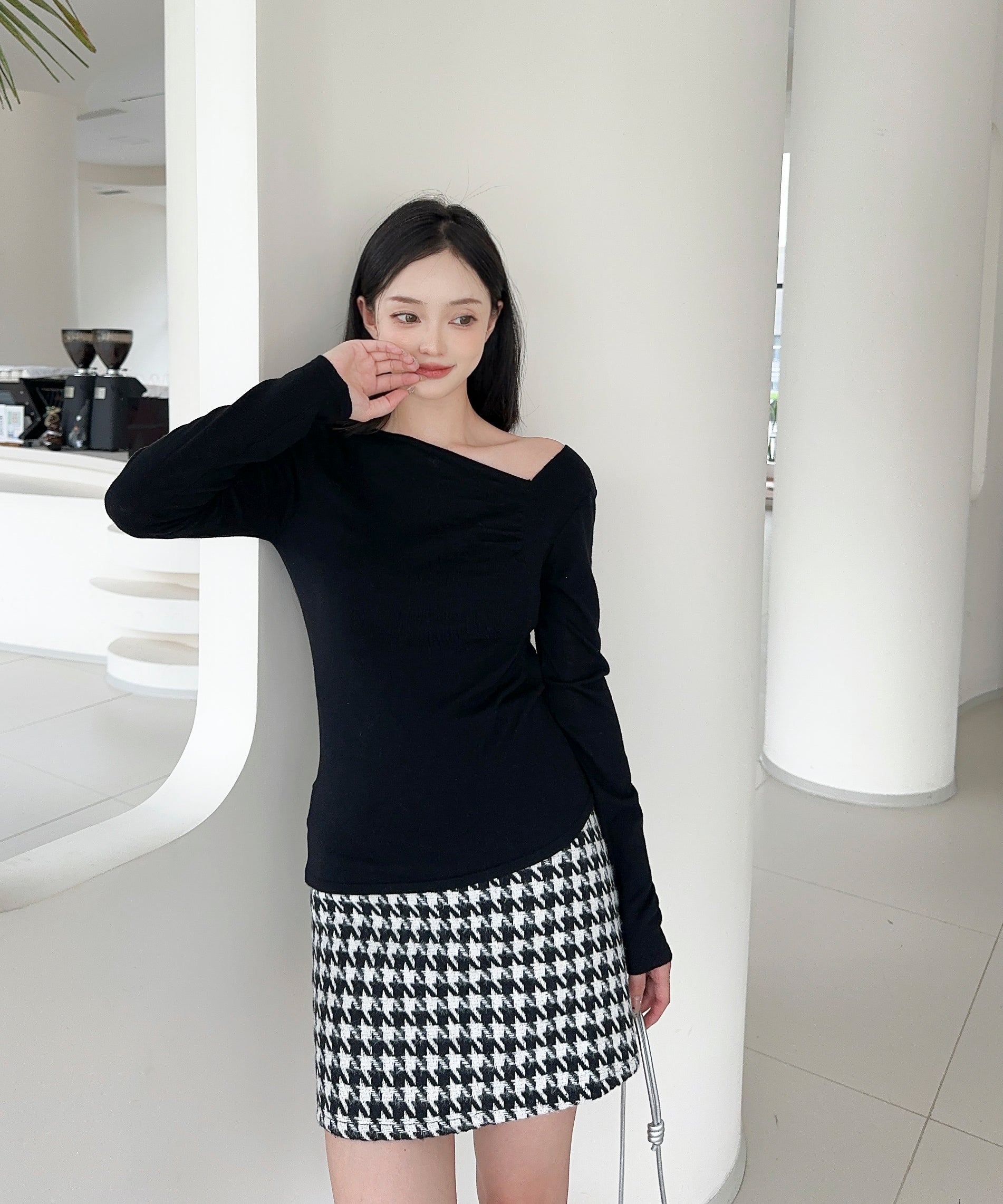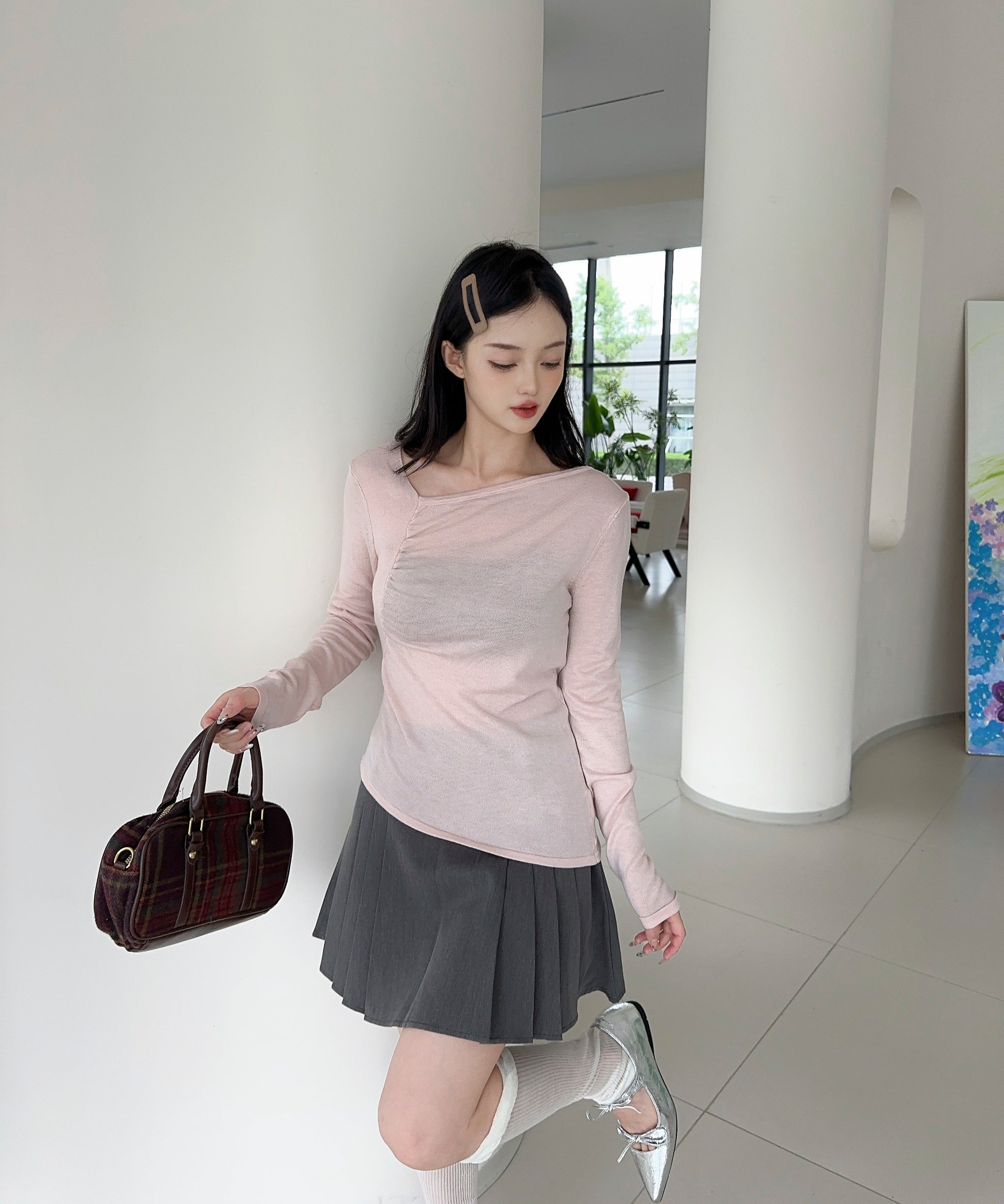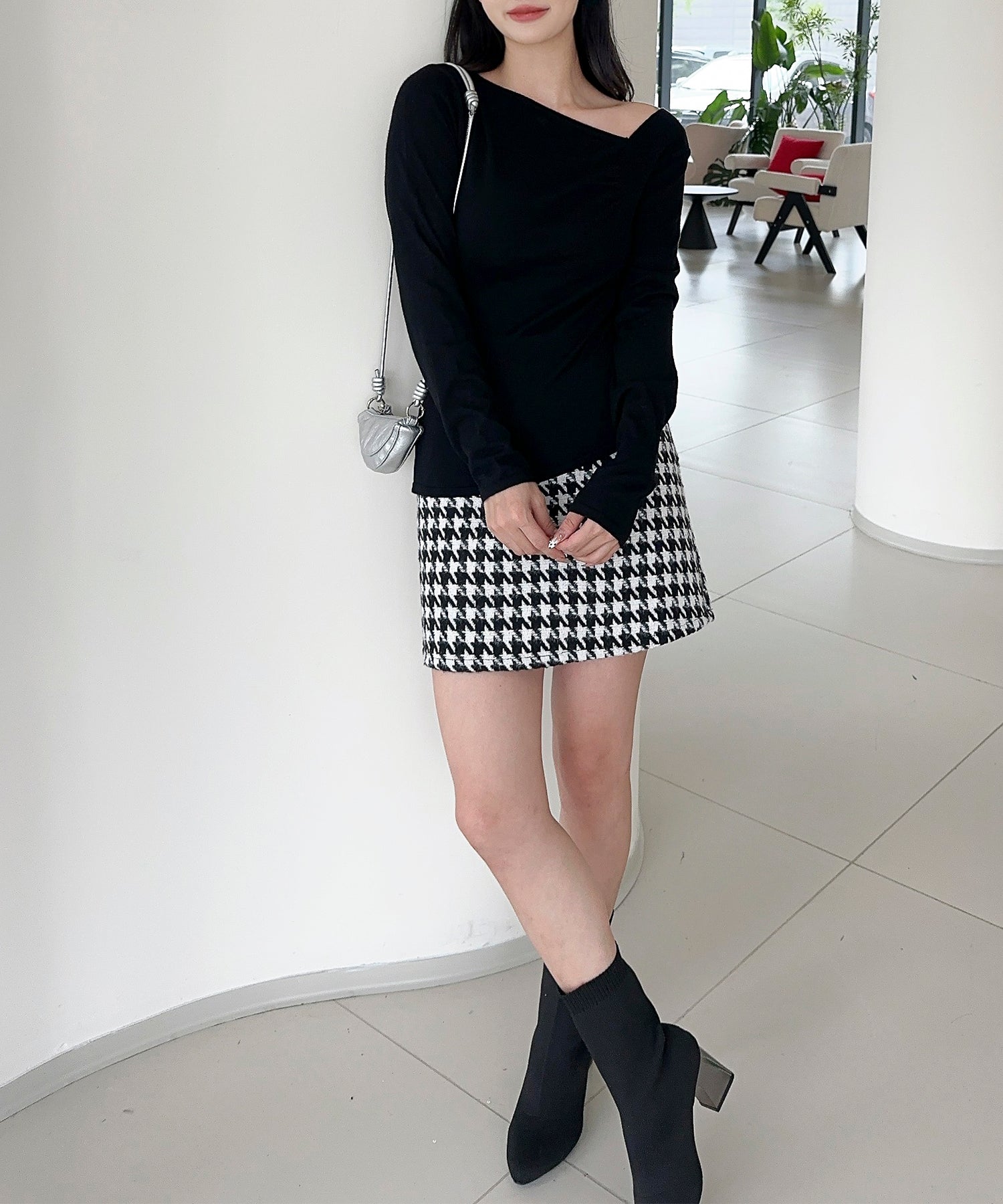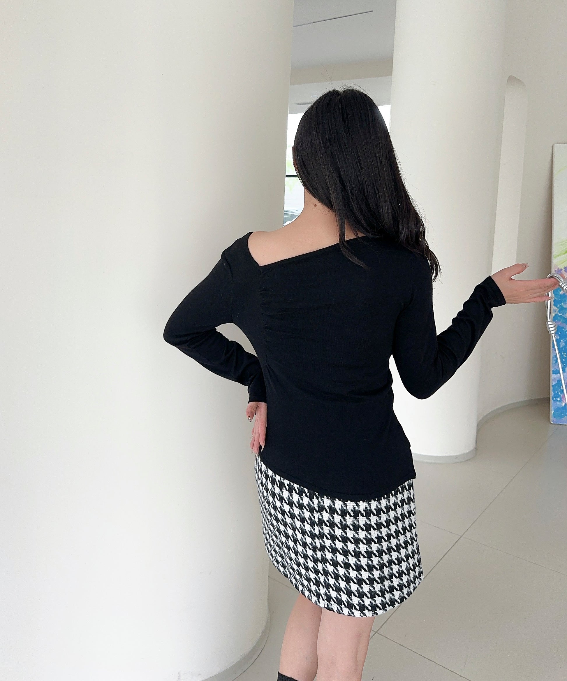 アシンメトリーデザインのニットトップス。大人の抜け感と遊び心をプラスします。