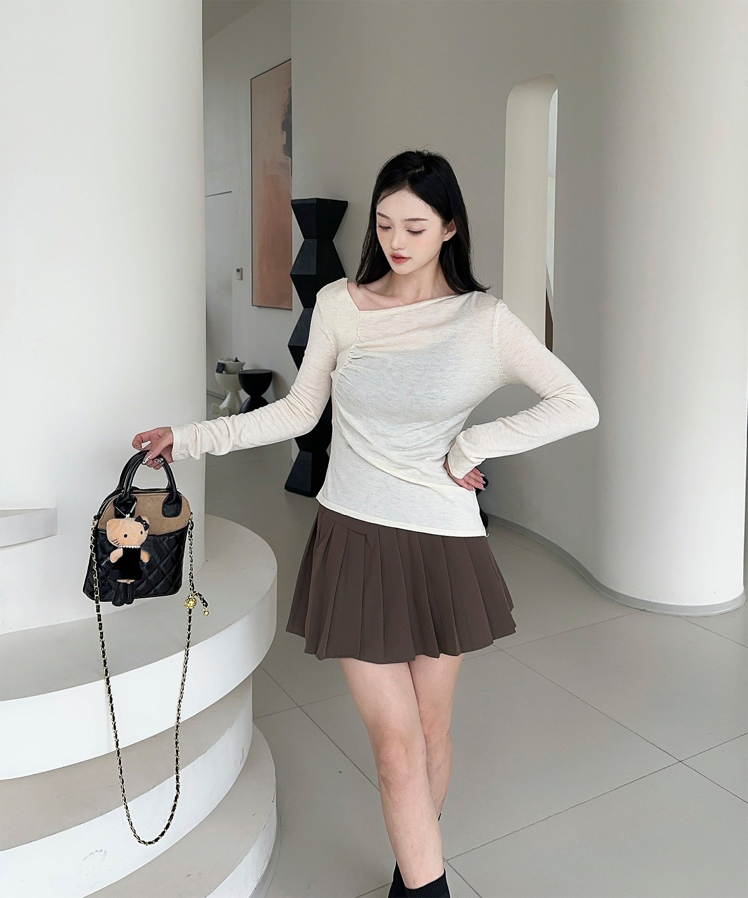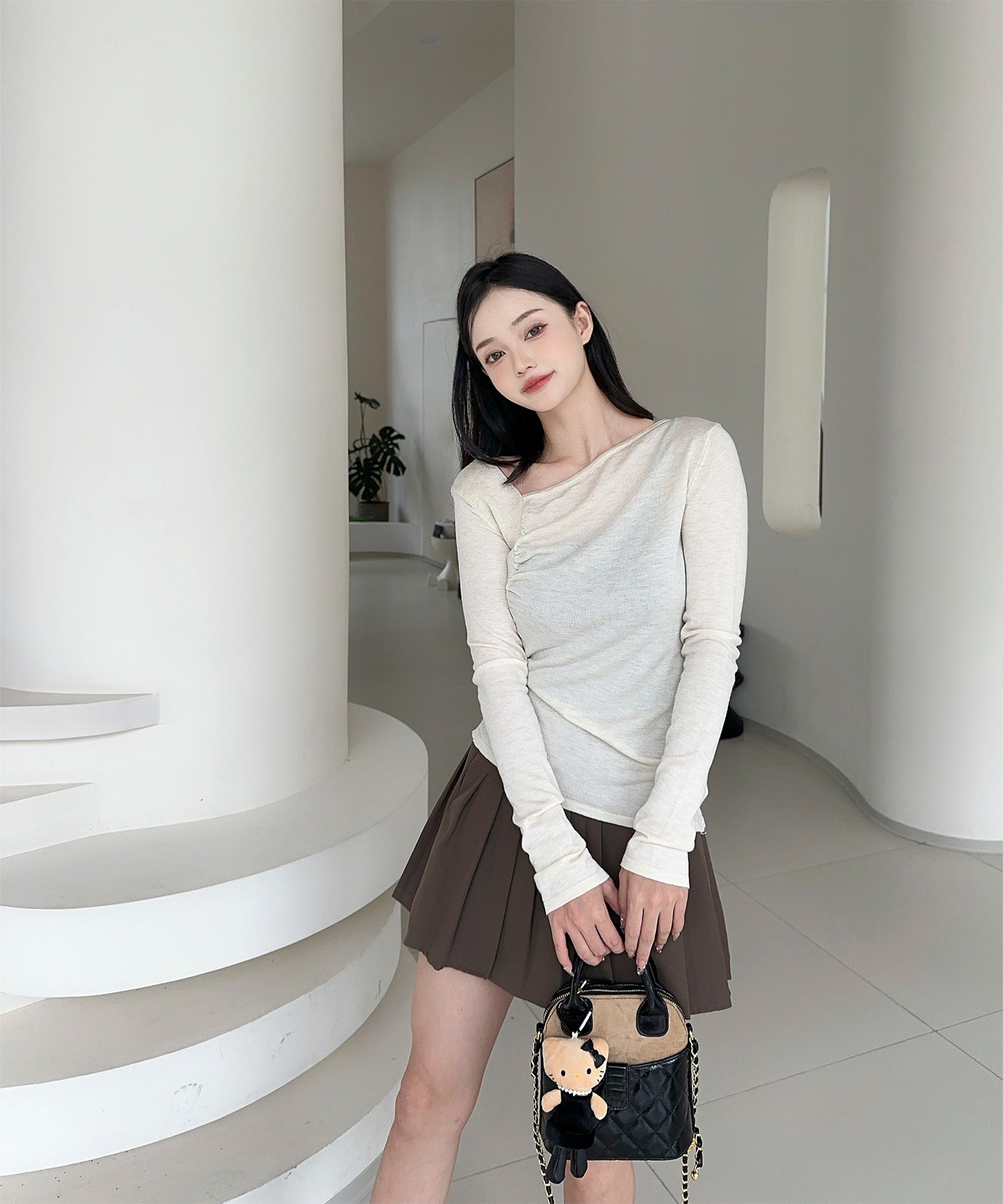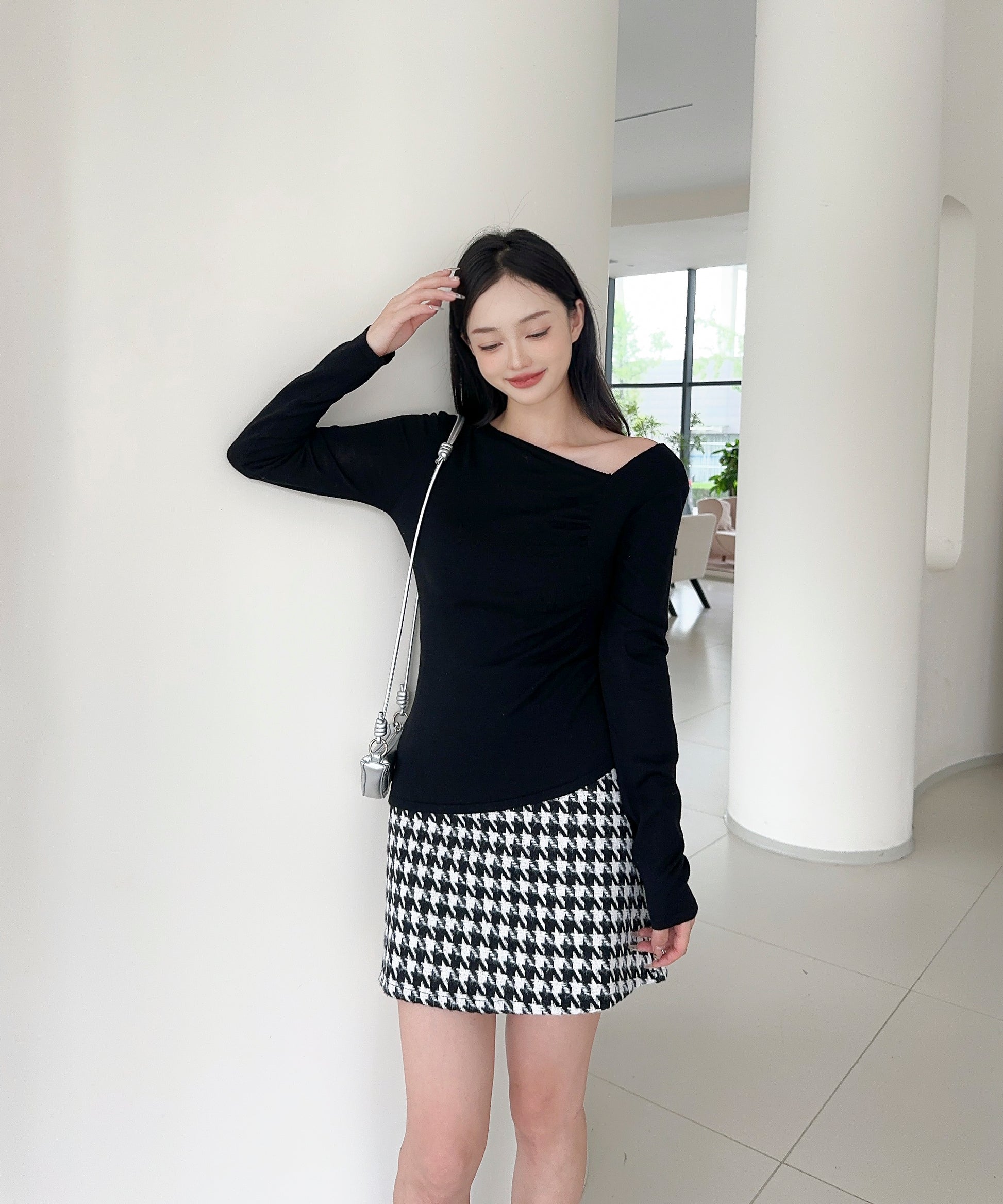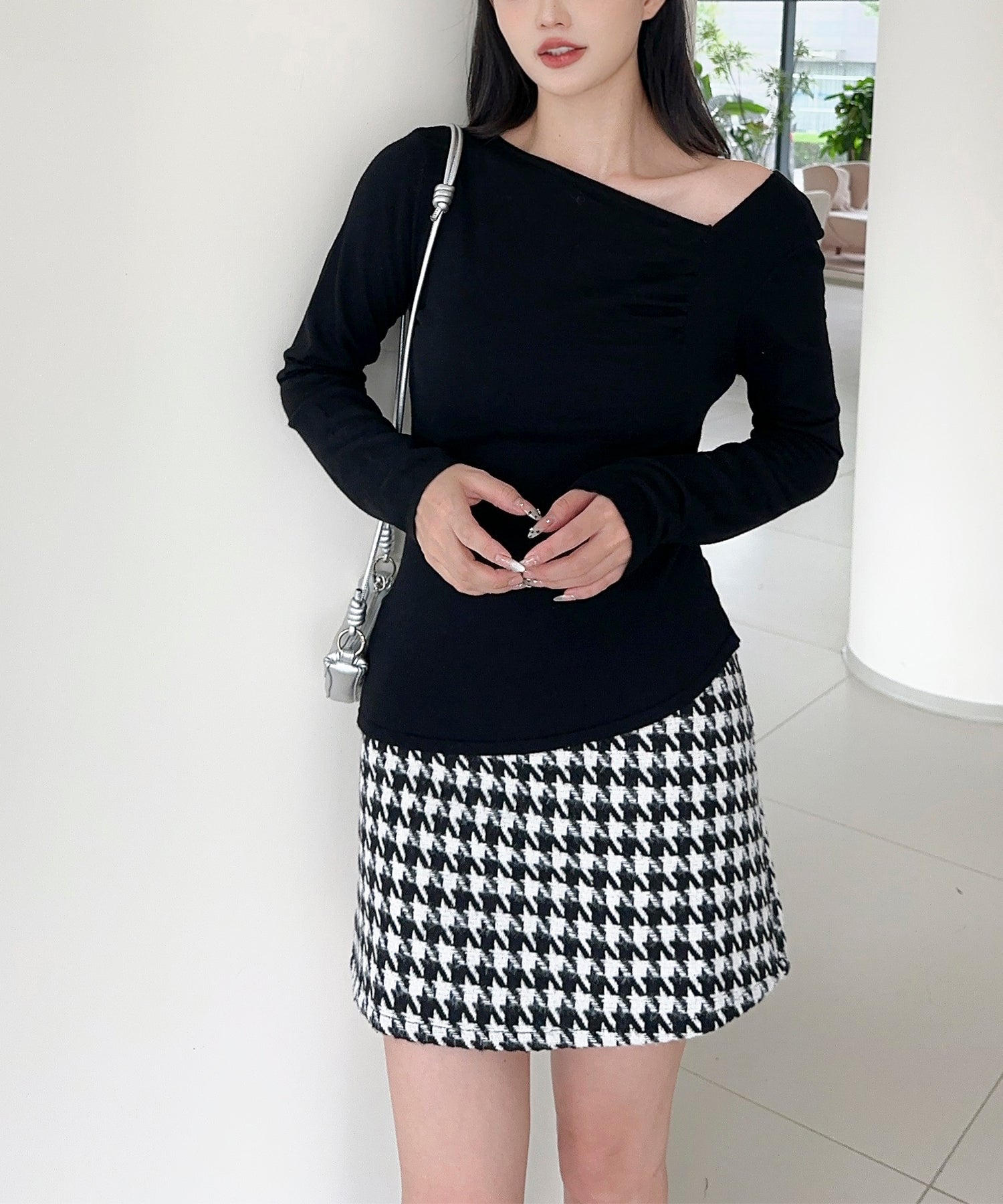 アシンメトリーデザインのニットトップス。大人の抜け感と遊び心をプラスします。