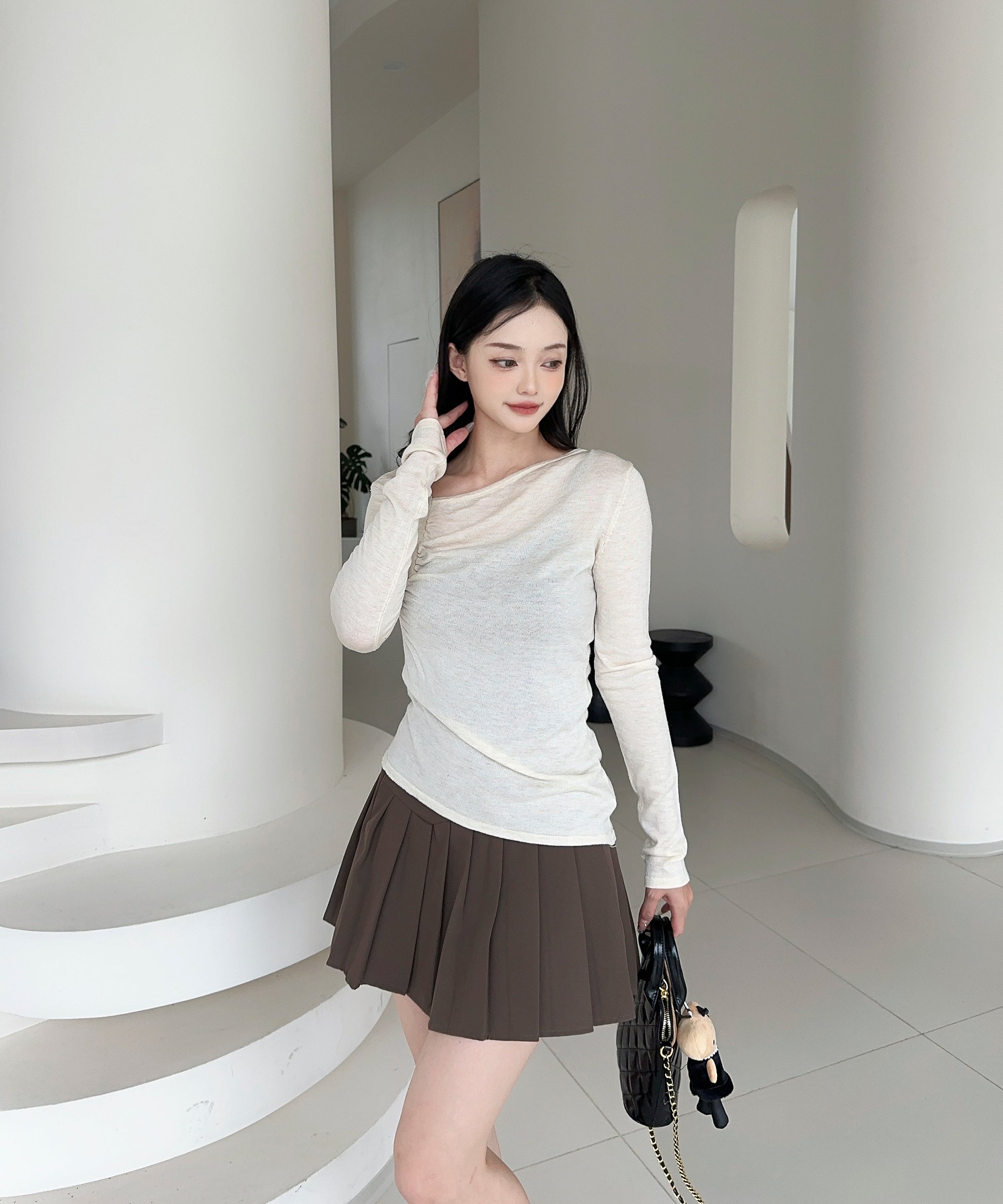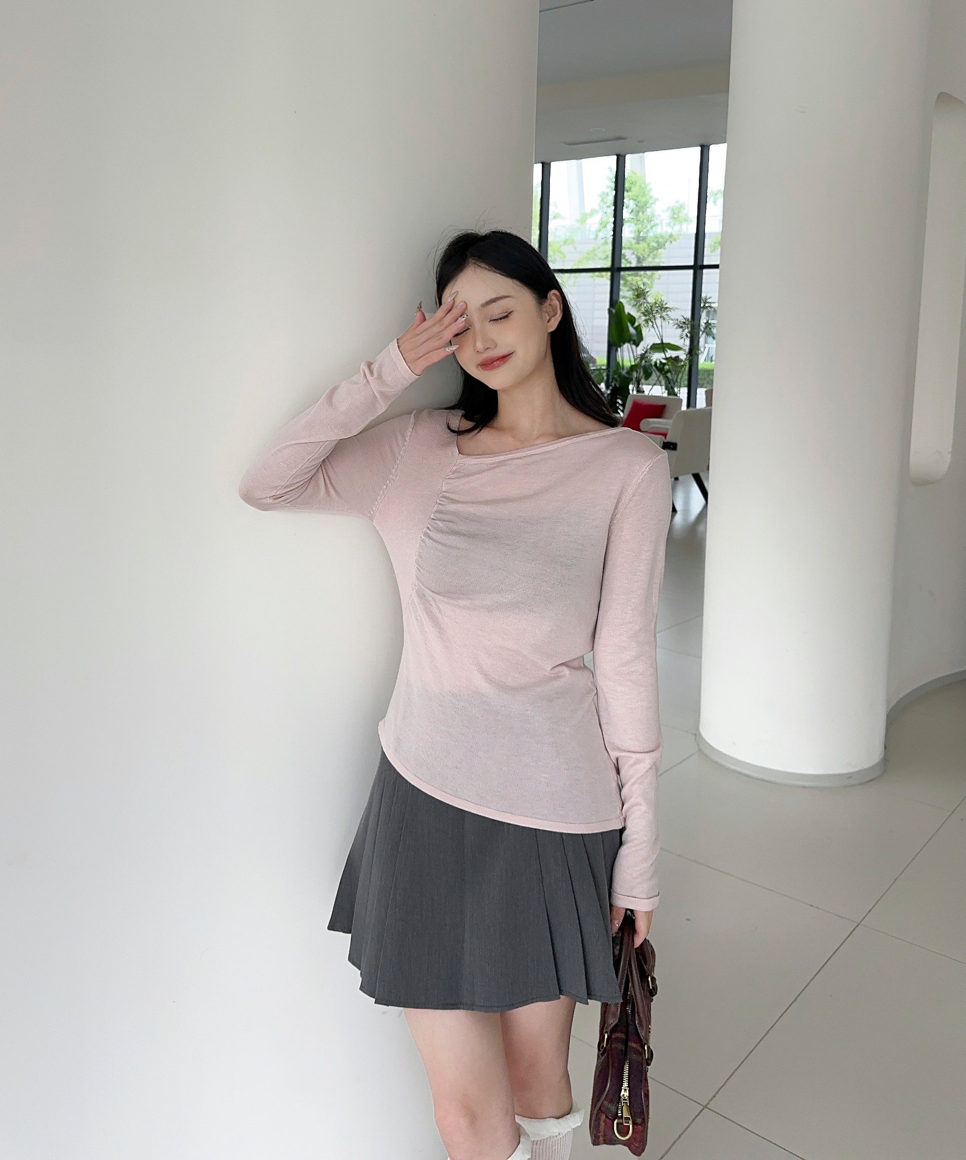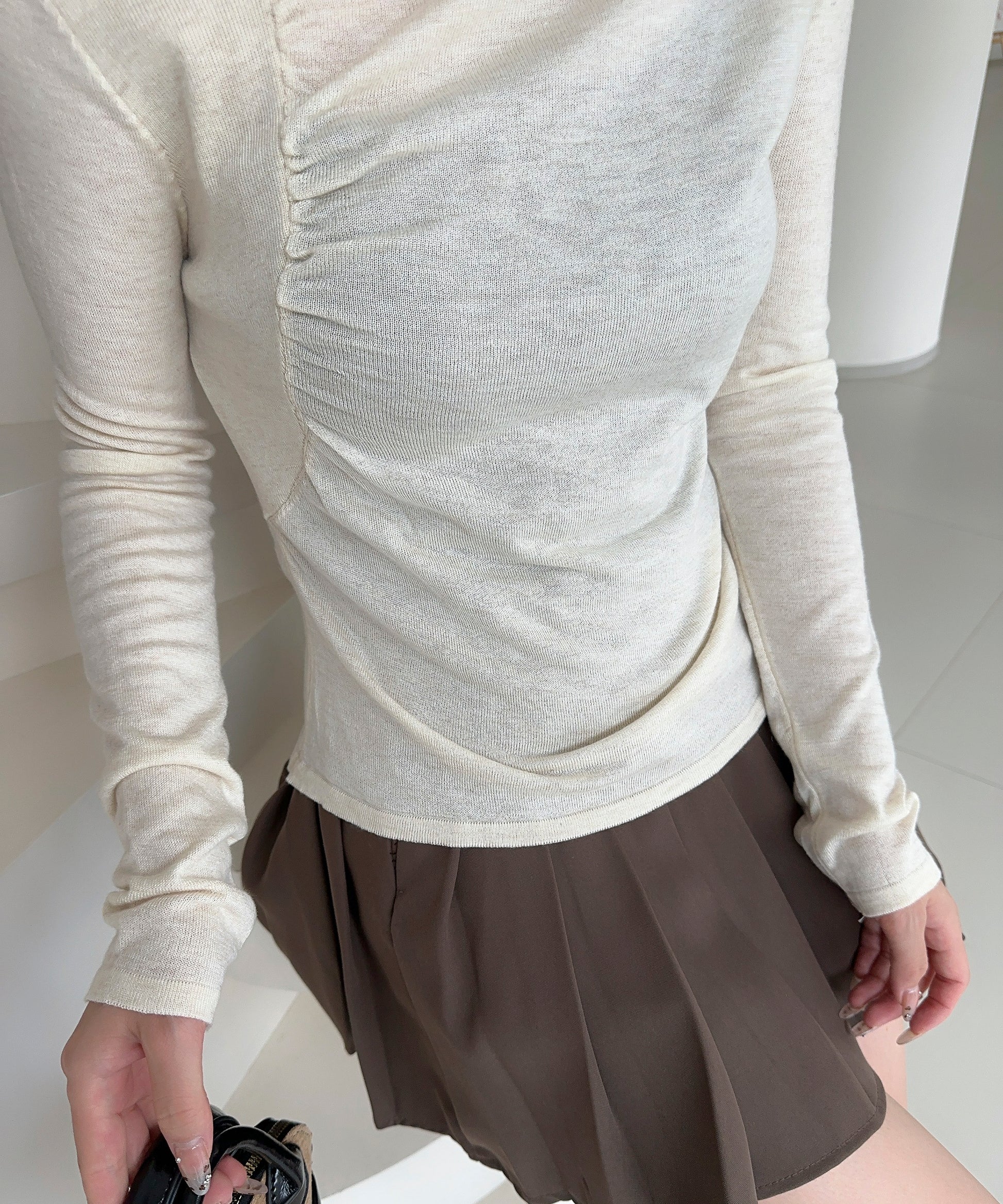 胸元の曲線的なドレープラインが存在感を放つトップス。