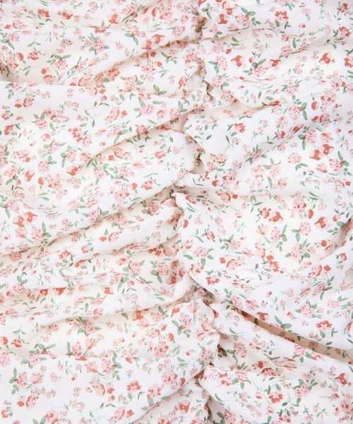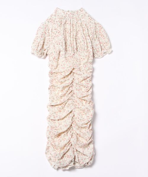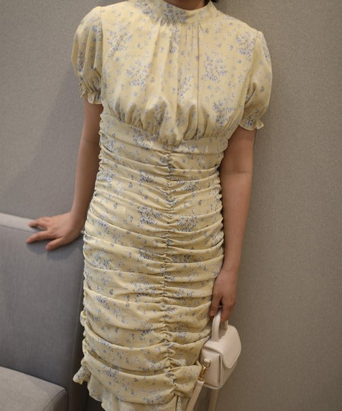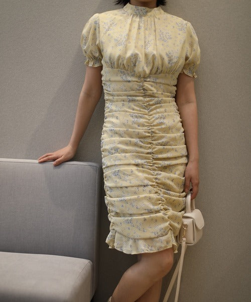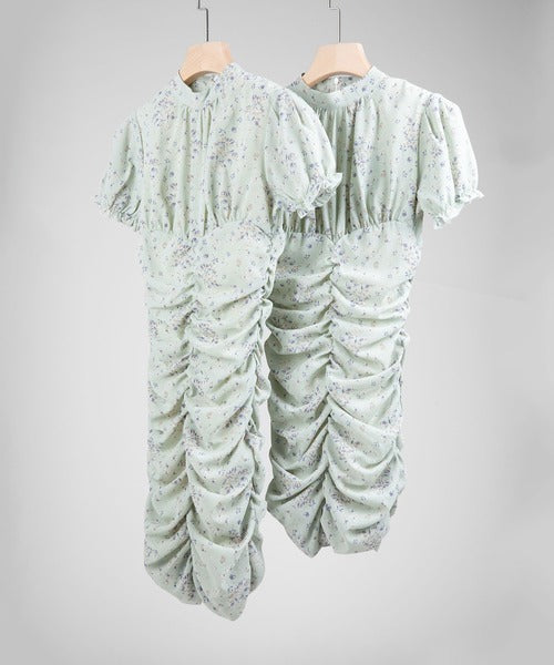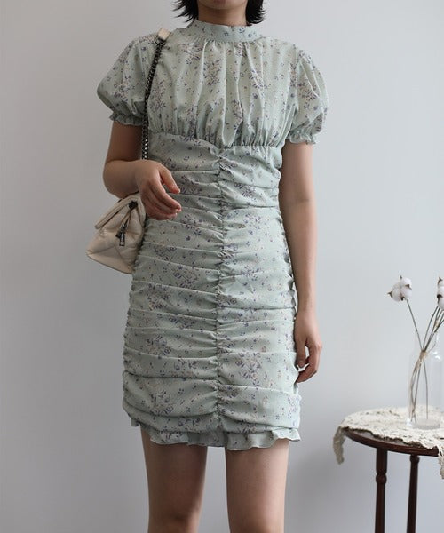 【Jasmine】スタンドカラー半袖パワショル花柄半袖ワンピース