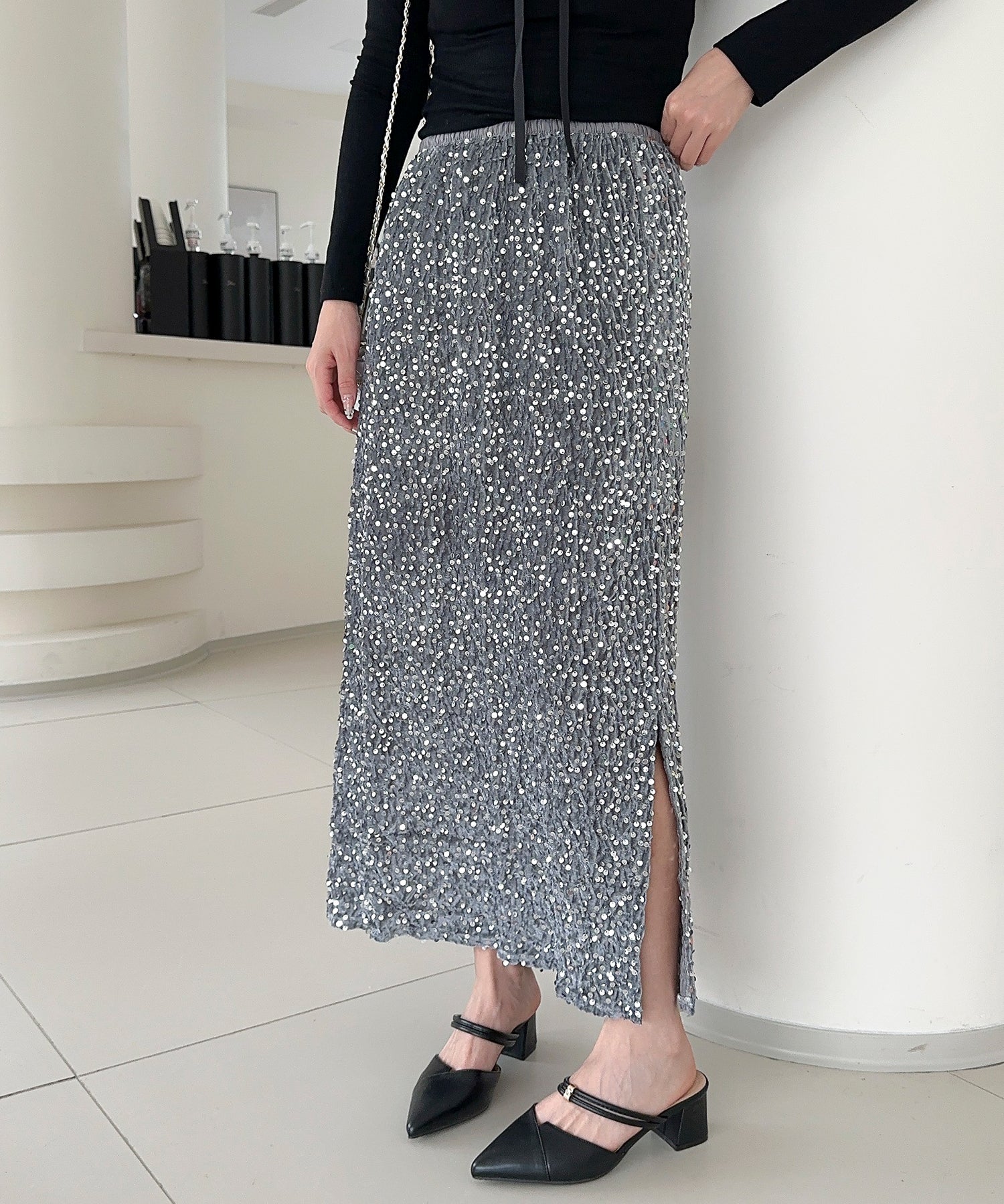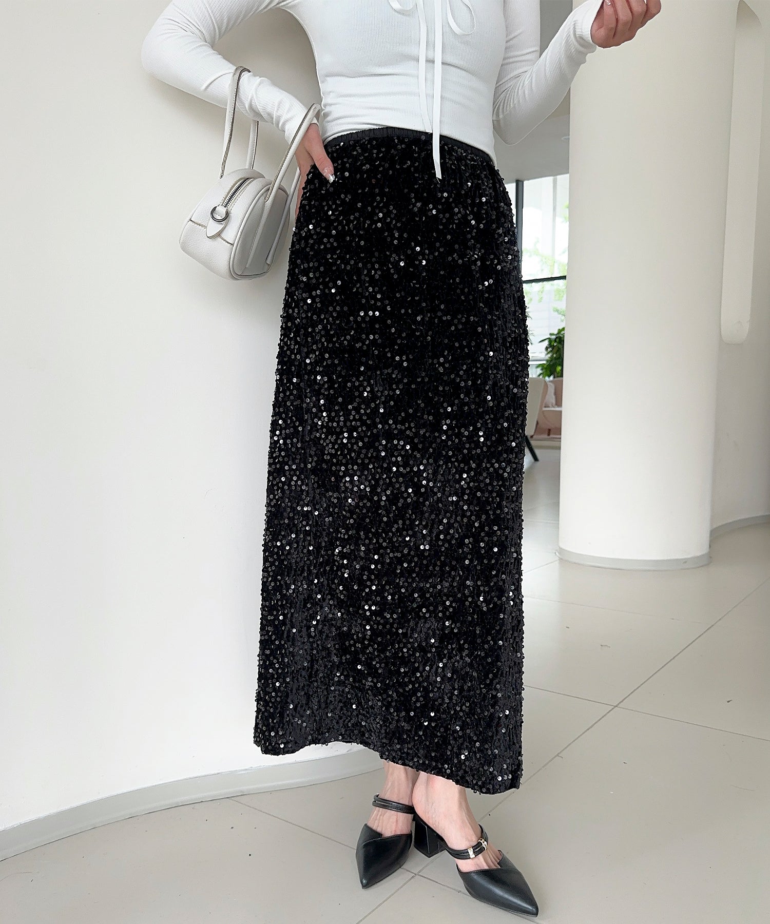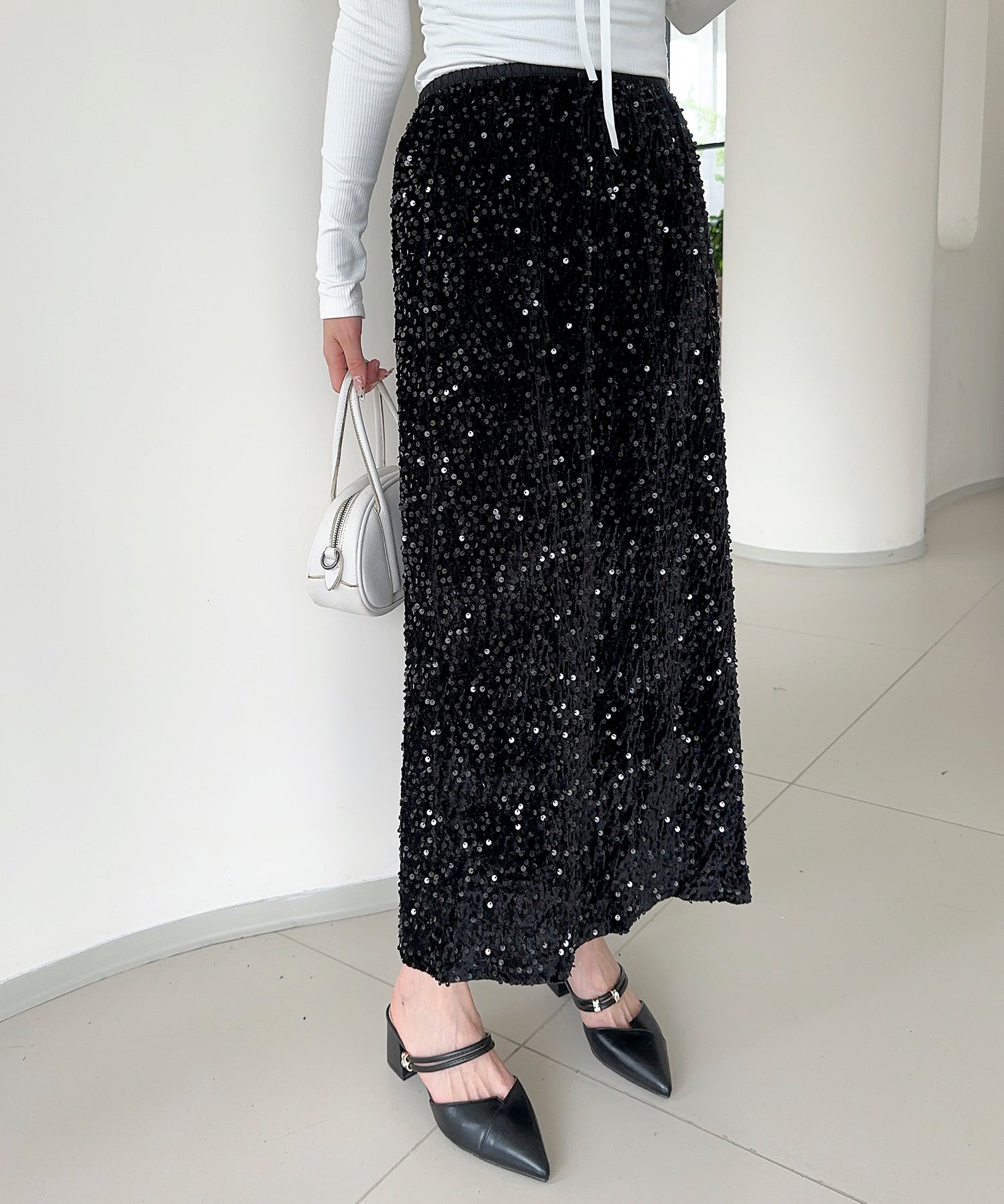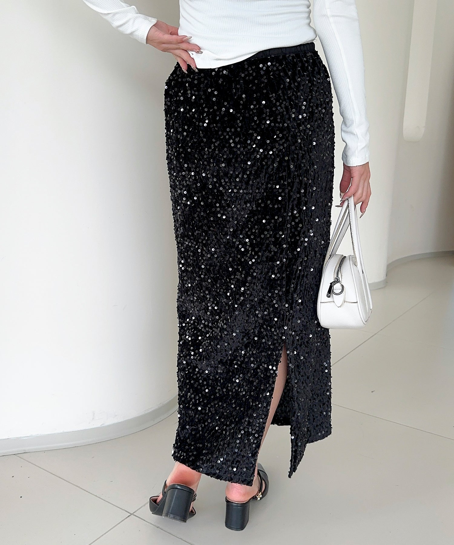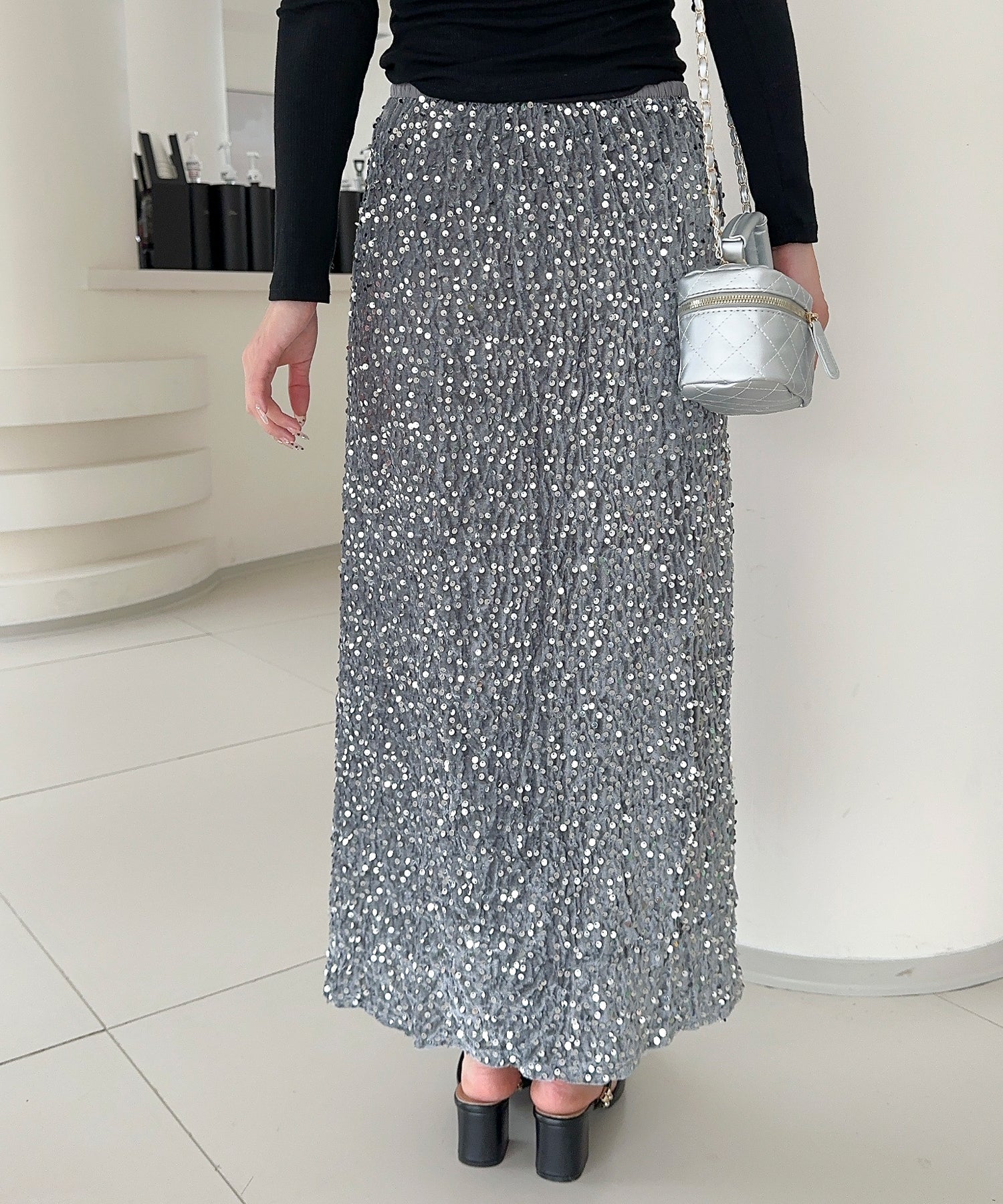柔らかなベロア生地とスパンコールが特徴のスカート。