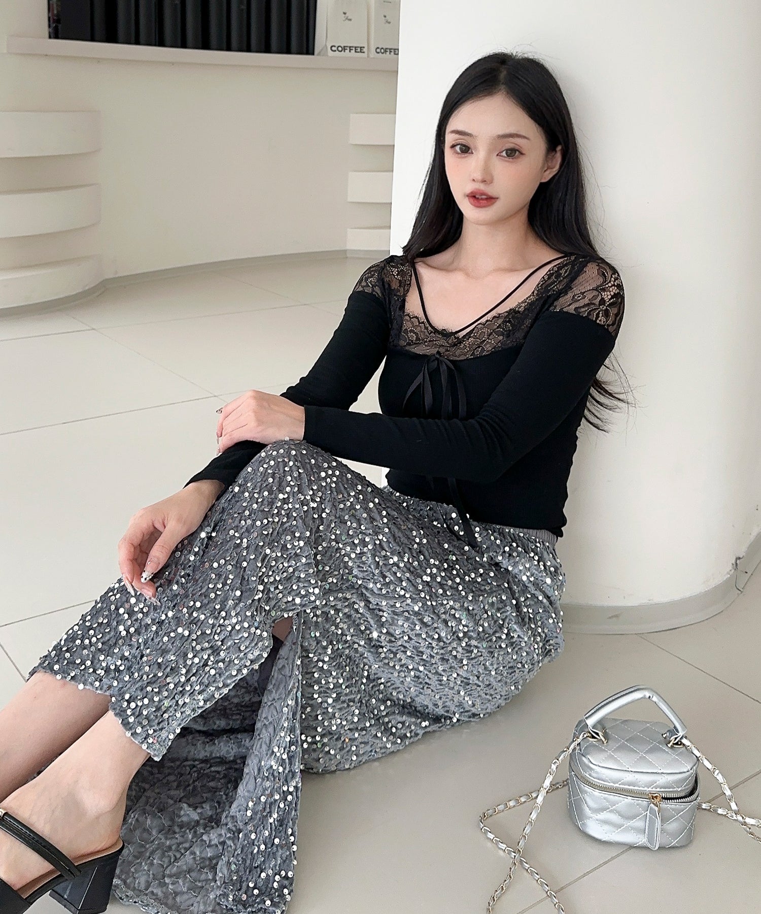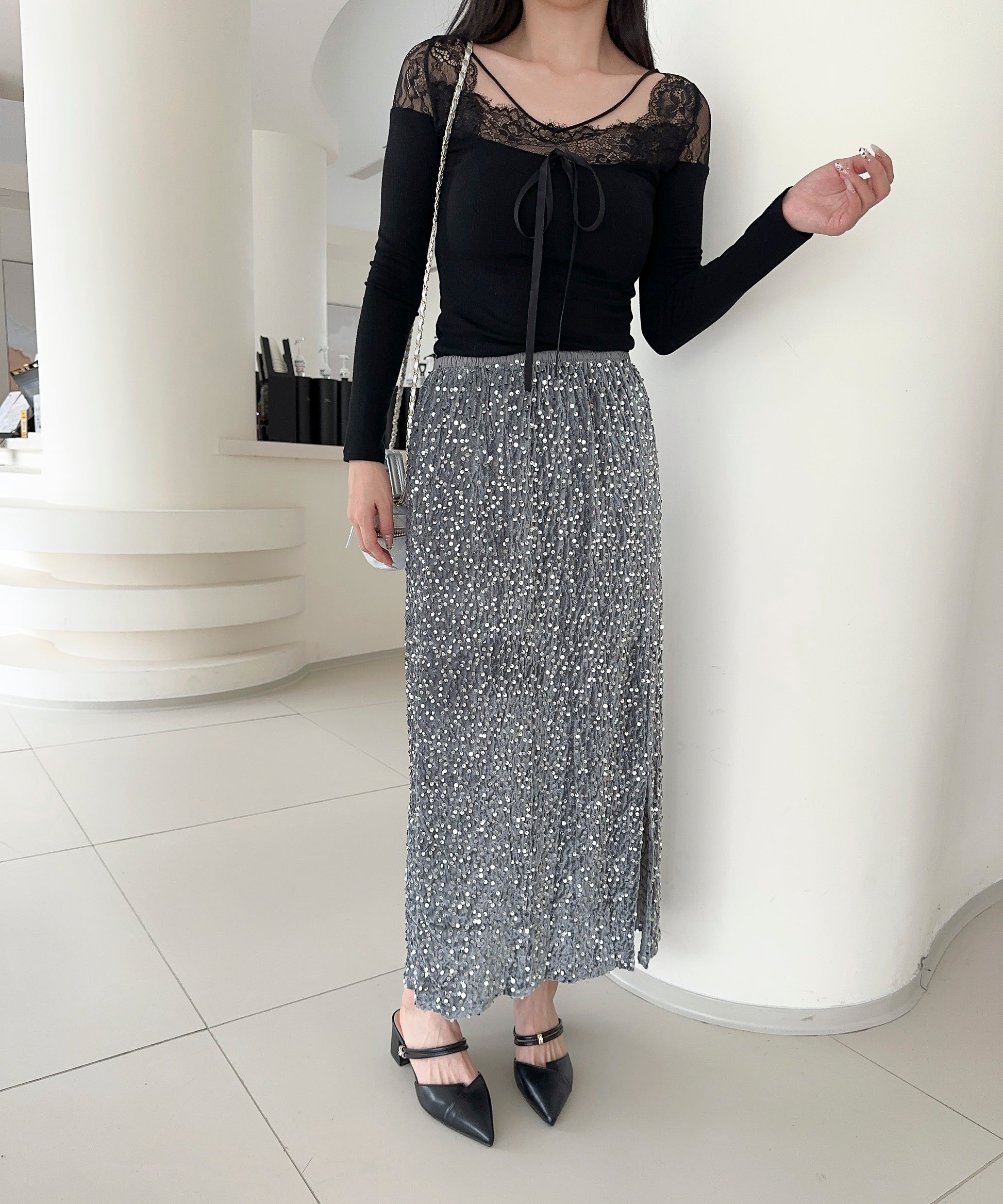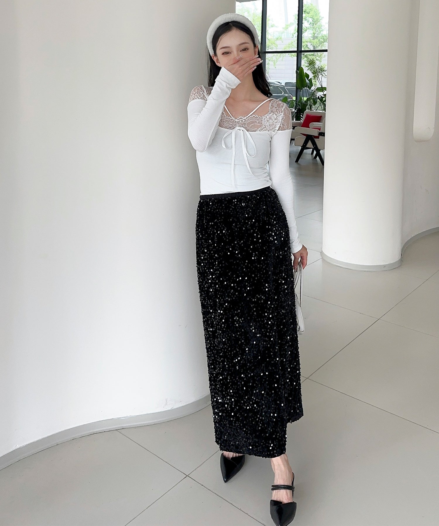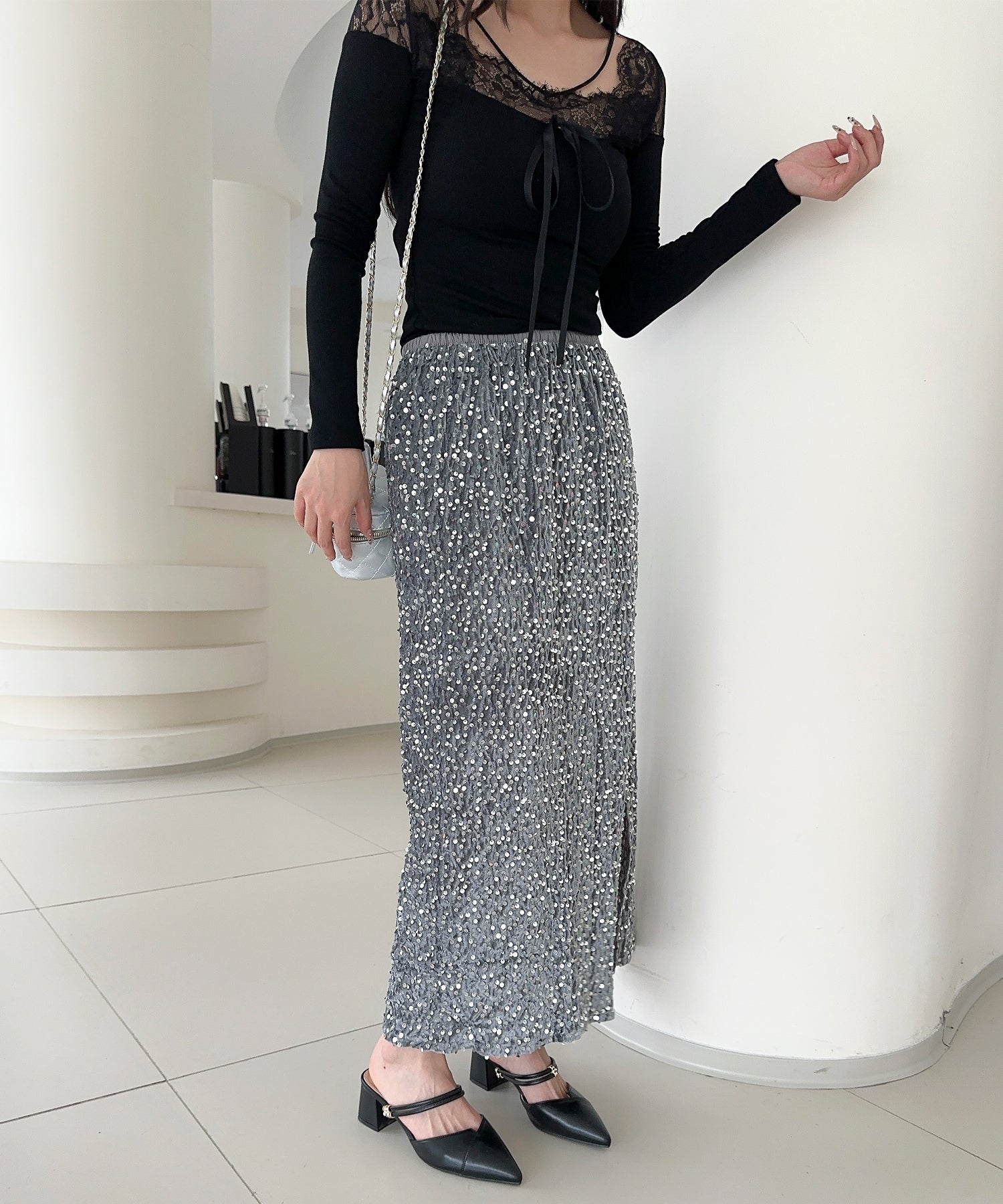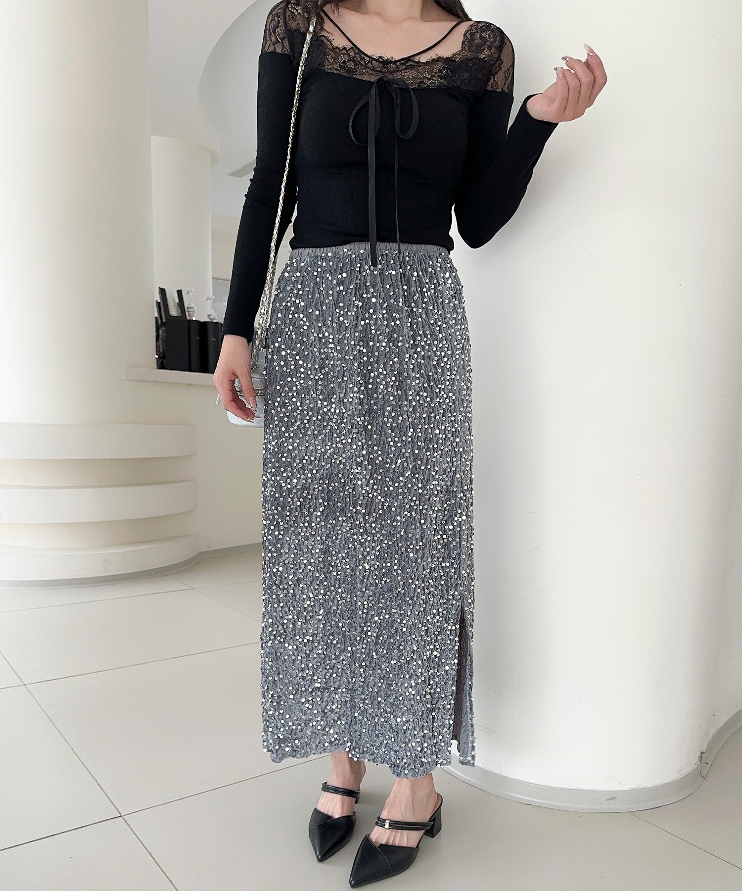 柔らかなベロア生地とスパンコールが特徴のスカート。