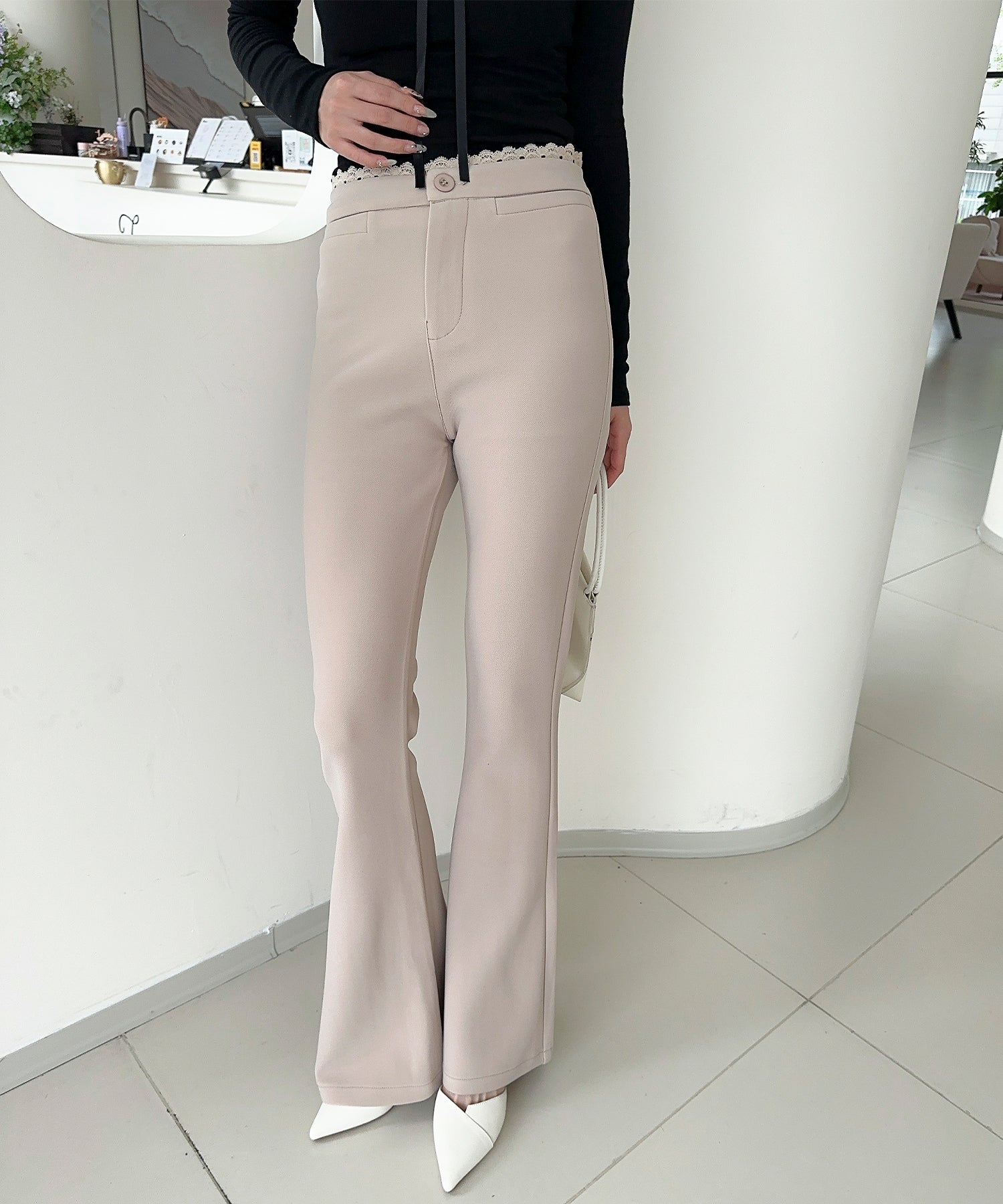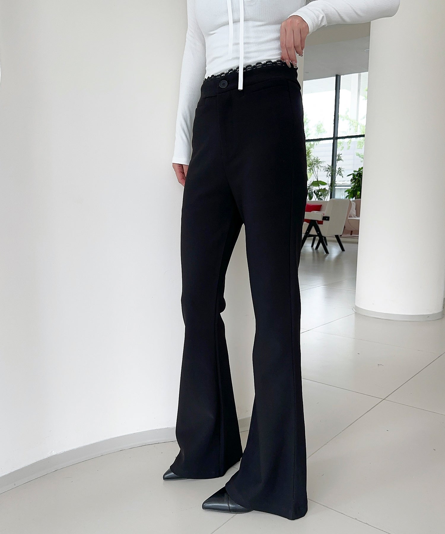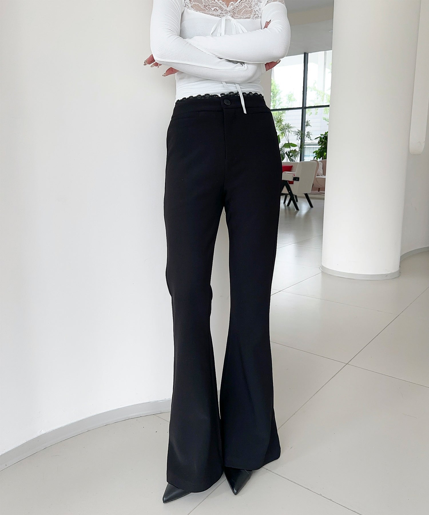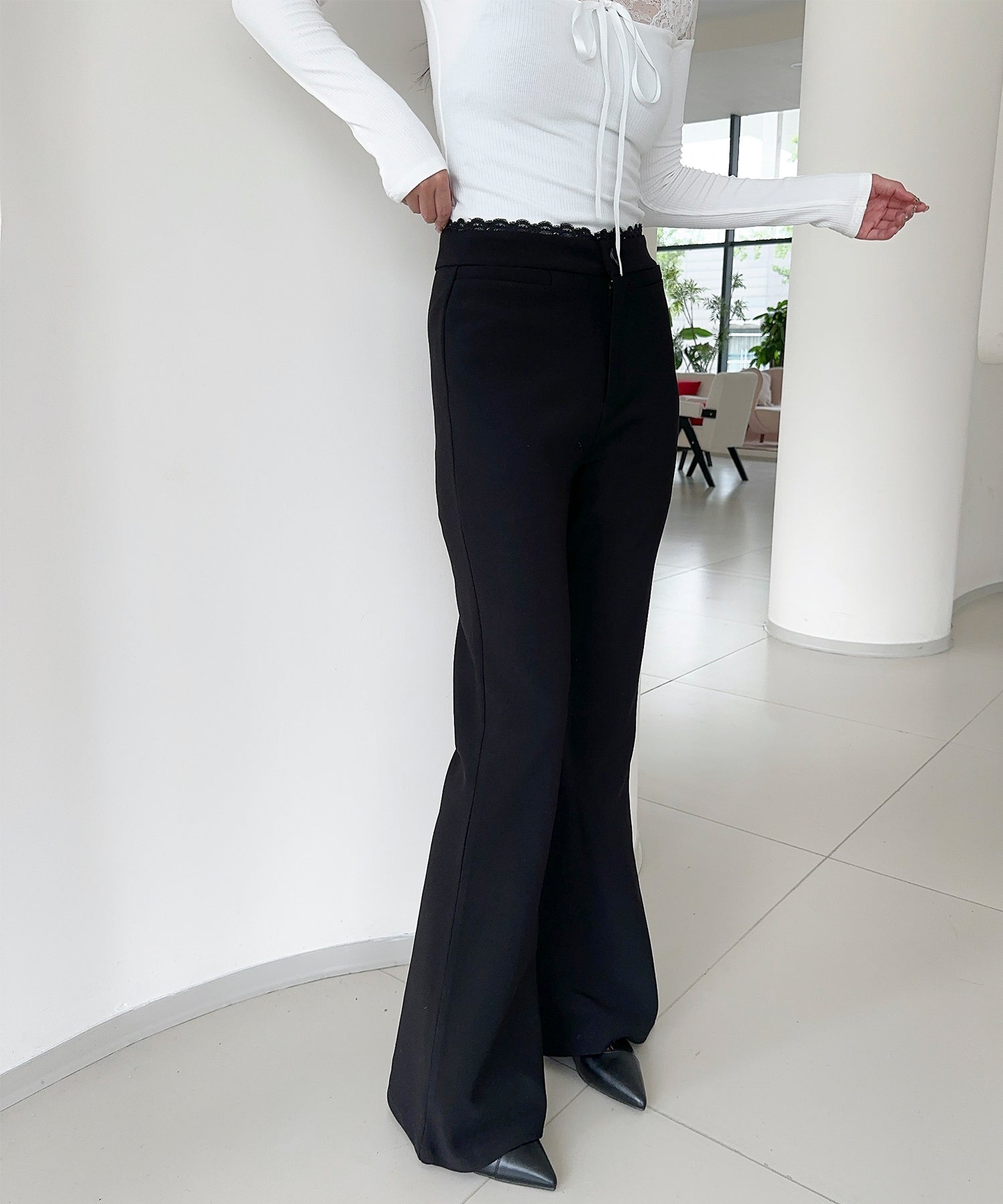 ウエストに繊細なレースラインを加えたフレアパンツ。