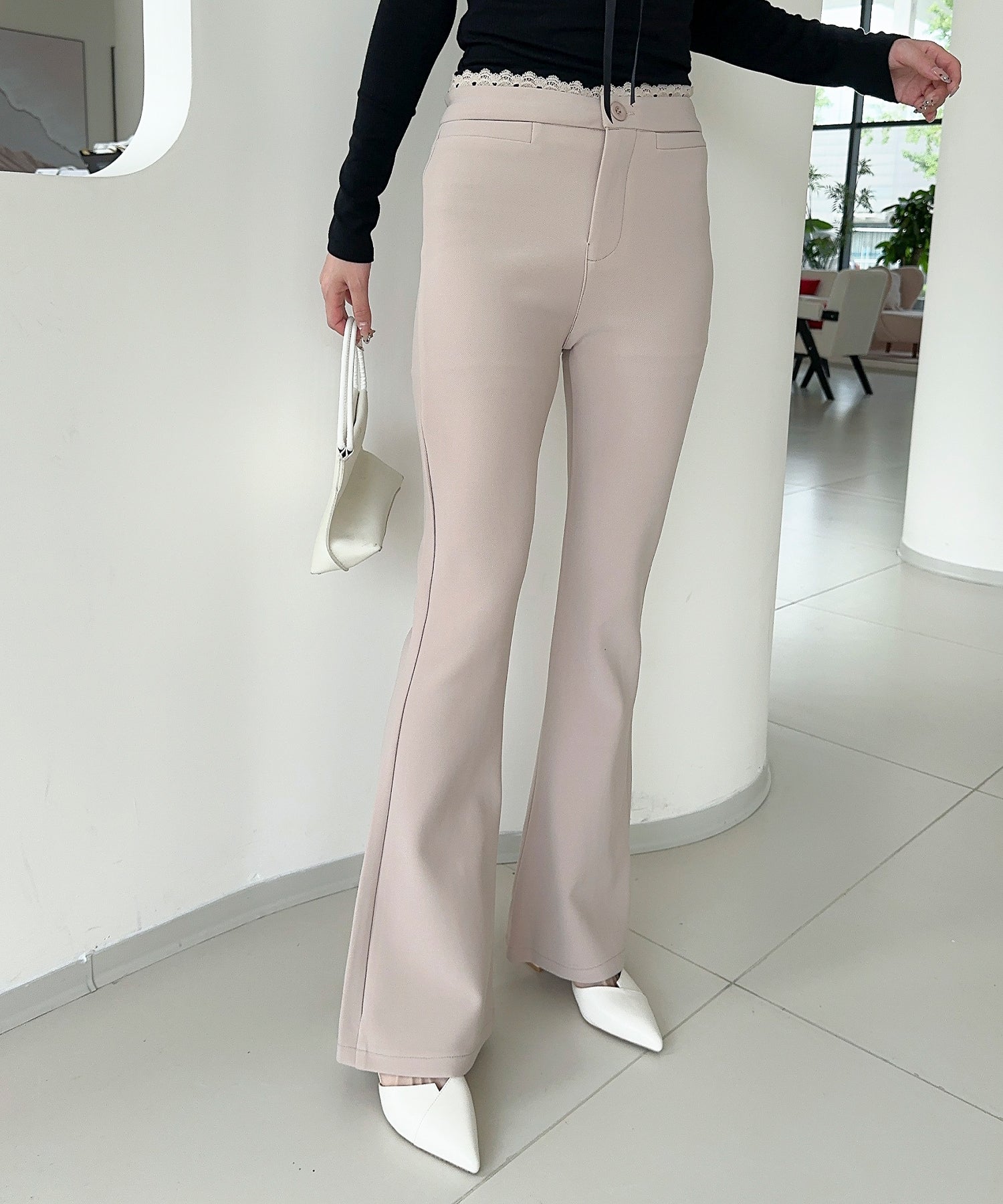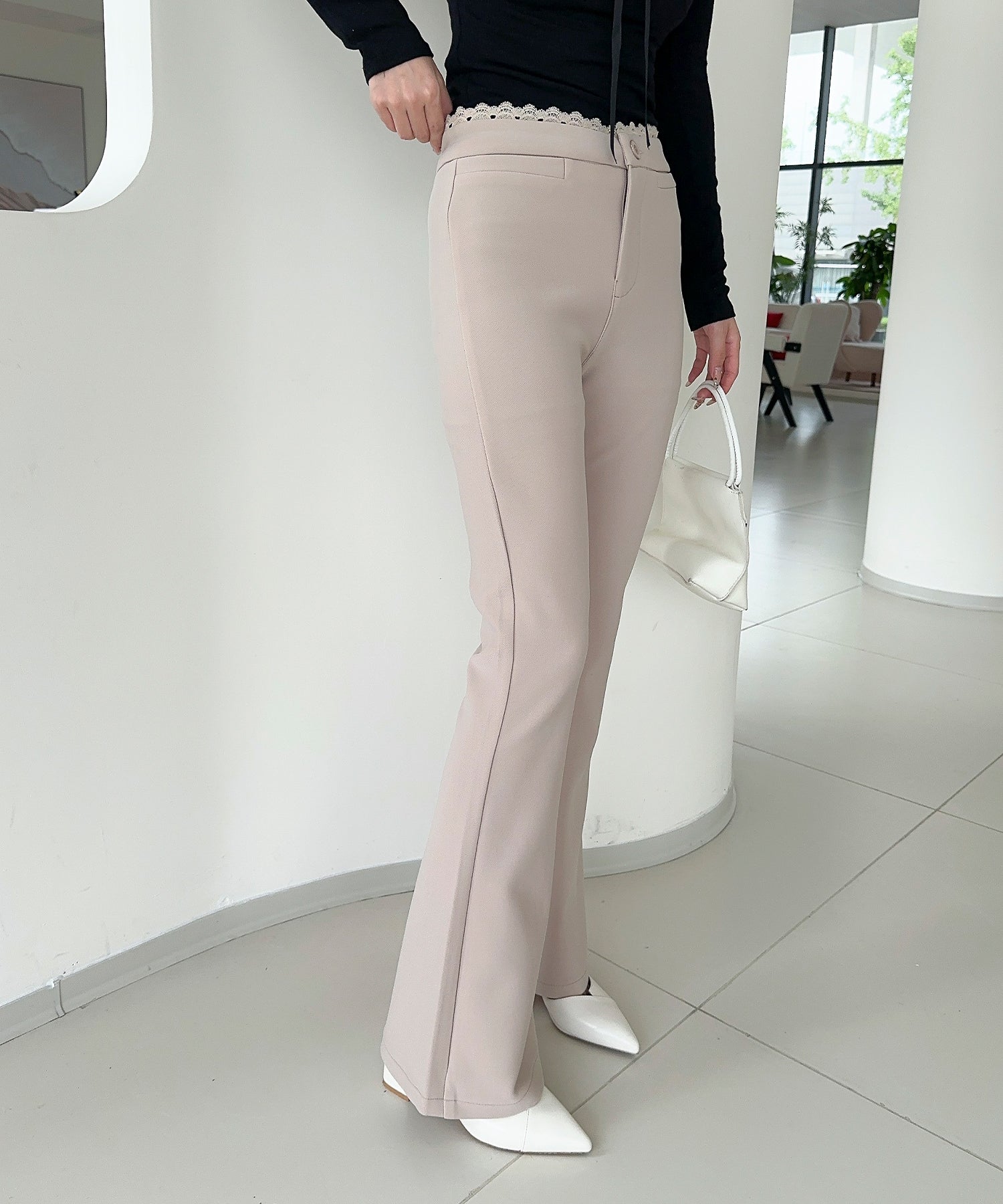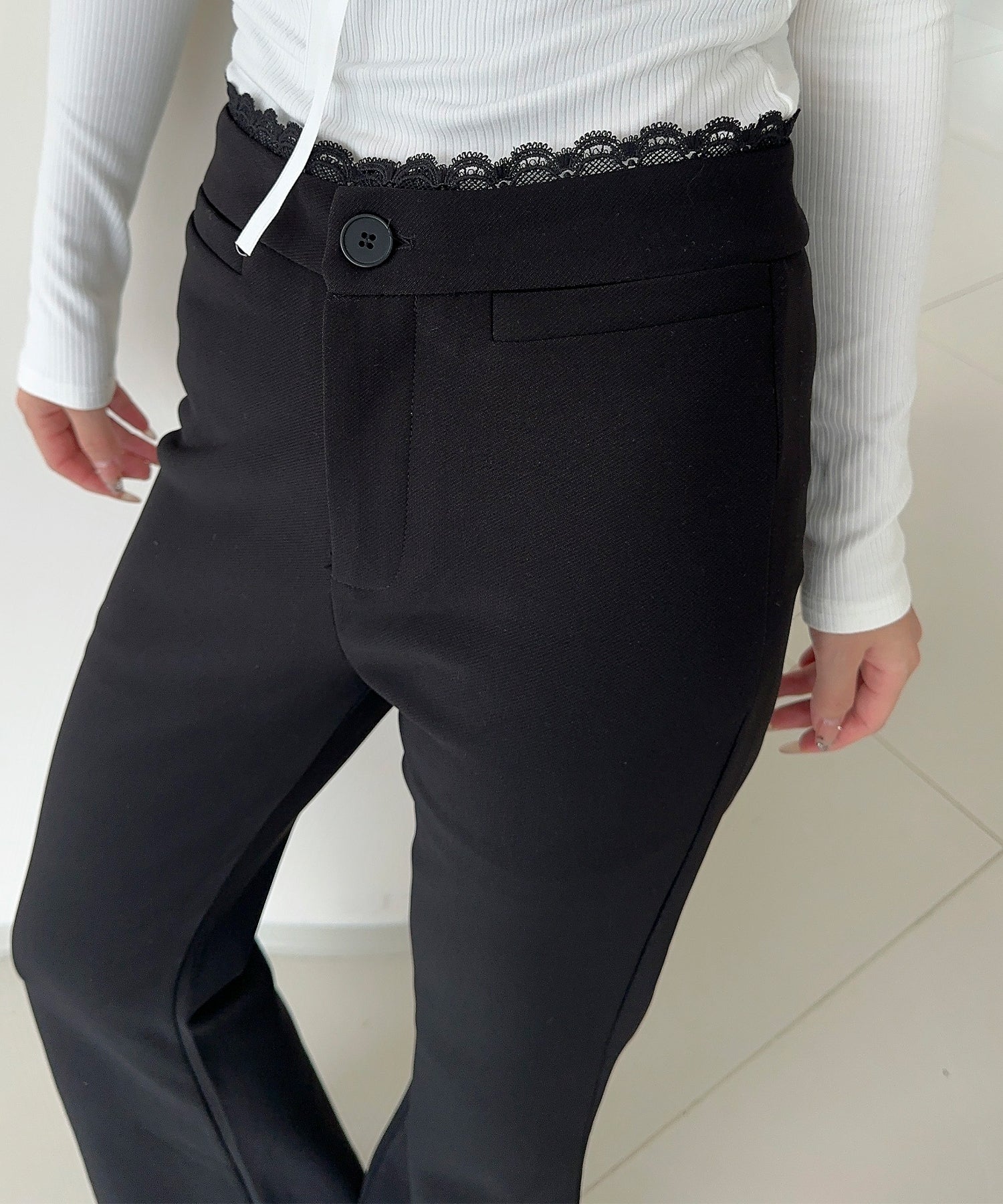 ウエストに繊細なレースラインを加えたフレアパンツ。
