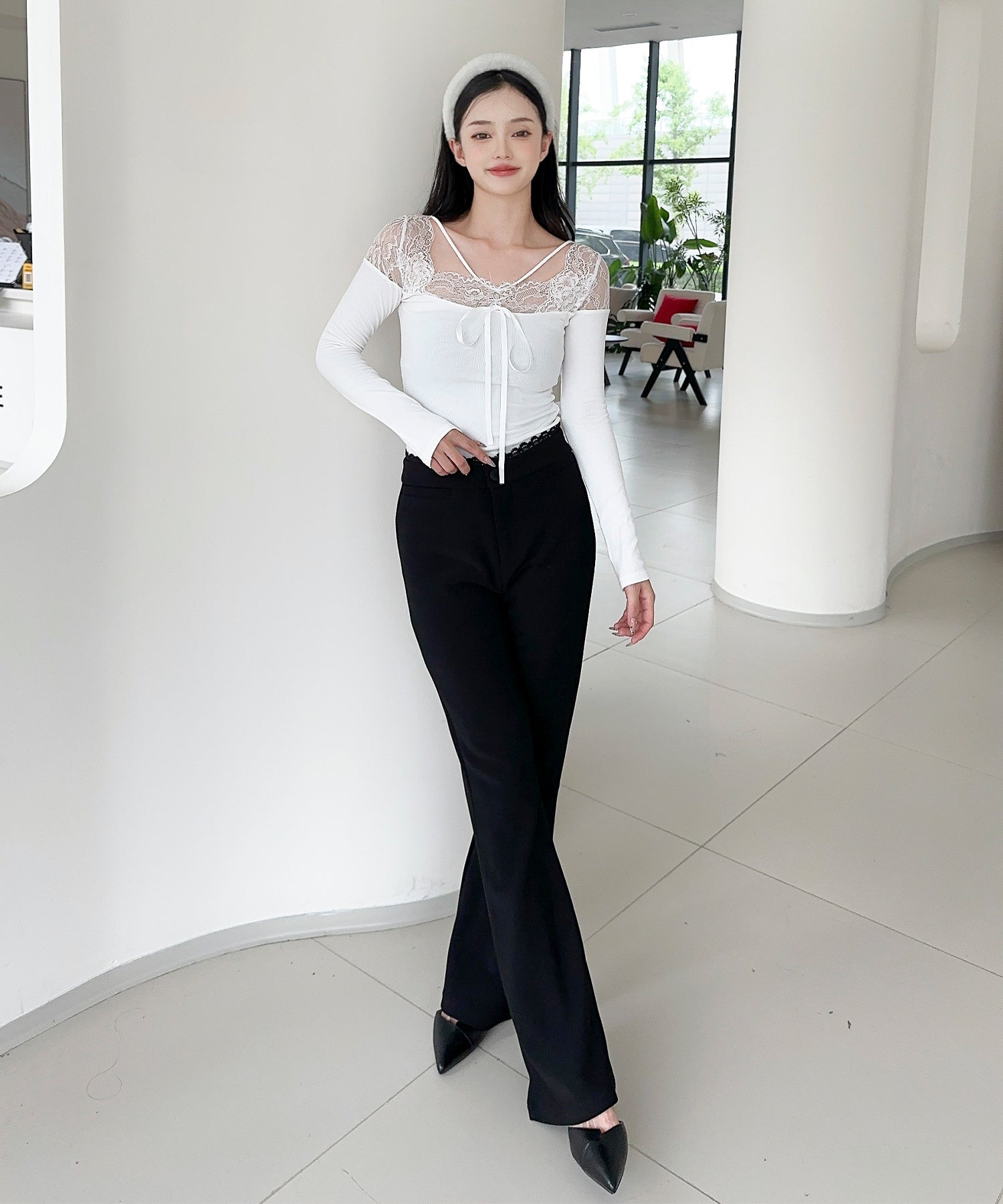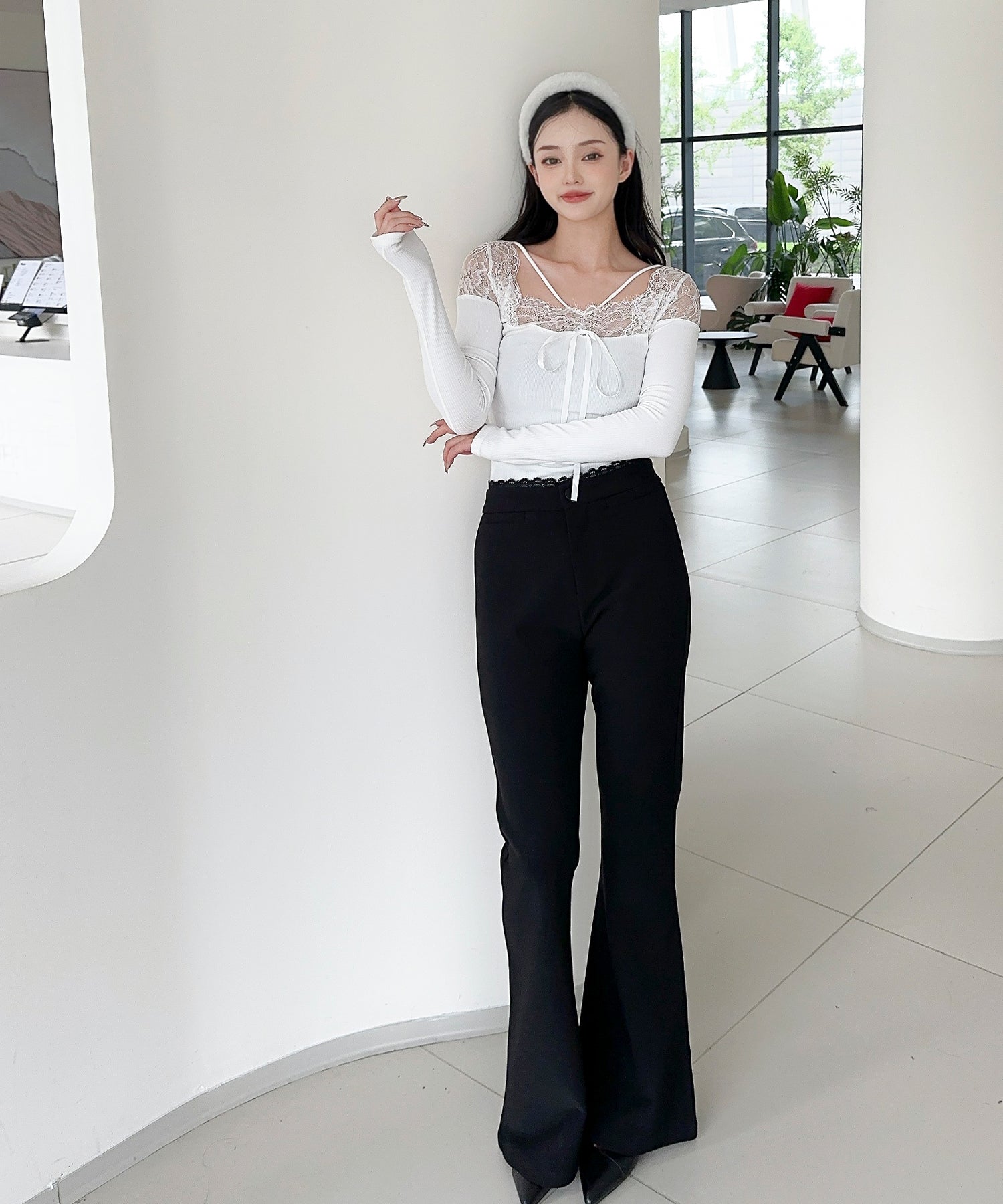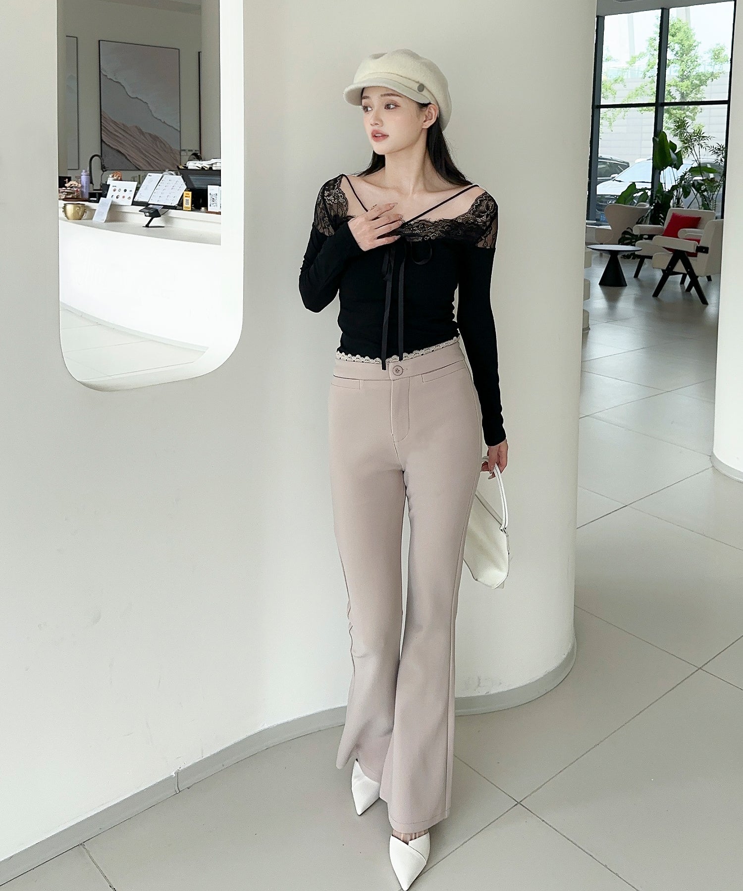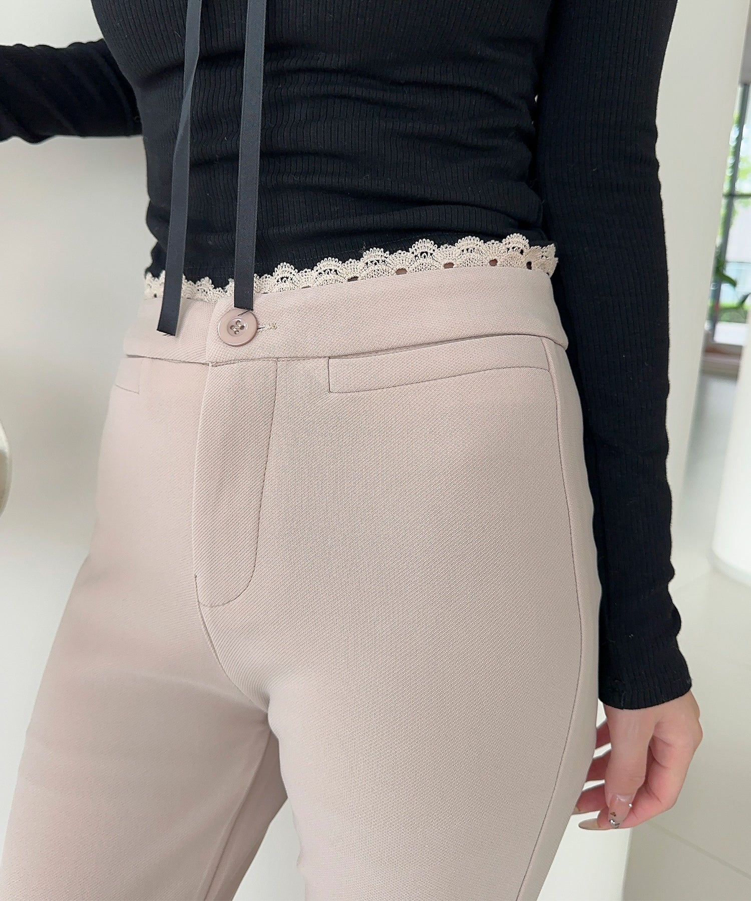 ウエストに繊細なレースラインを加えたフレアパンツ。