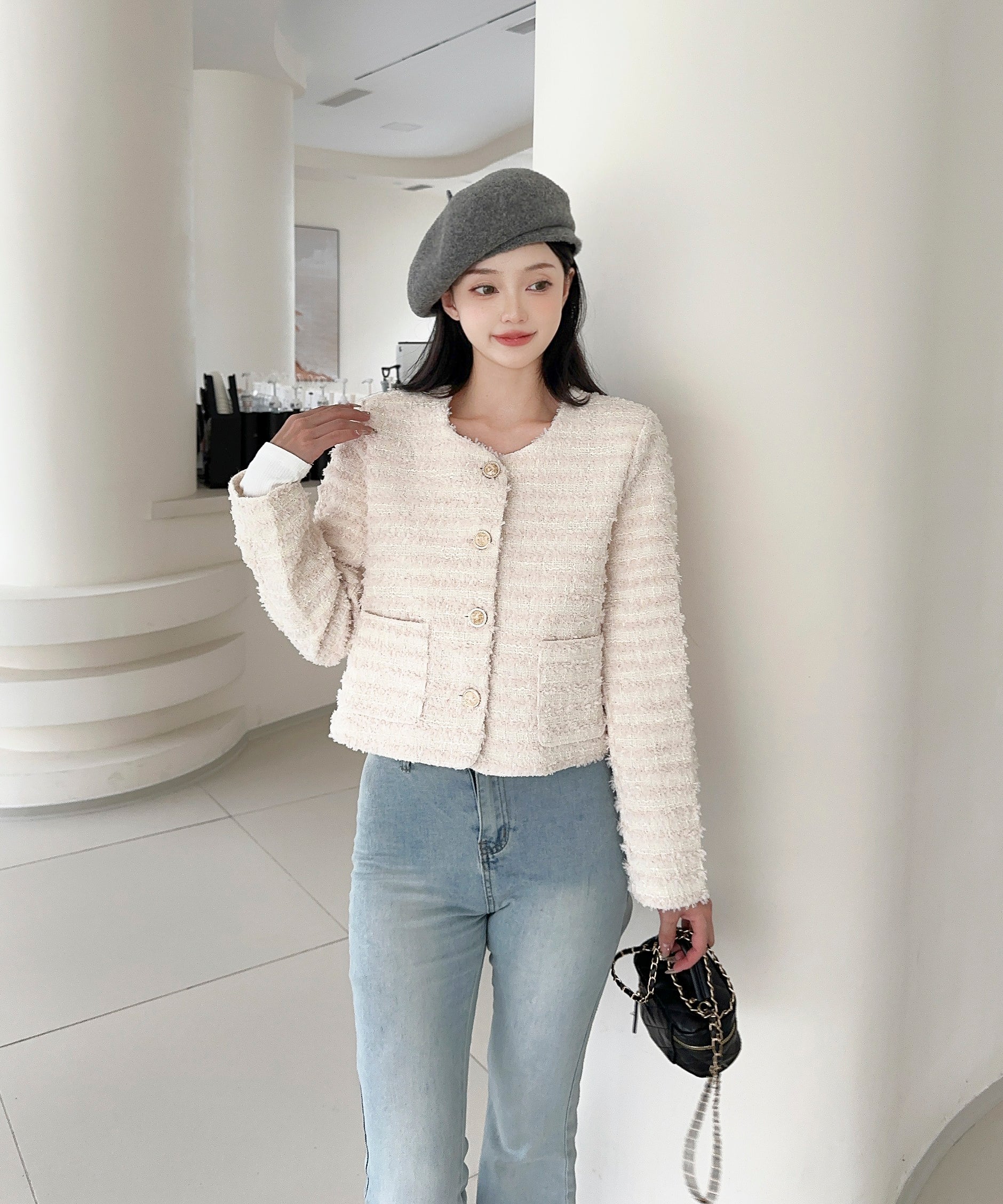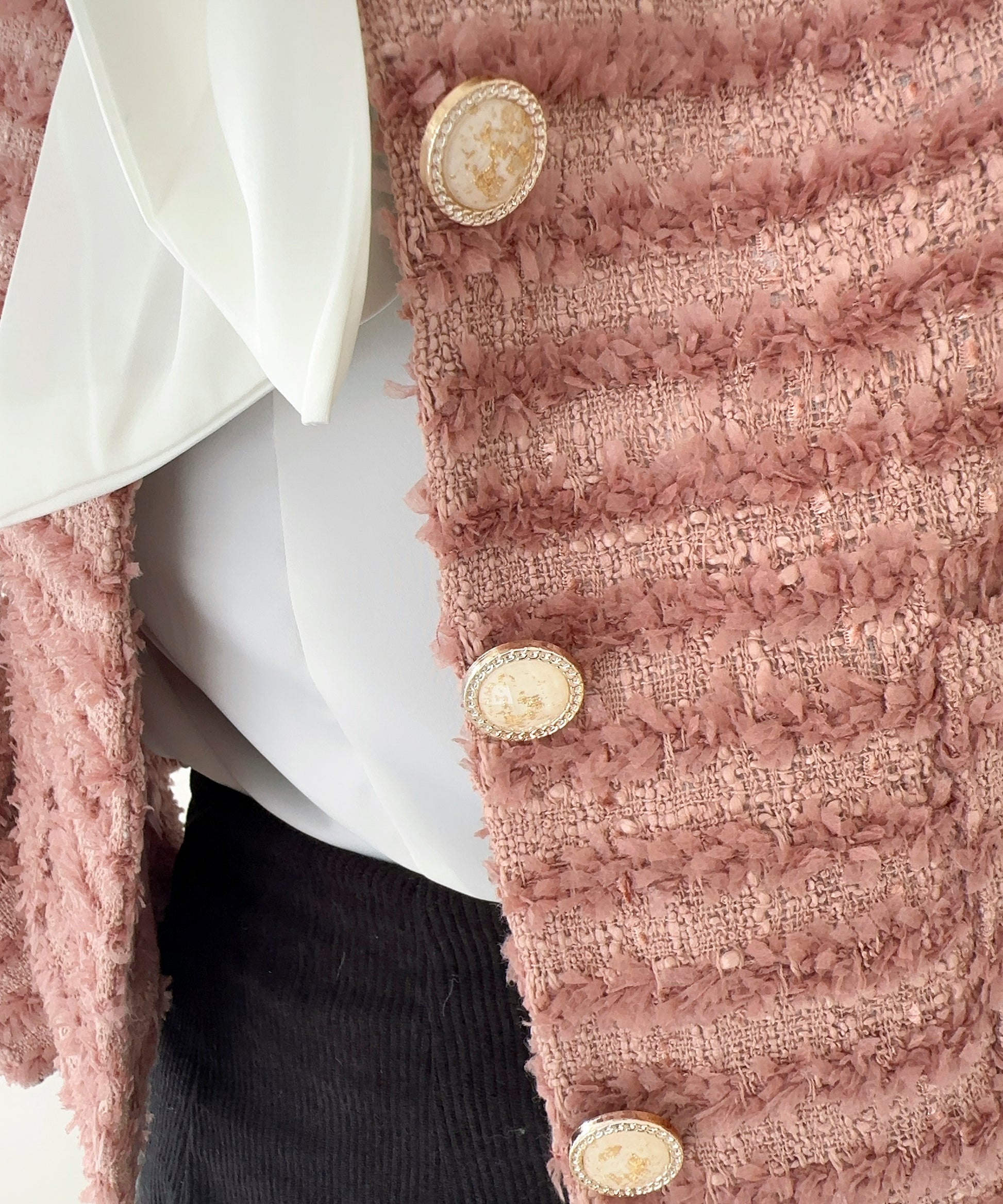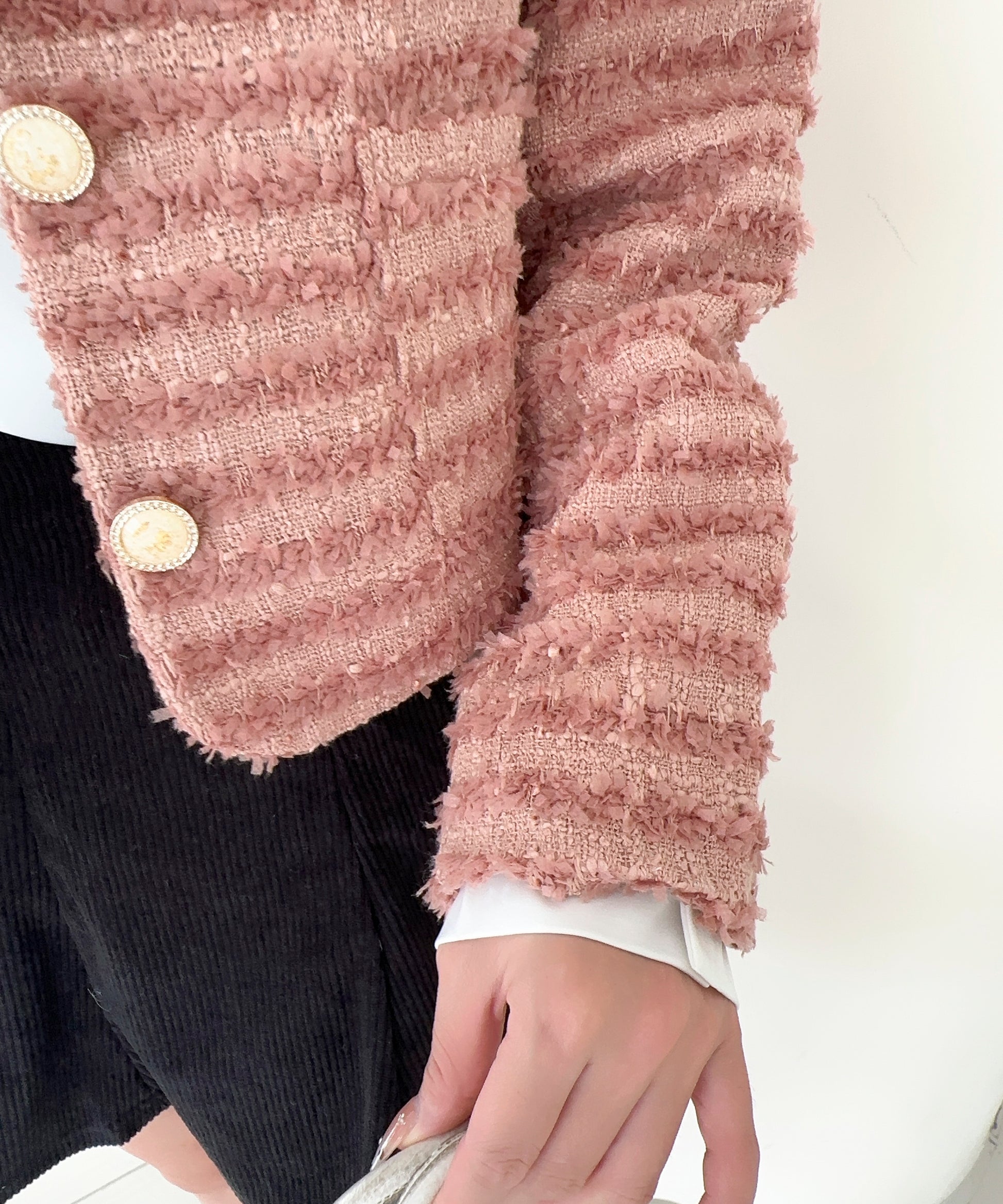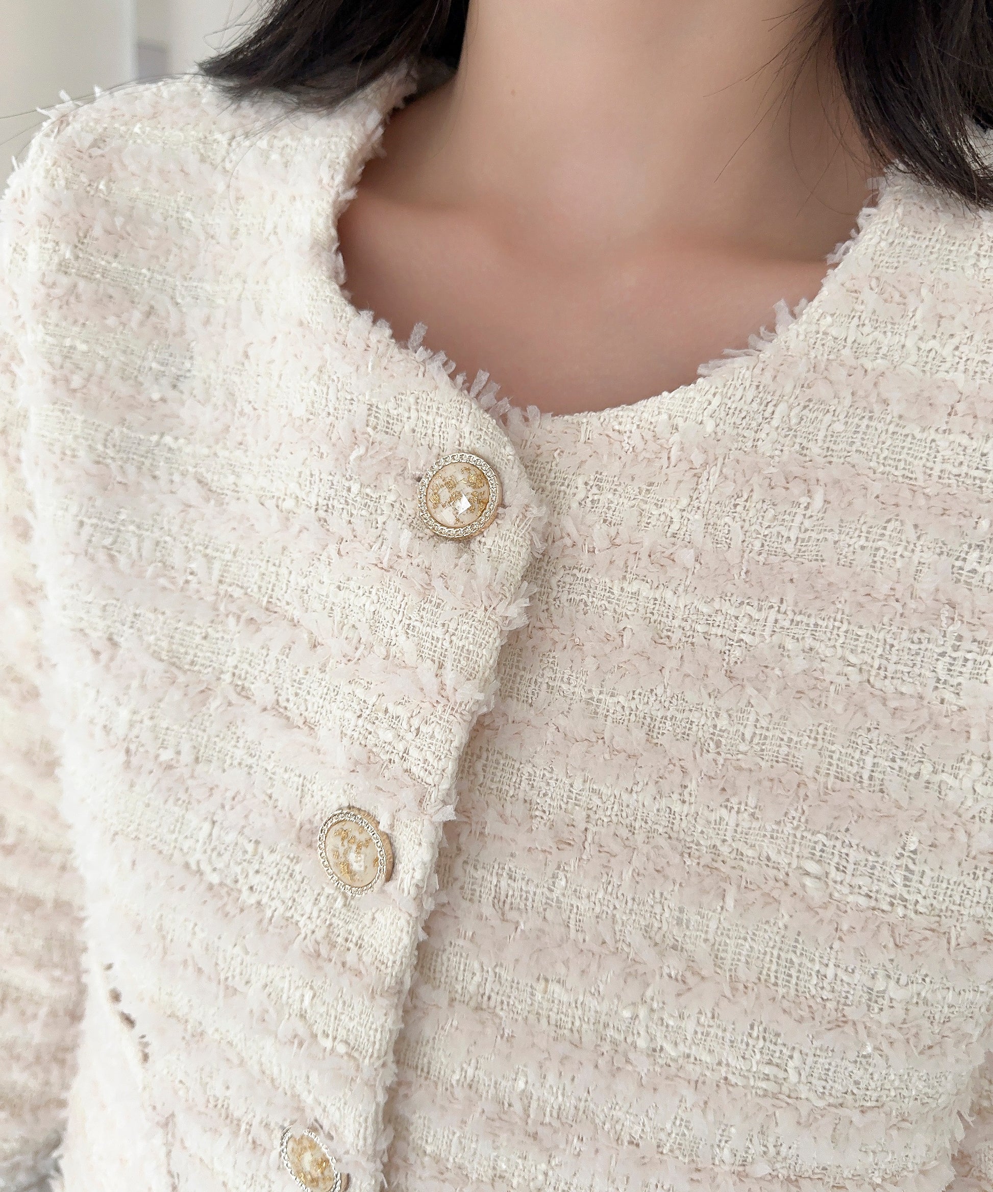 クラシカルなツイード素材に、クロップ丈のデザインがトレンドライクなジャケット。