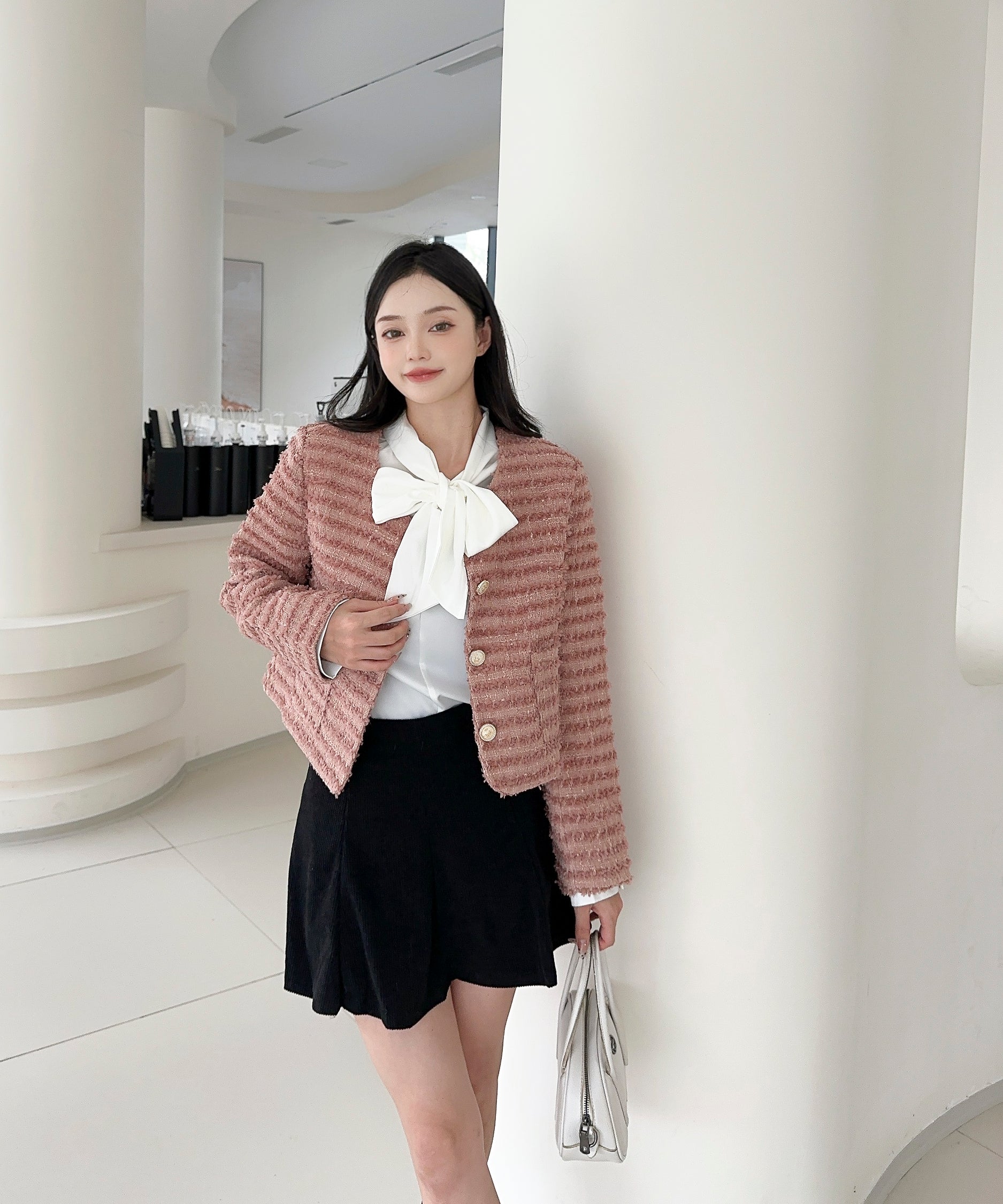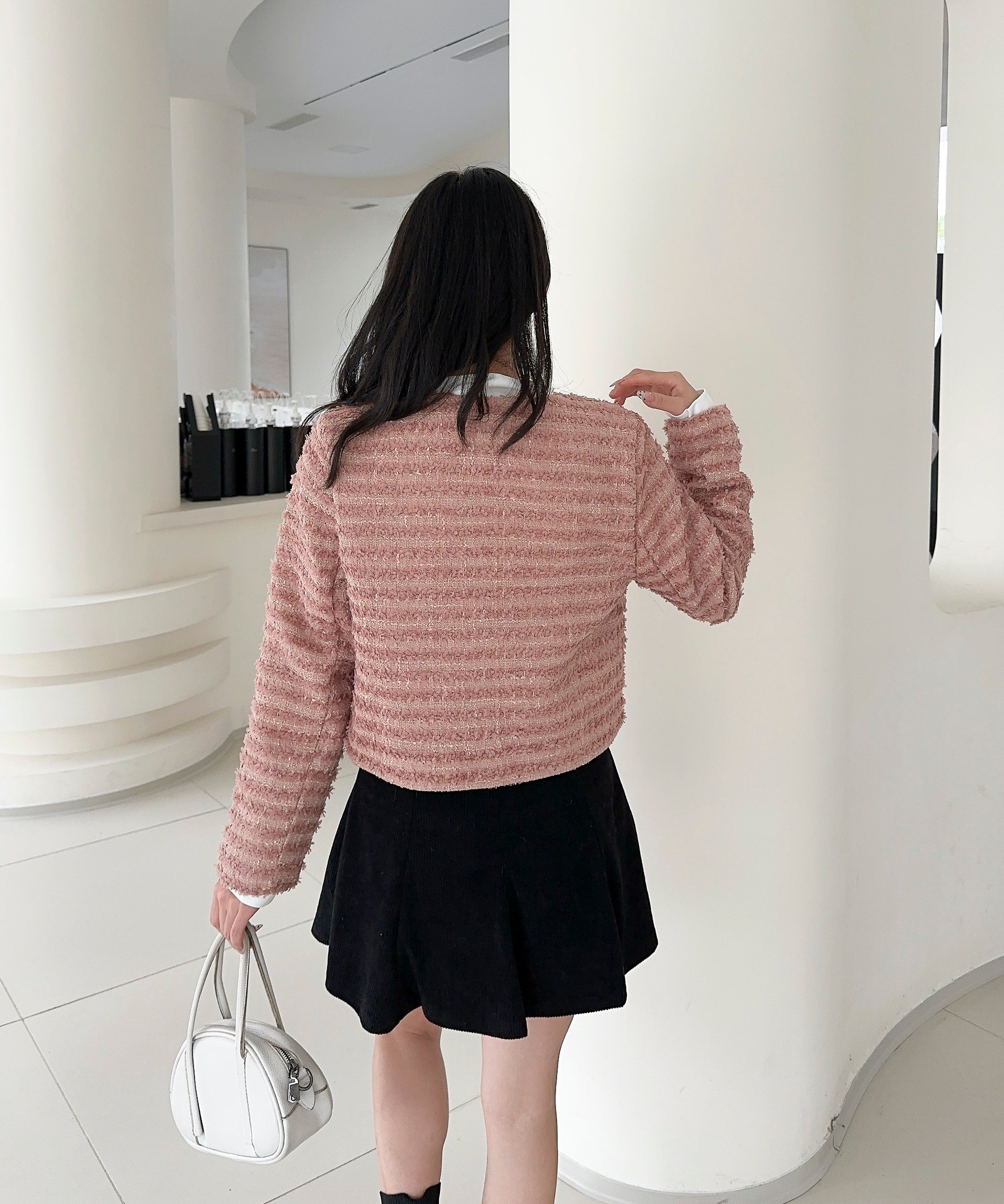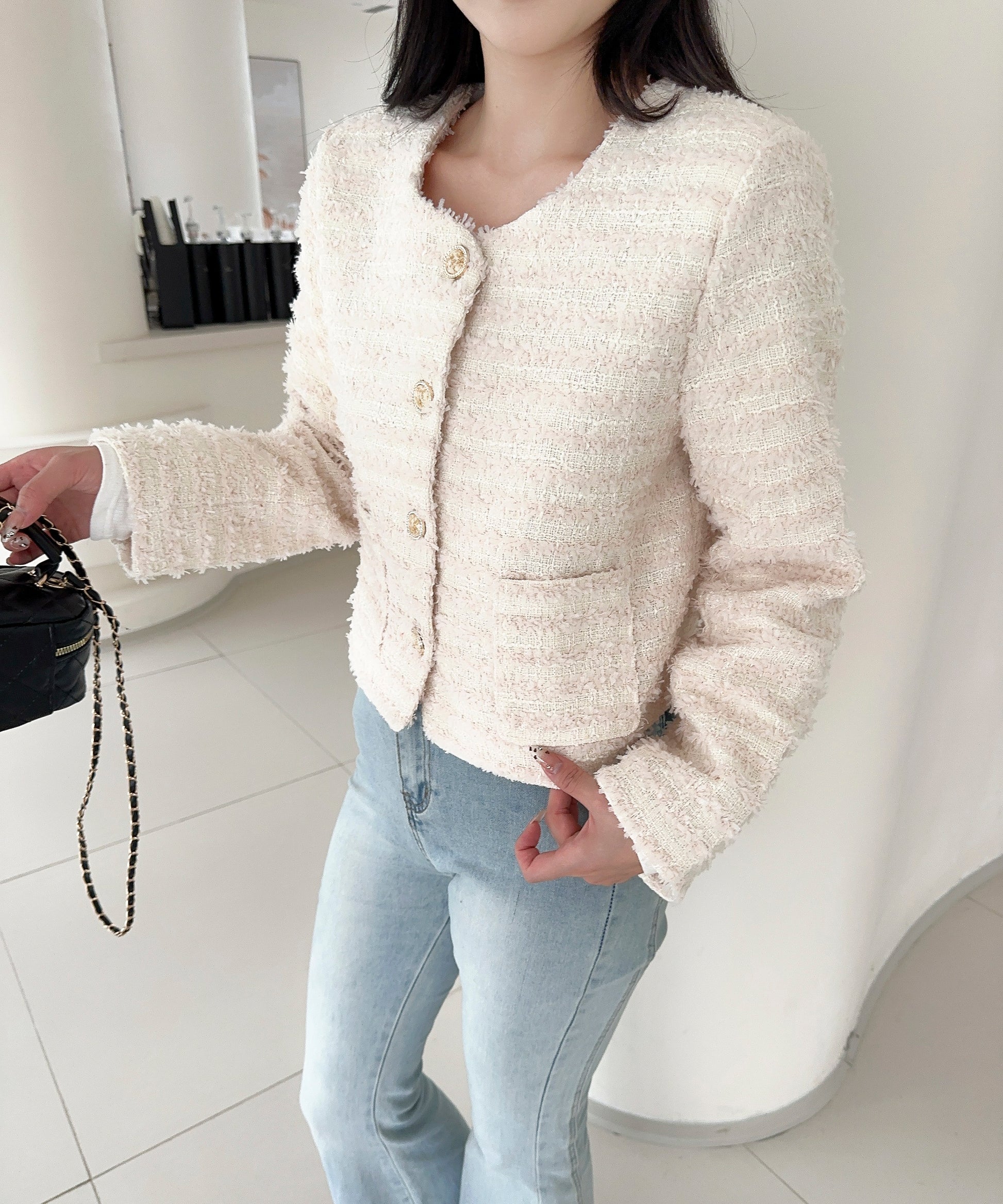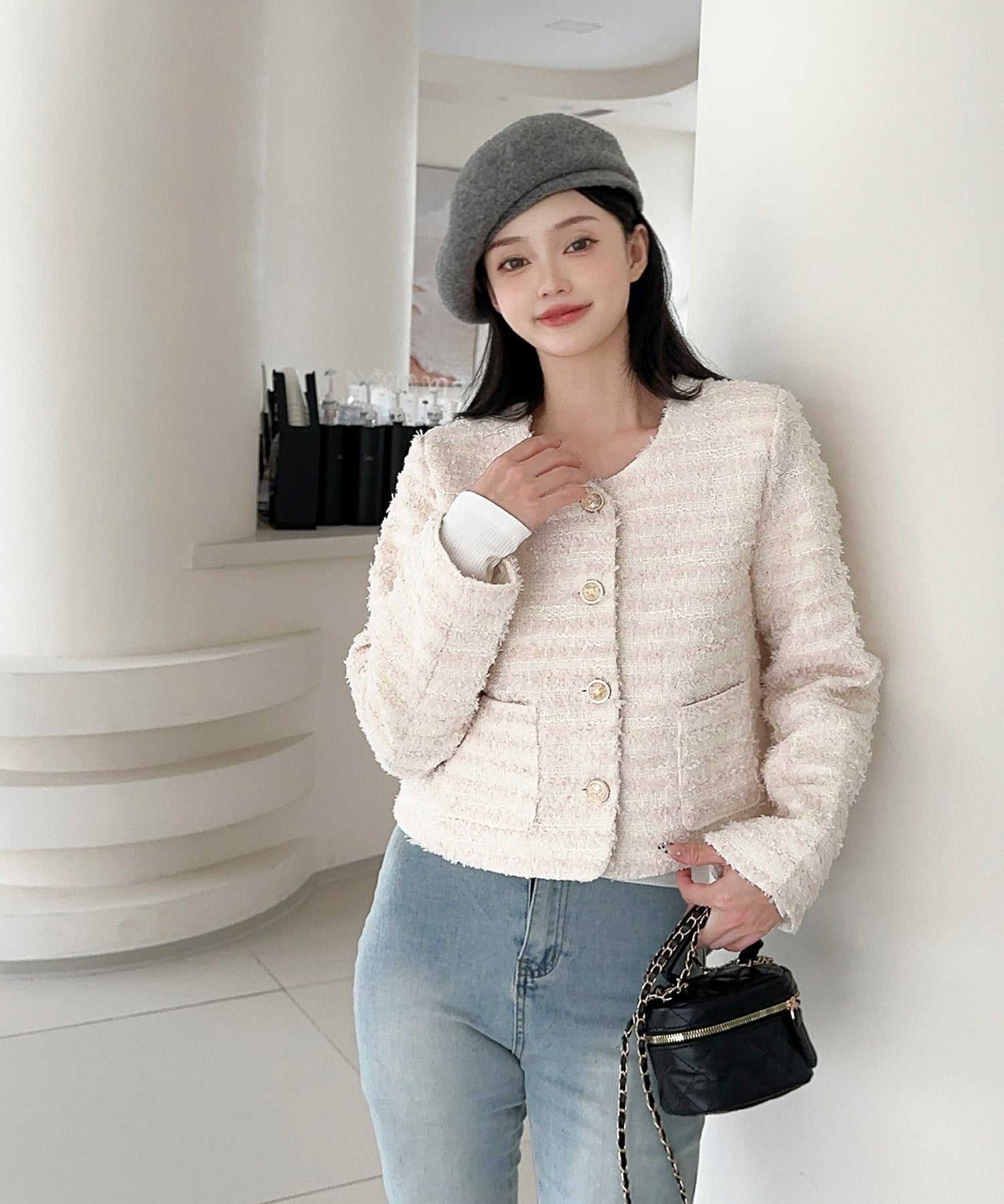 クラシカルなツイード素材に、クロップ丈のデザインがトレンドライクなジャケット。