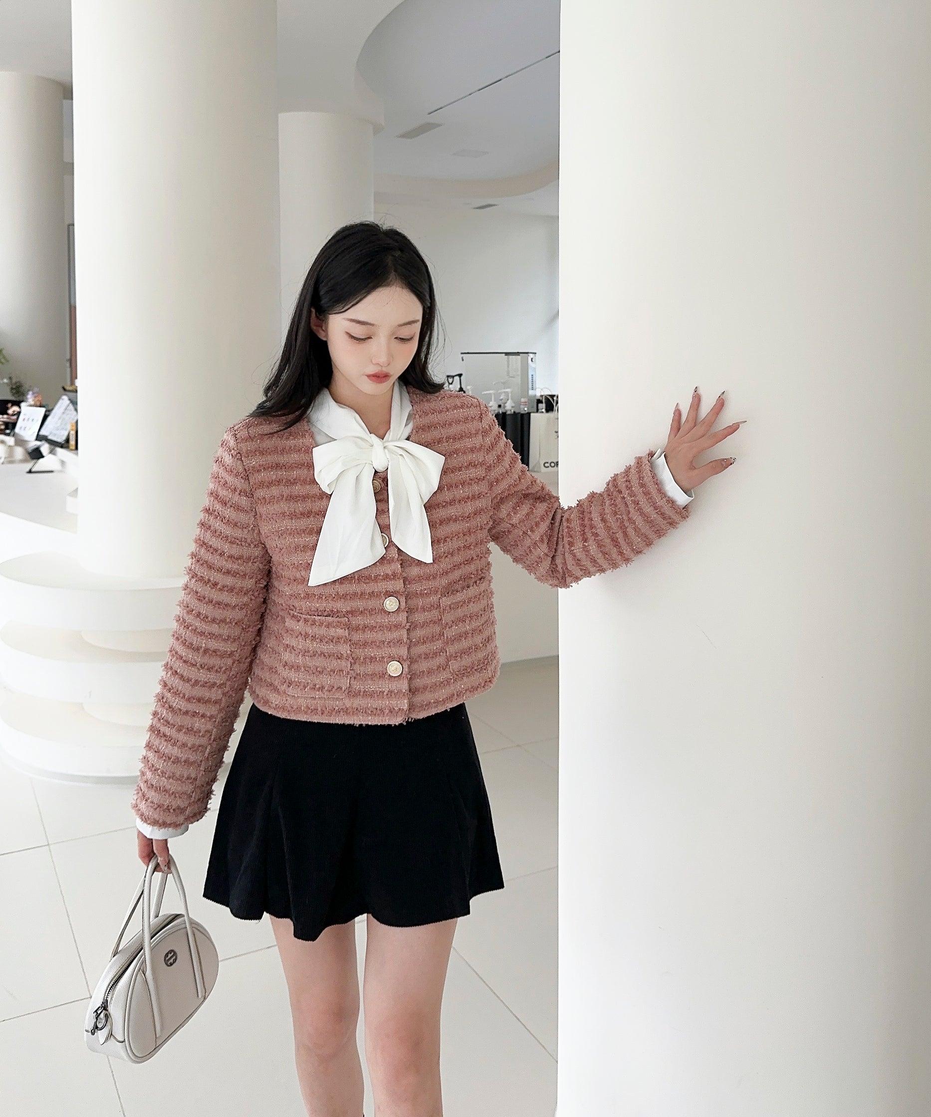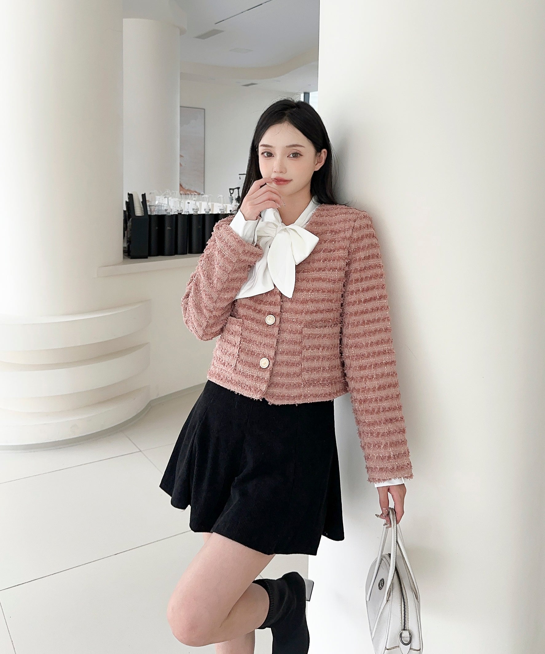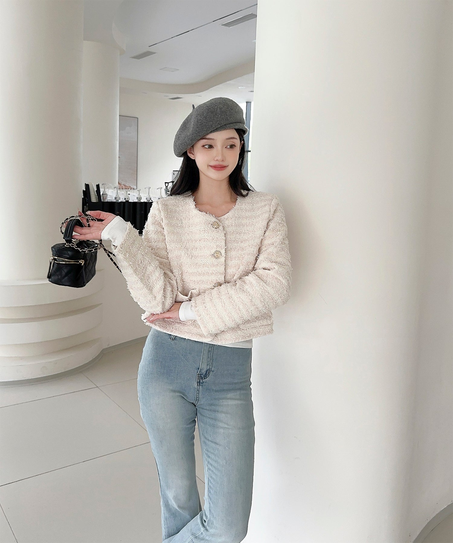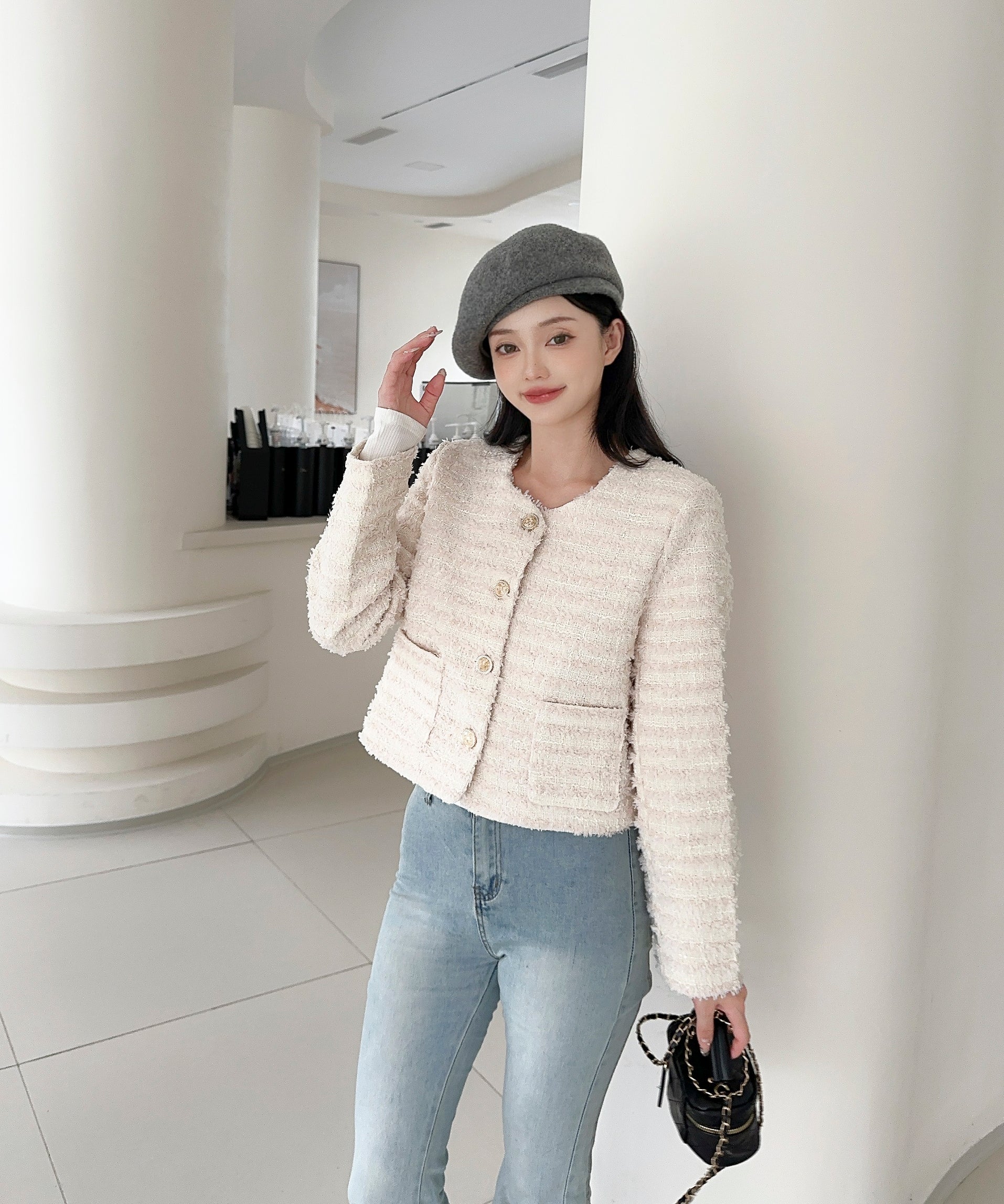 クラシカルなツイード素材に、クロップ丈のデザインがトレンドライクなジャケット。