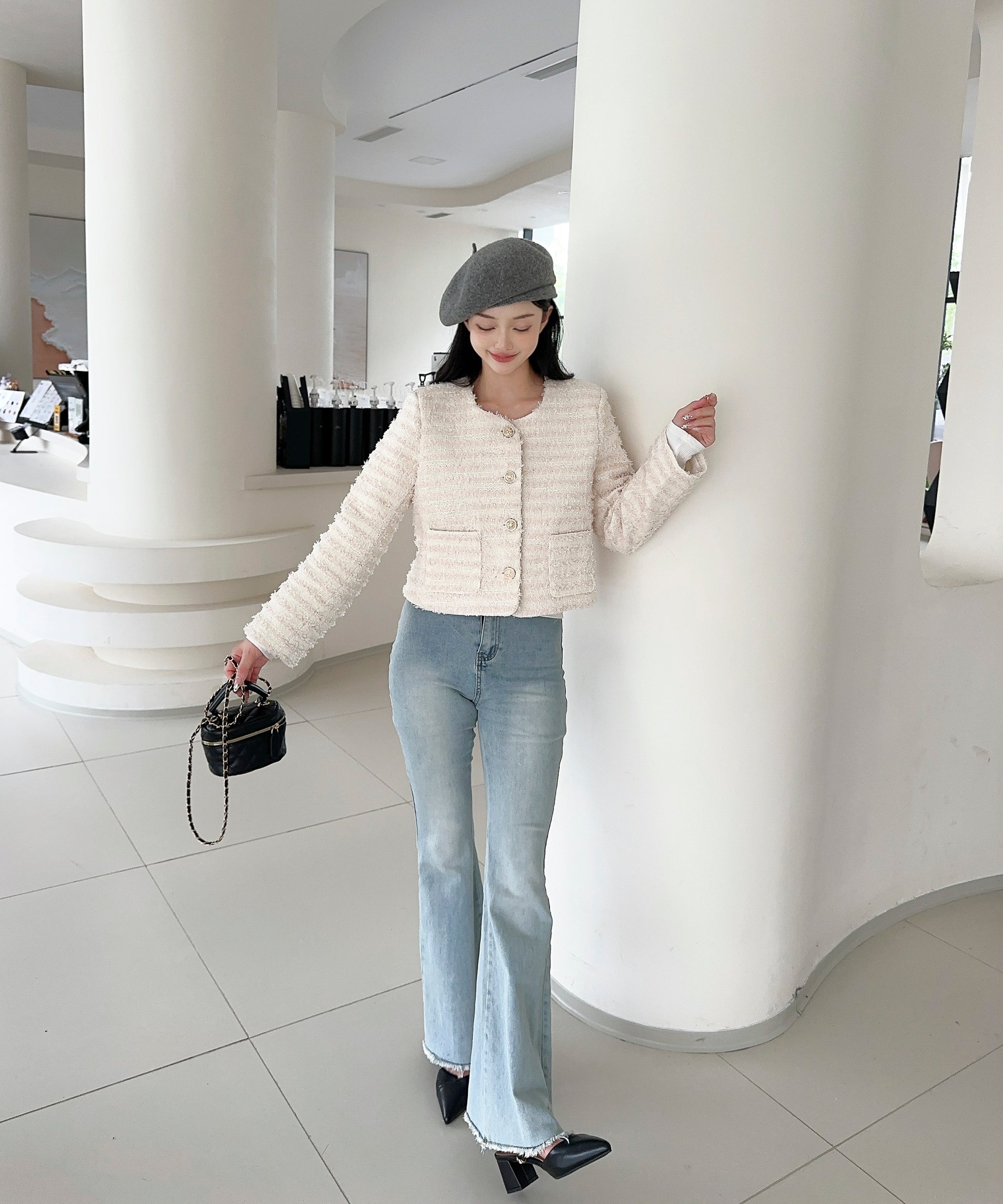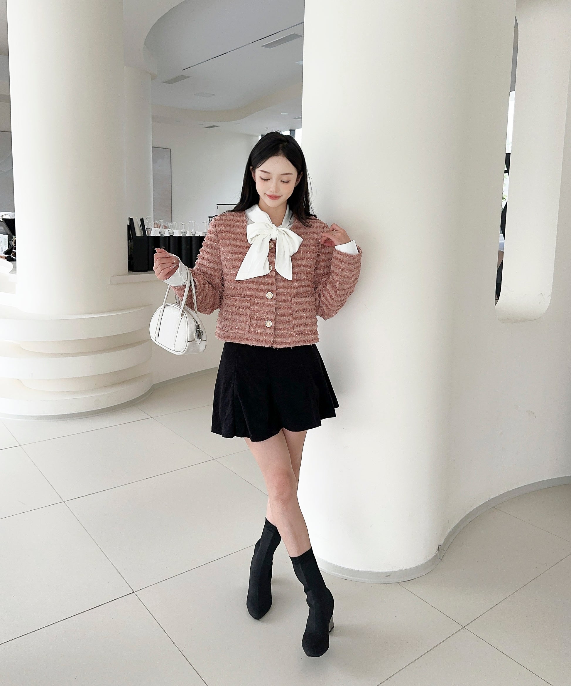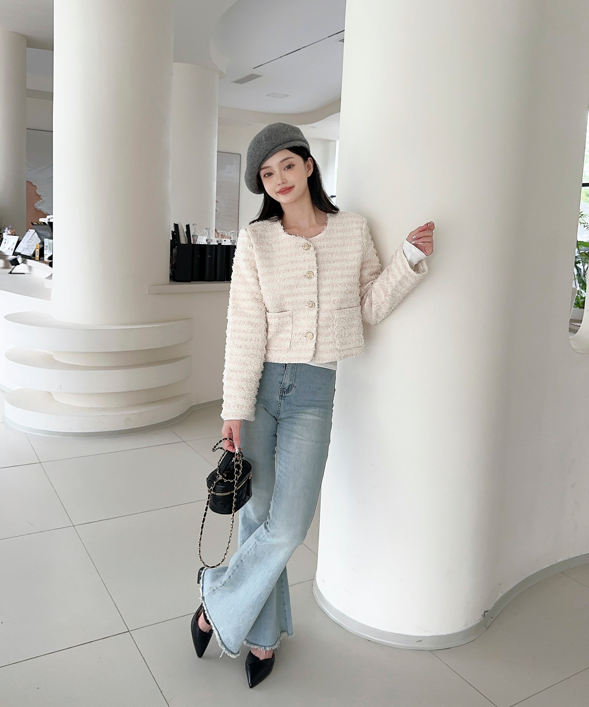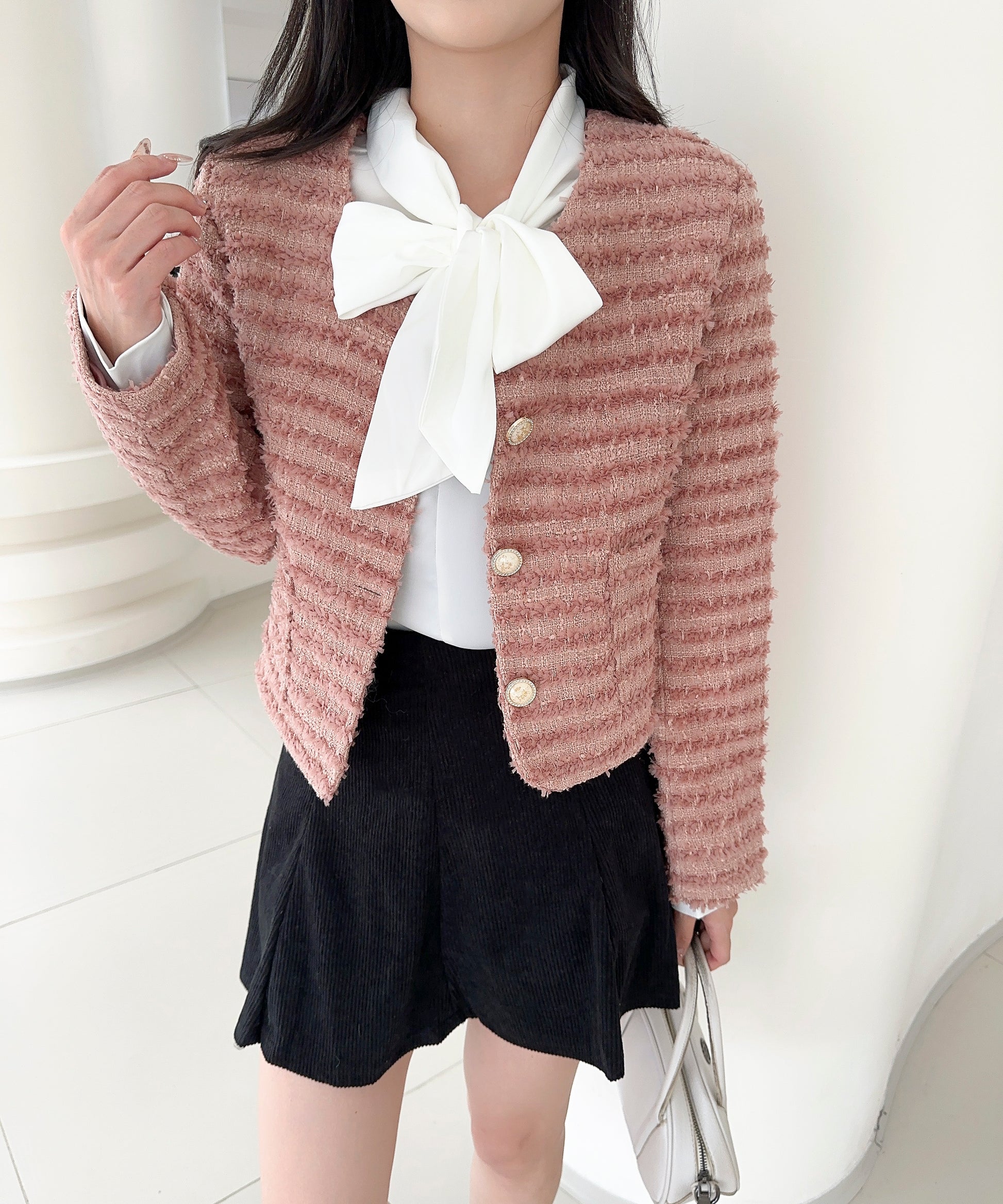 クラシカルなツイード素材に、クロップ丈のデザインがトレンドライクなジャケット。