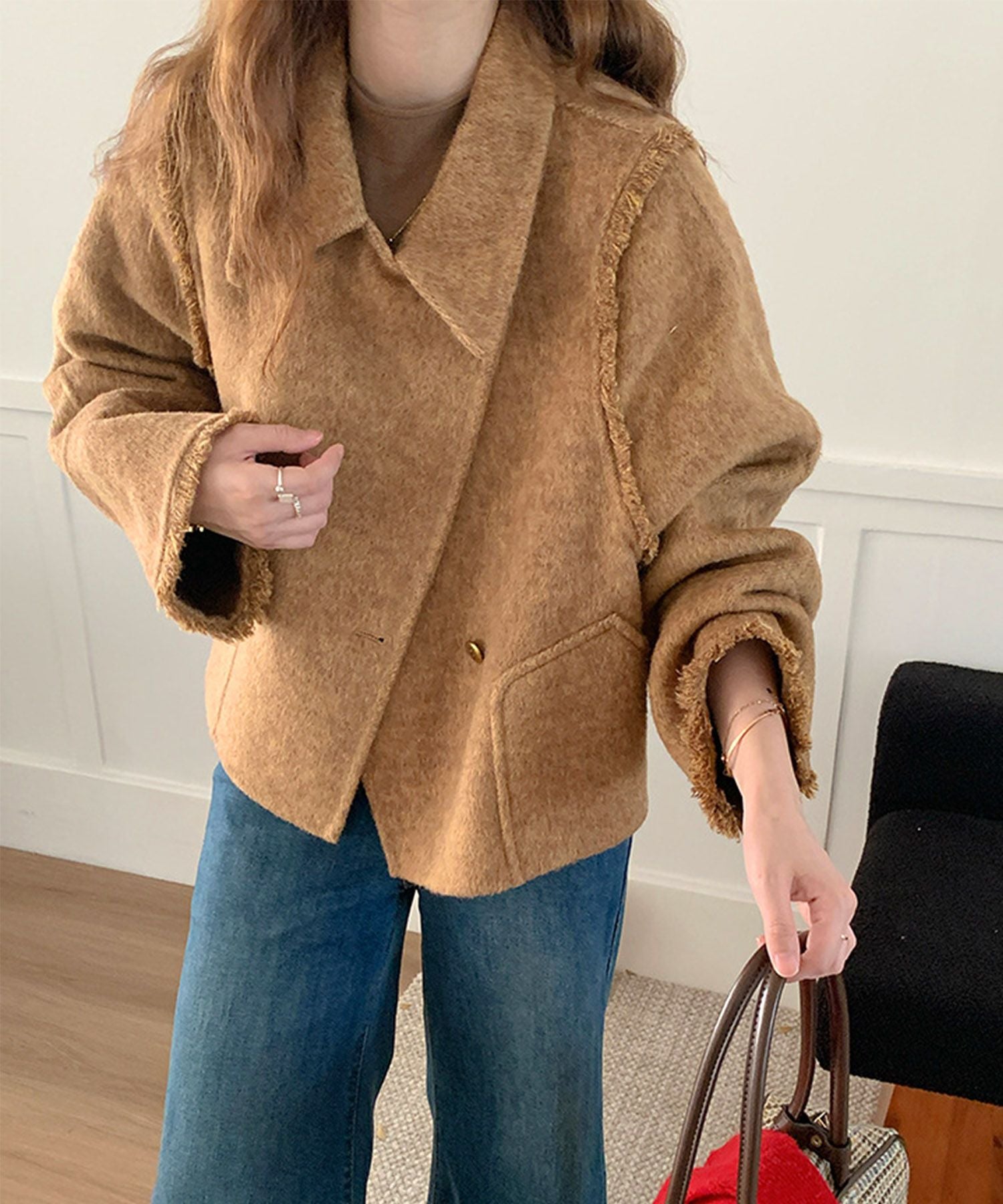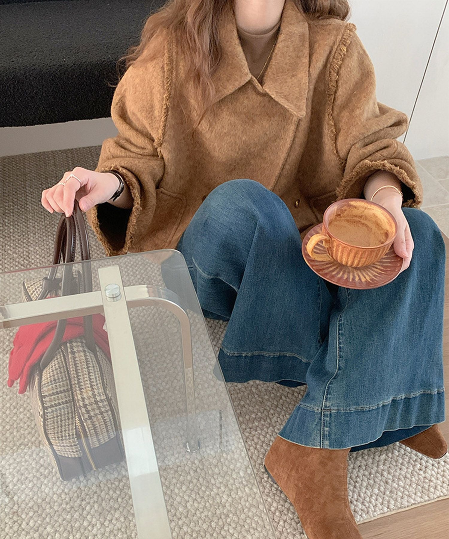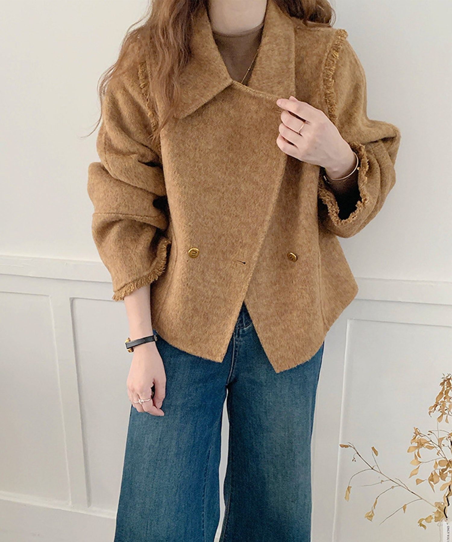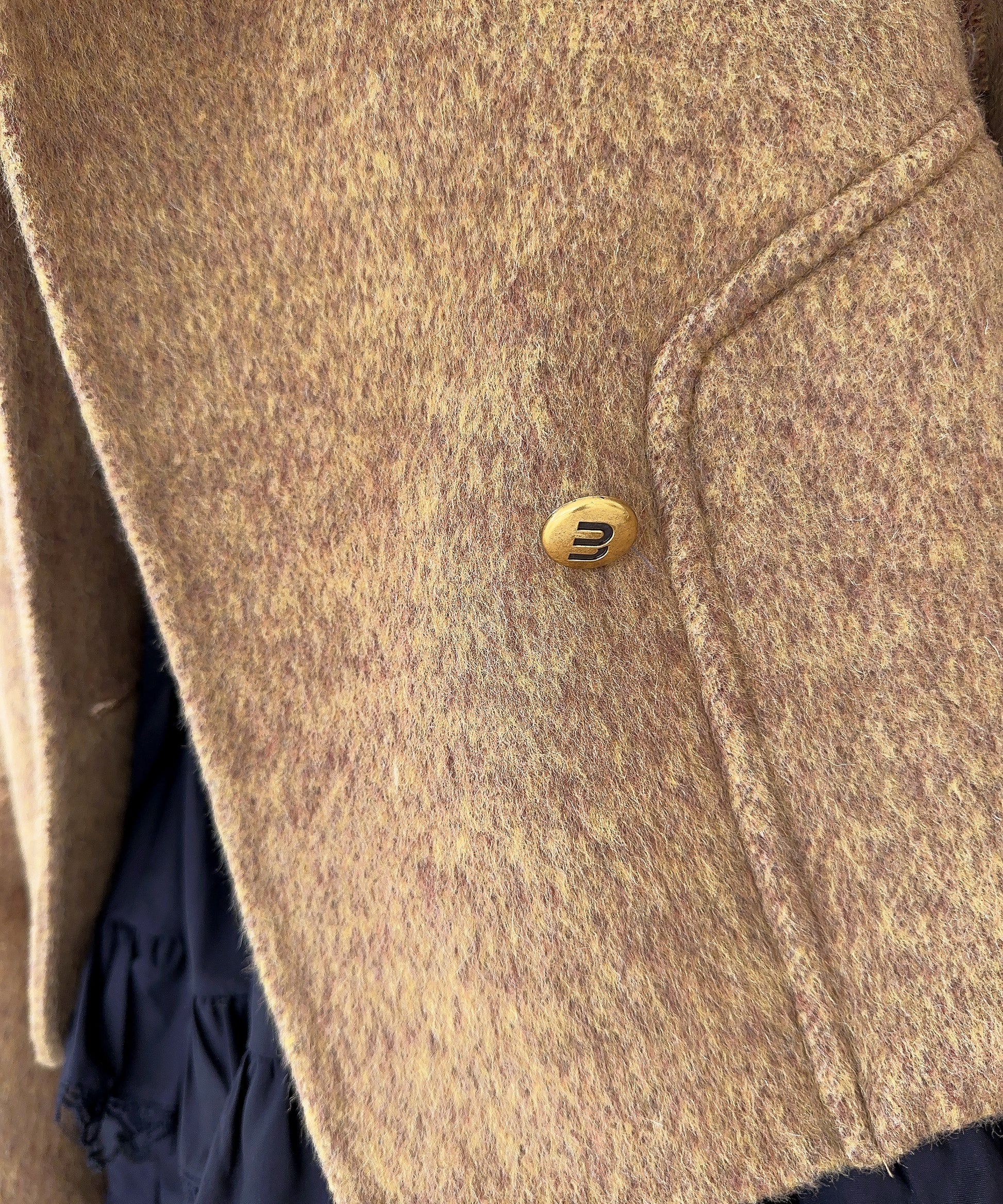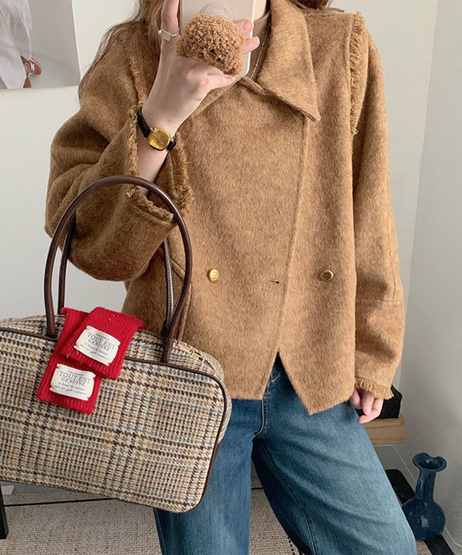 ダブルボタンのデザインがクラシックな雰囲気を演出し、シンプルながらも存在感のある一枚。