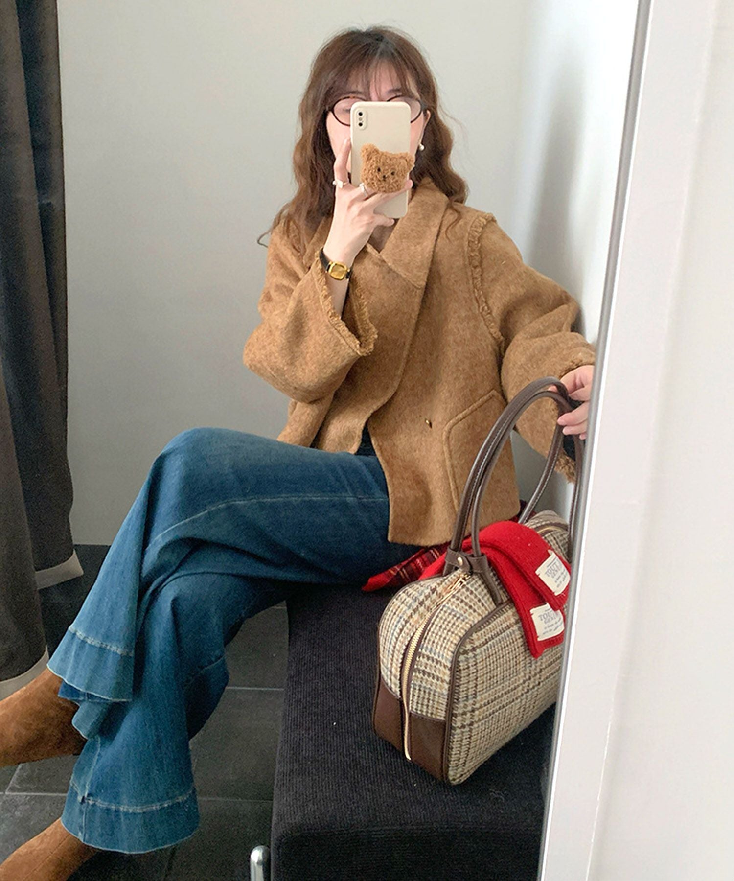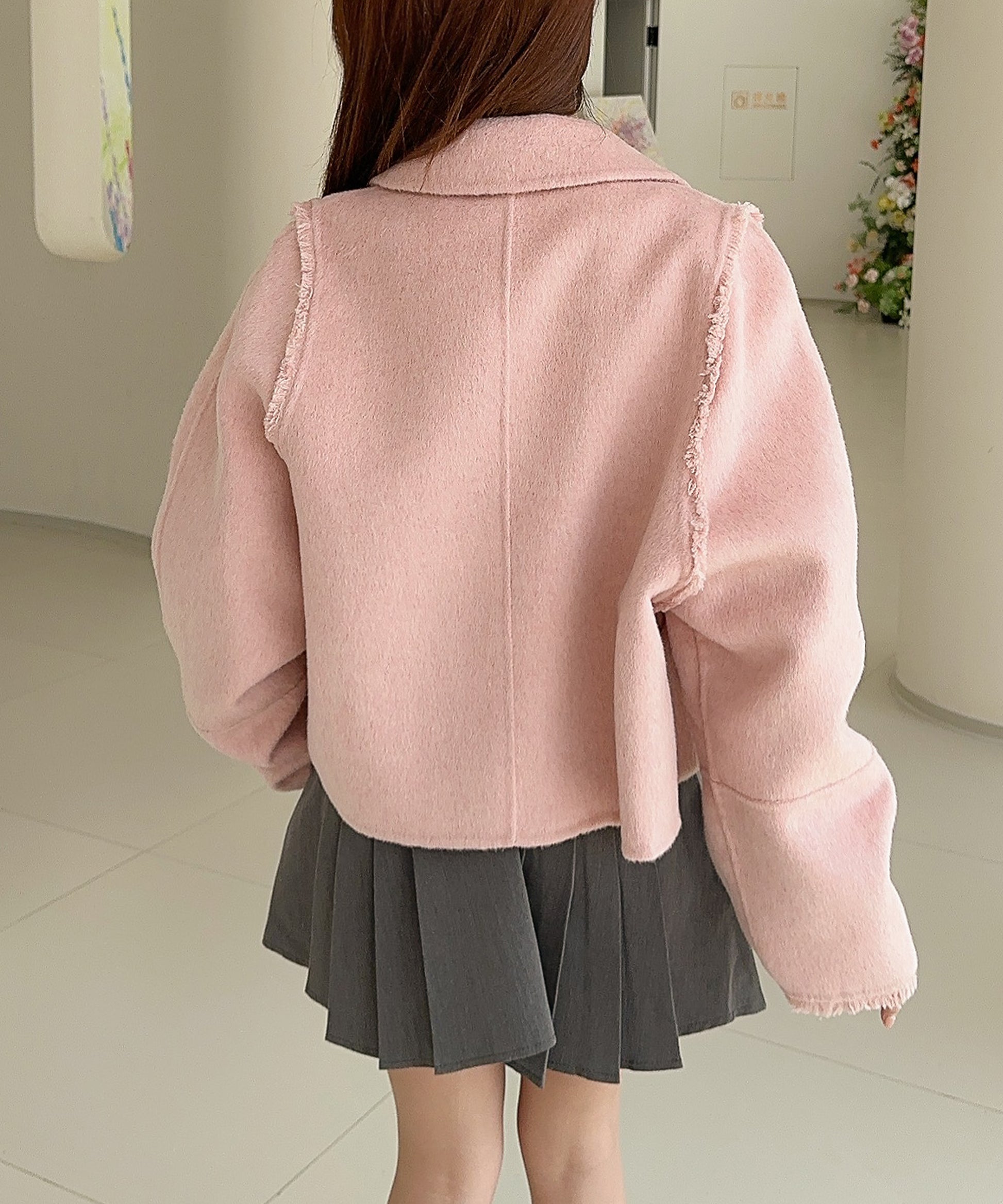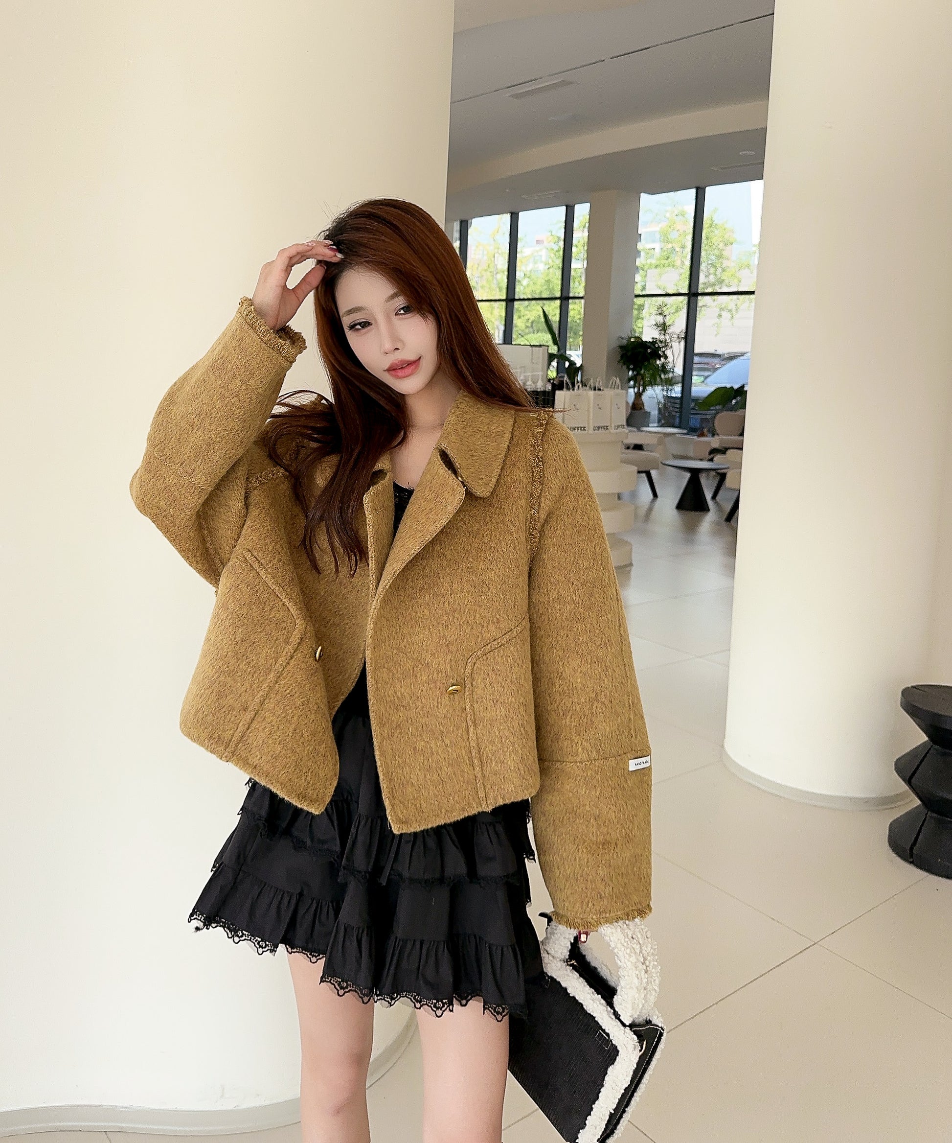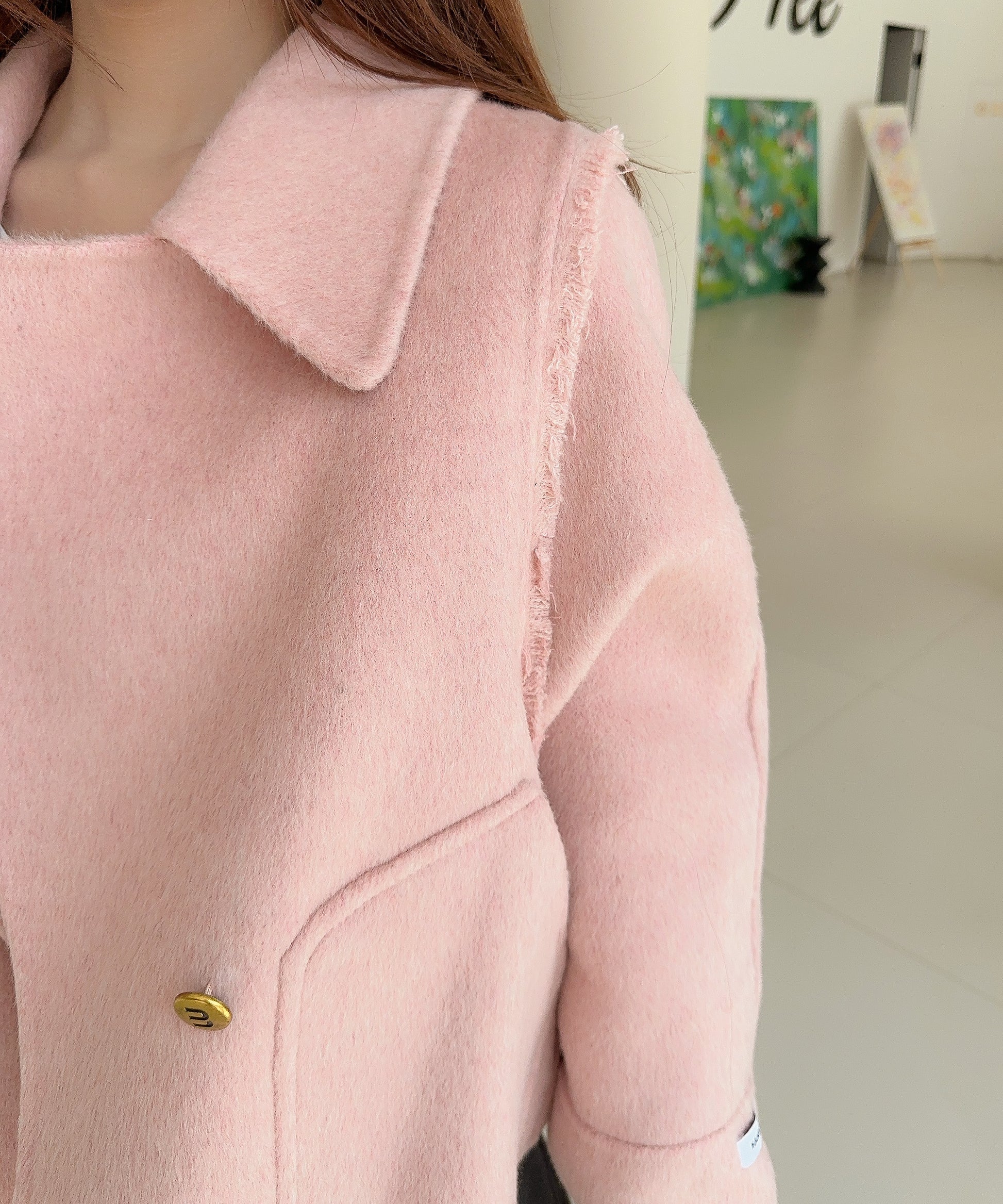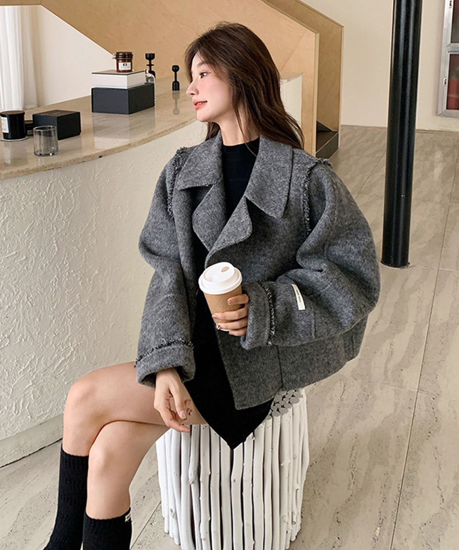 ダブルボタンのデザインがクラシックな雰囲気を演出し、シンプルながらも存在感のある一枚。