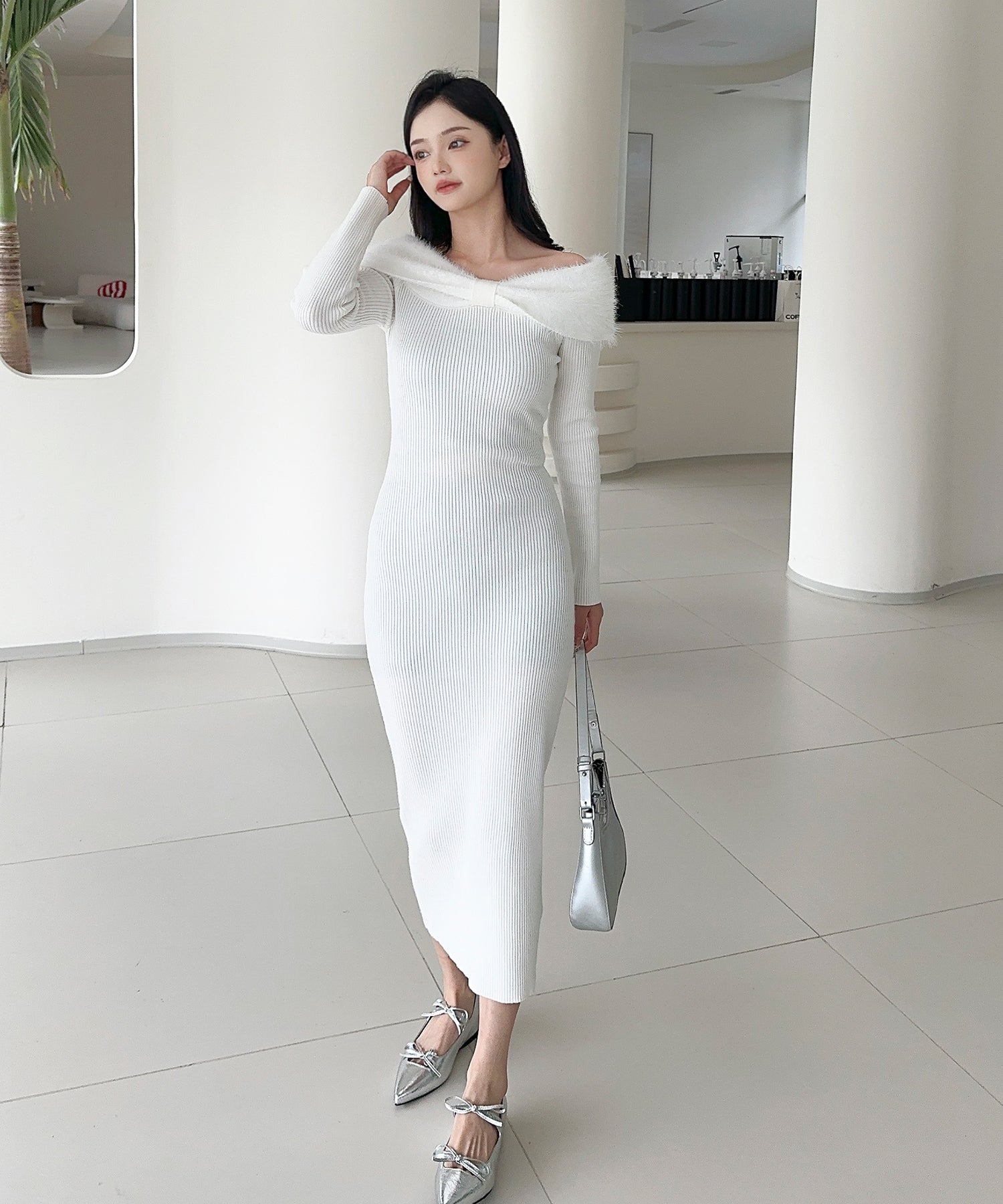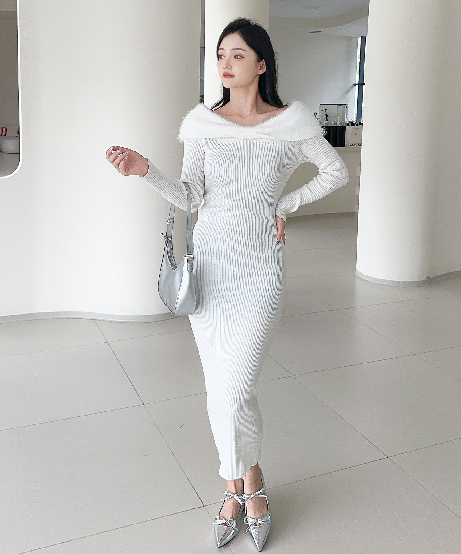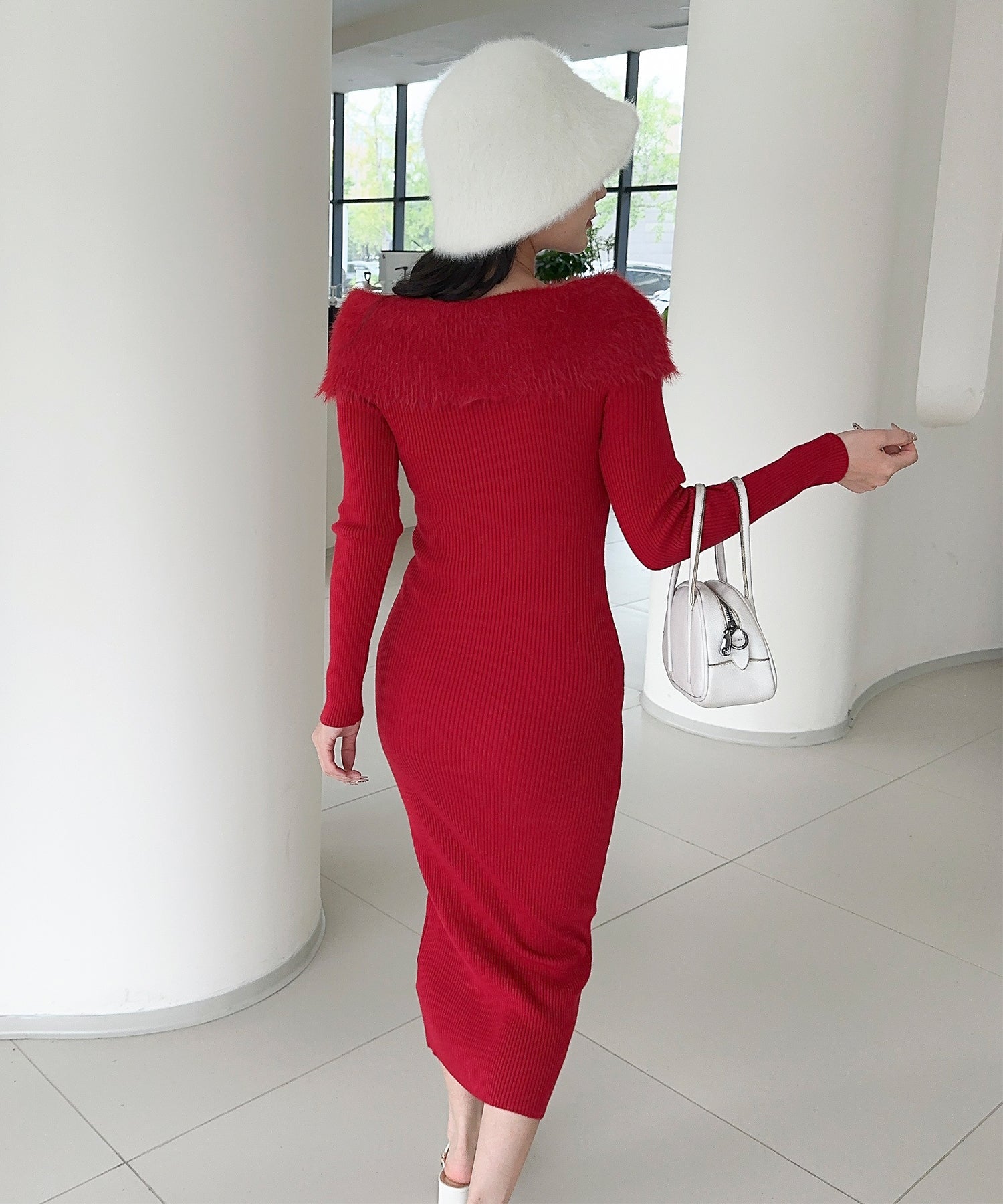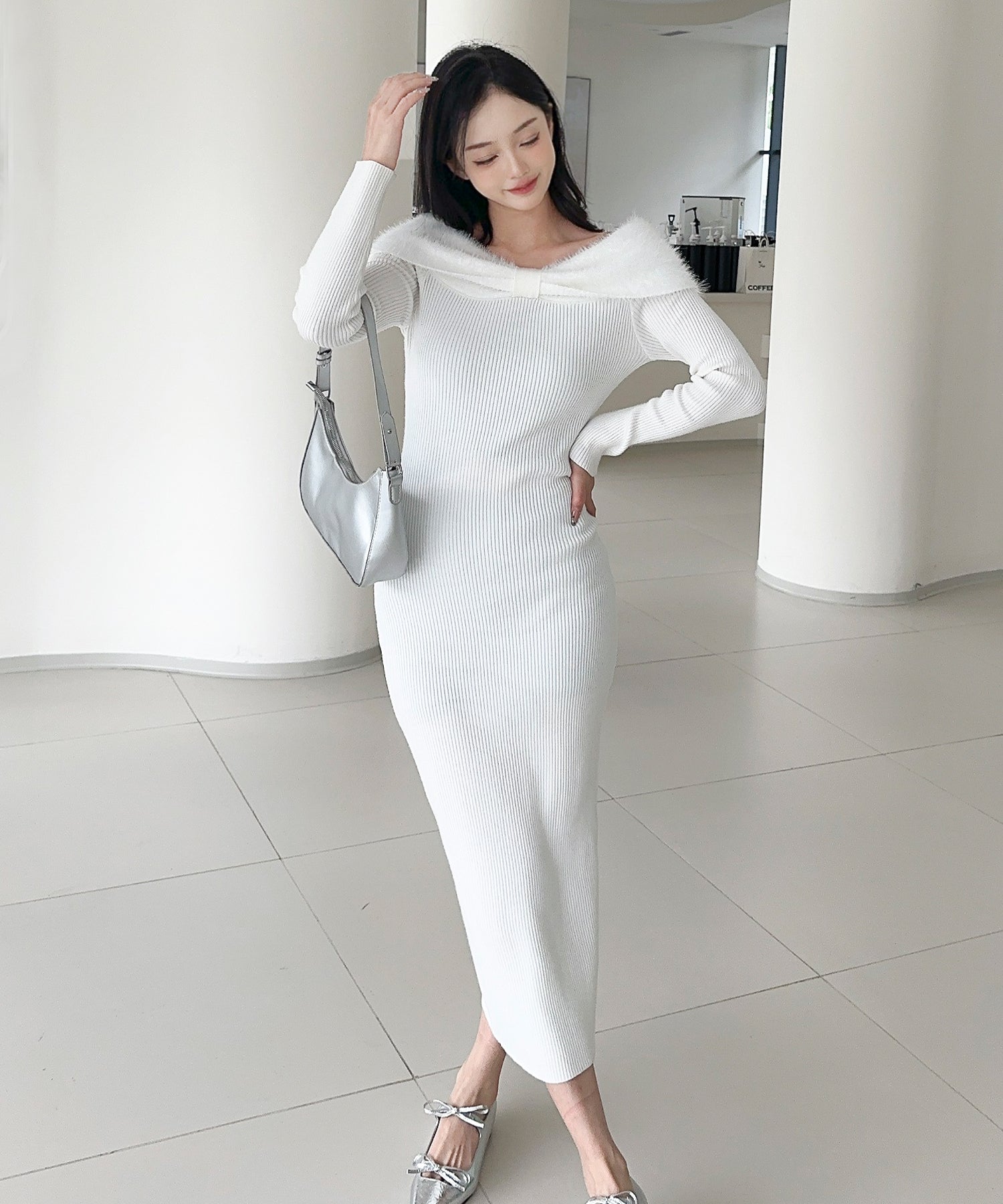 スタイルを美しく見せるタイトシルエットのニットワンピース。