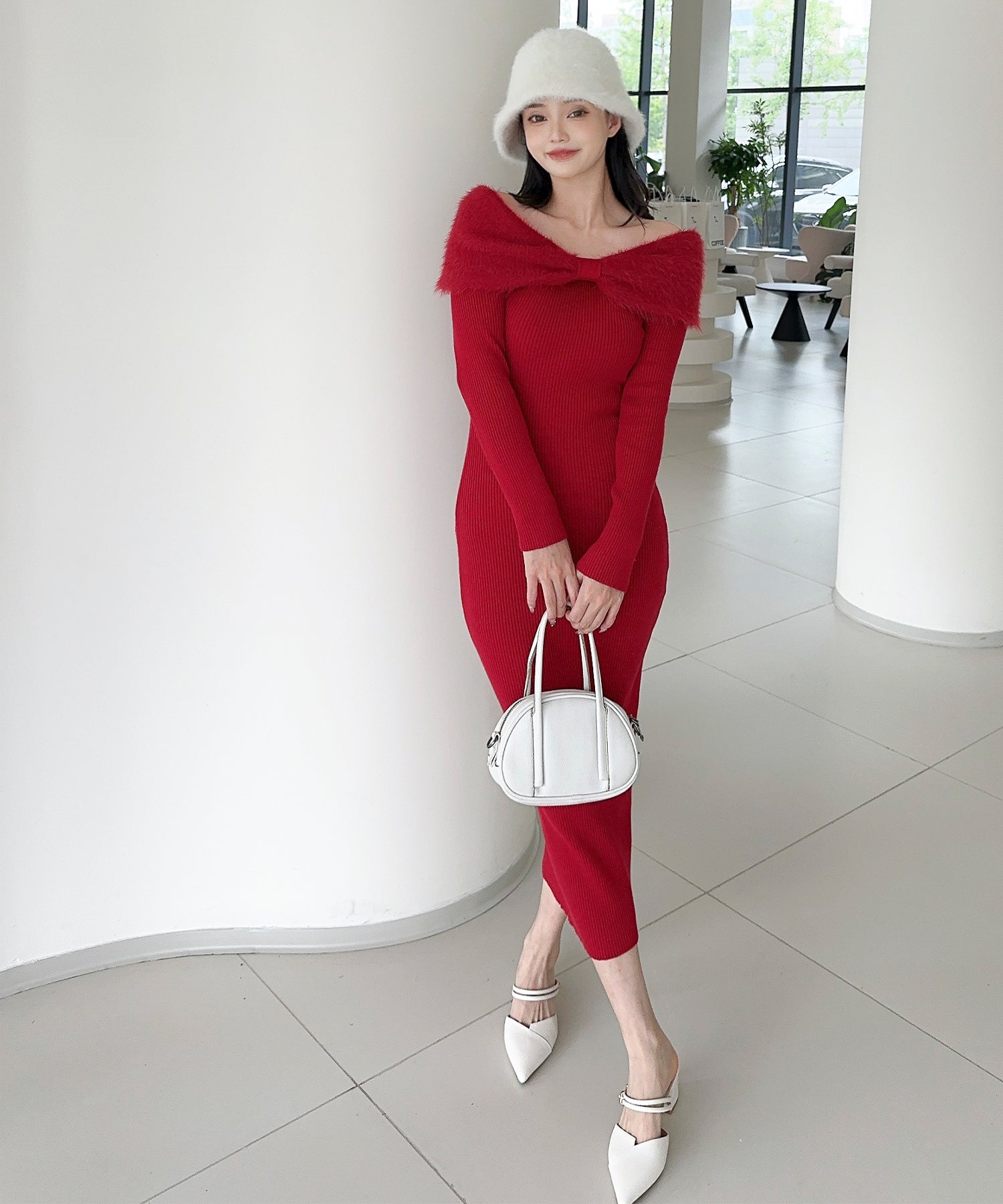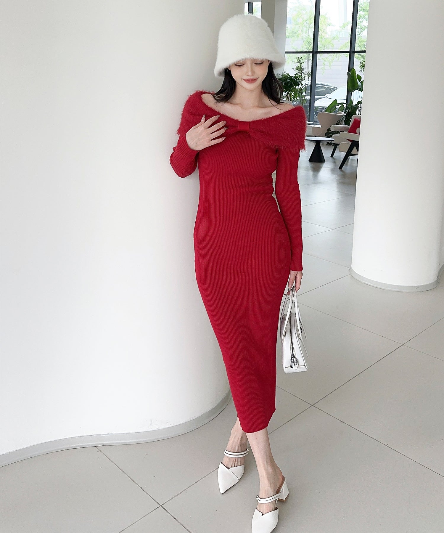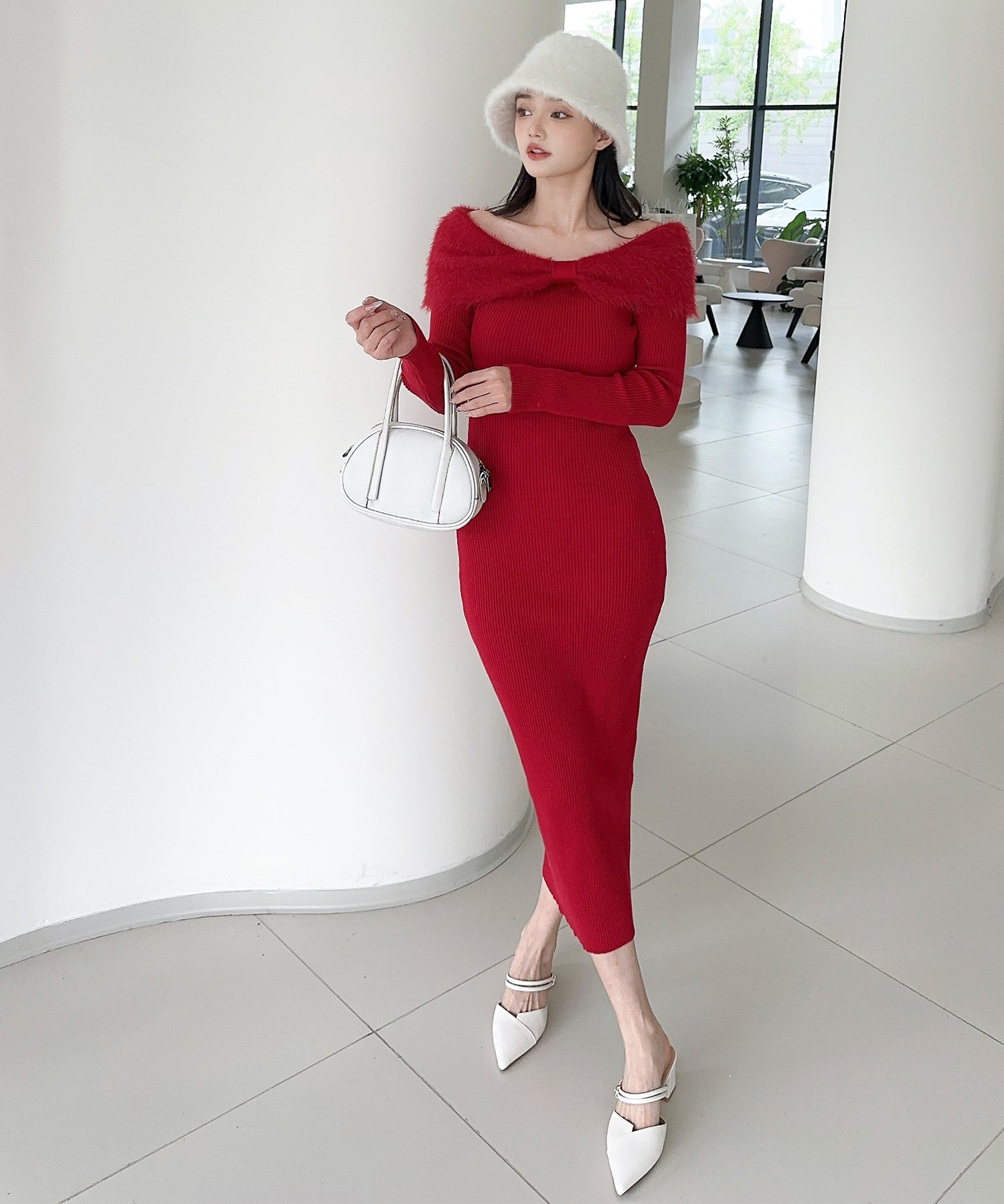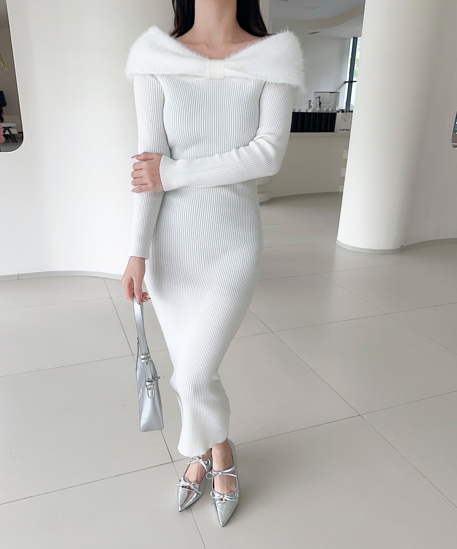 スタイルを美しく見せるタイトシルエットのニットワンピース。