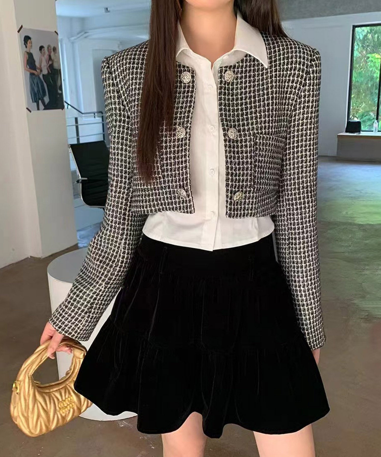 クラシカルな千鳥柄ジャケットとクロップド丈シャツベストのセットアイテム。