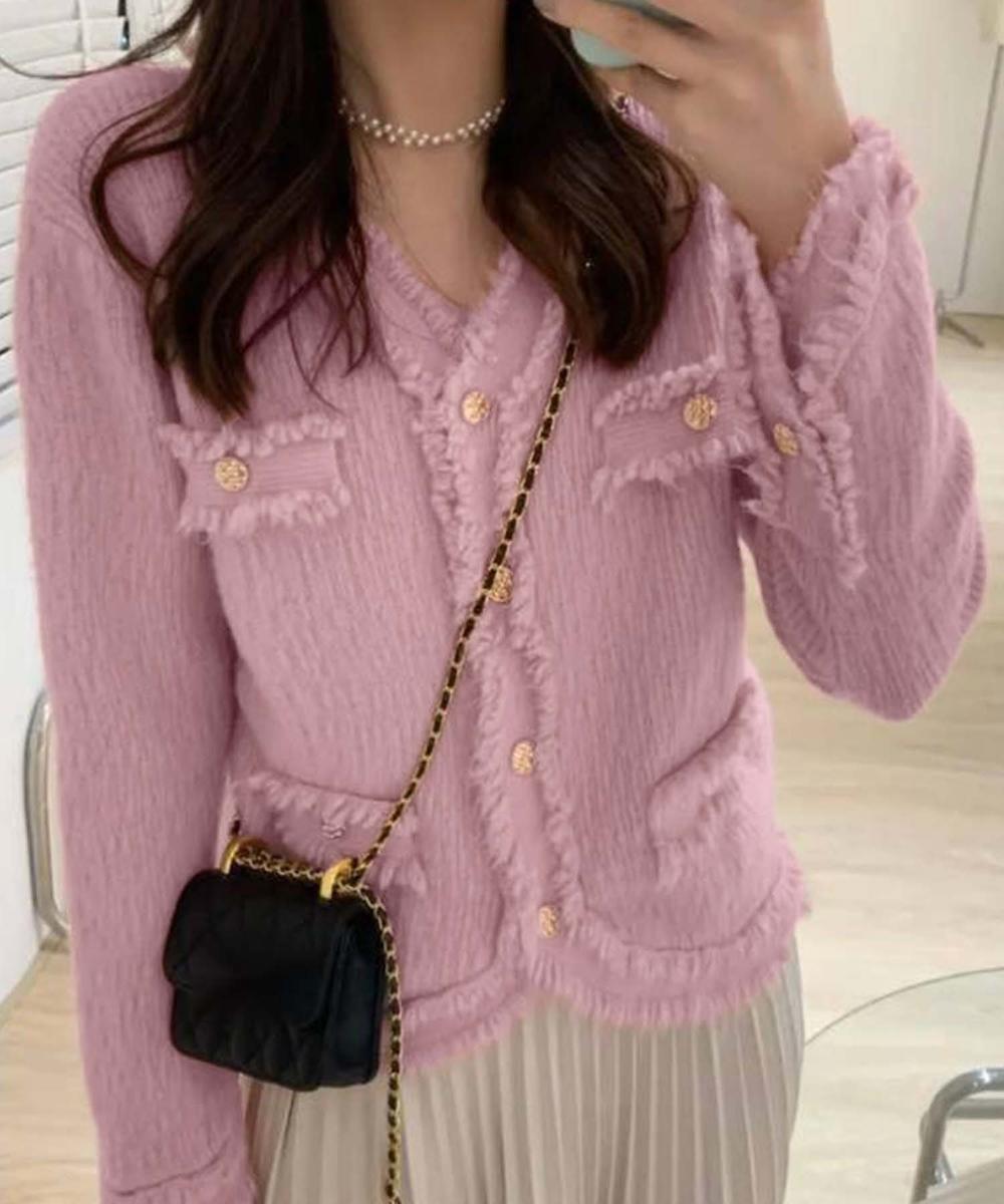 ツイード風の編み地が高級感を醸し出すニットカーディガン。