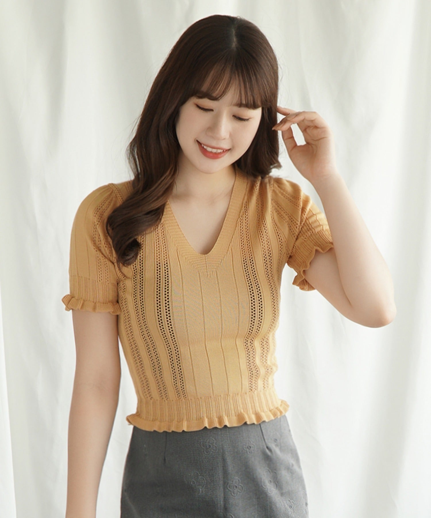 【Jasmine】Vネックレース編みシアー半袖トップス