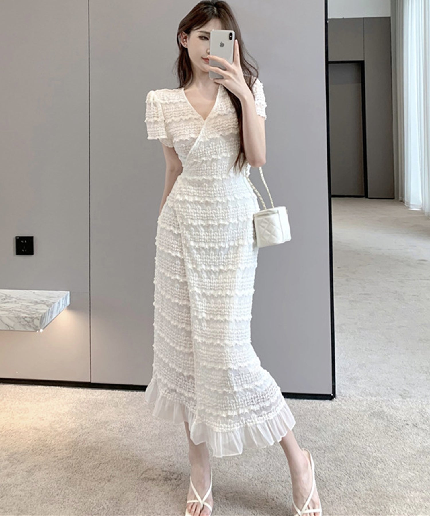 繊細なフラワー柄レースを使用し、華やかさと女性らしさを添えるワンピース。