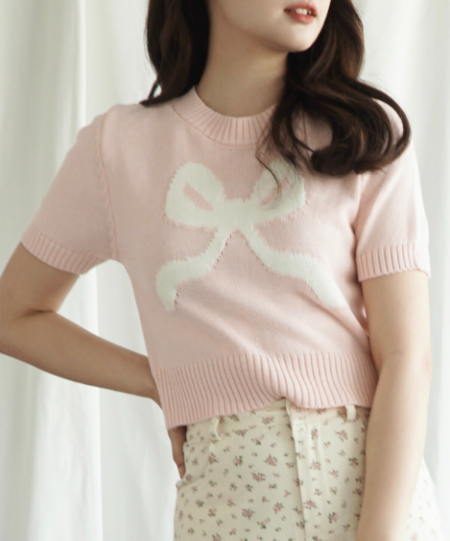 リボンモチーフのプルオーバーが愛らしく、目を惹くアクセント。