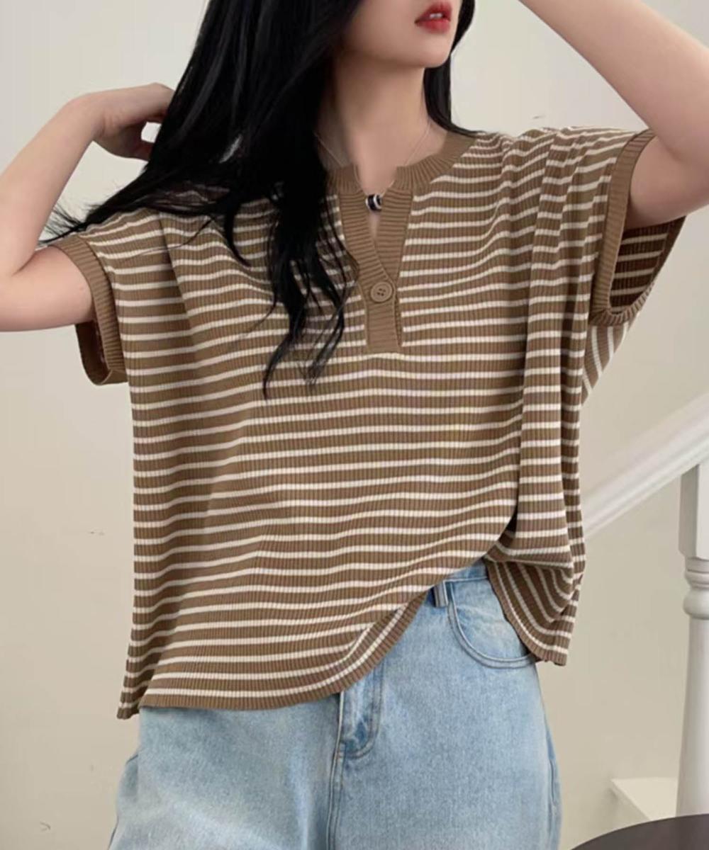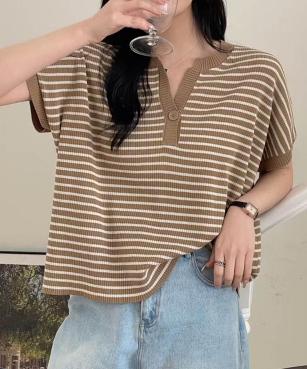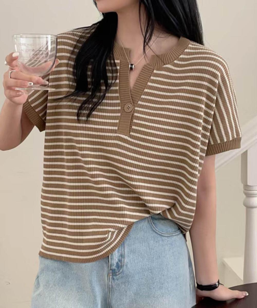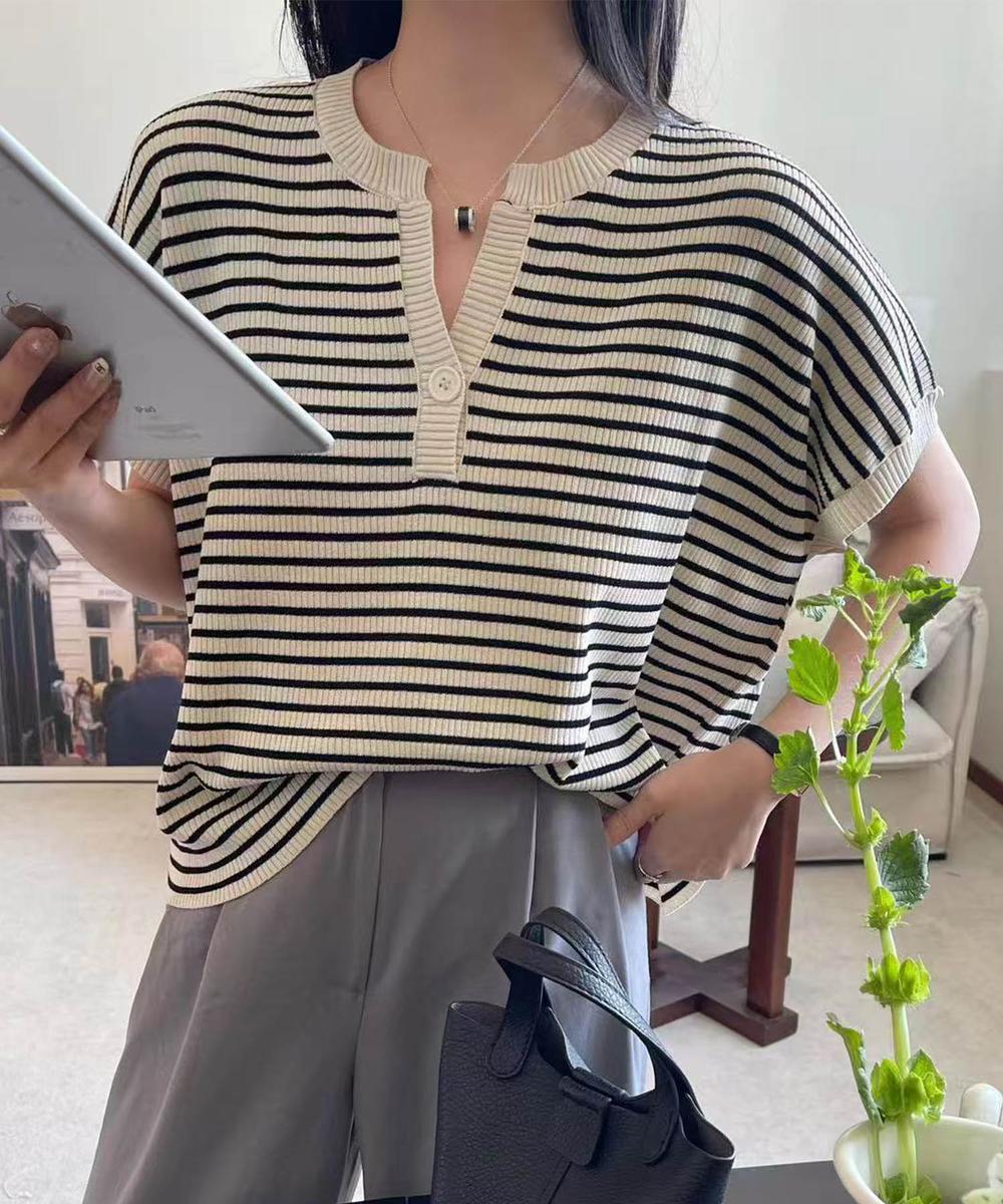 フレンチスリーブの上品な大人っぽいデザインで、Y字のネックが顔まわりをすっきりと見せてくれます。ボーダーのピッチや配色バランスも絶妙で、シンプルでフェミニンな一枚。