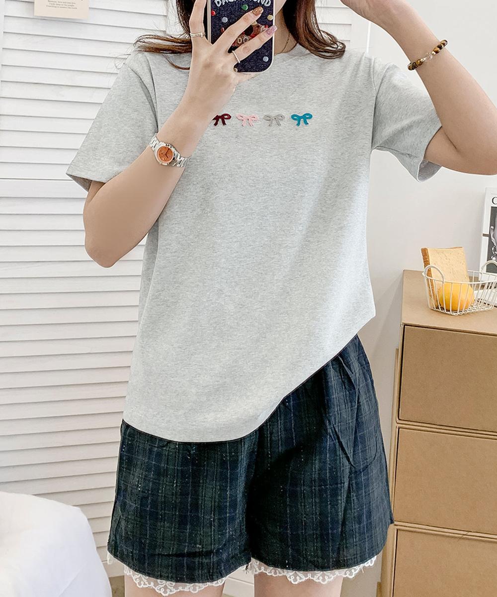 胸元の小さな蝶結(リボン)の刺繍がポイントなTシャツです。