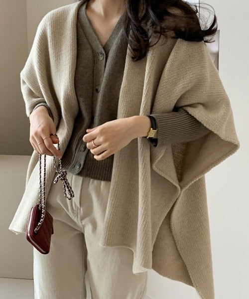【Banico】■デザイン * ゆったりとしたデザインで、サッとカーディガンのように羽織れるニットショール。適度に長めな丈感が、腰回りまでしっかり体型カバーし、暖かさをキープします。
