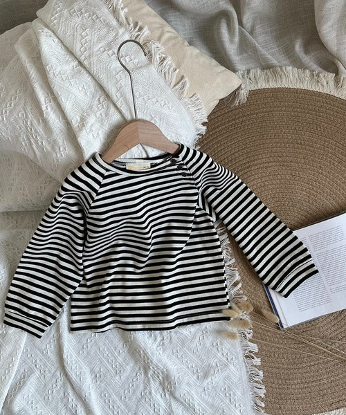 男女問わず着用できてシンプルで使いやすい、ボーダートップス。秋冬にぴったりな3色展開!綿100%で、肌触りが良く通気性も優れているので、オールシーズン着用可能。襟にはボタンが付いているので、スムーズに着脱できます。デニムパンツやカーゴパンツを合わせたカジュアルなスタイルはもちろん、ビスチェやジャンパースカートに合わせた女の子スタイルにも活躍するアイテムです♪