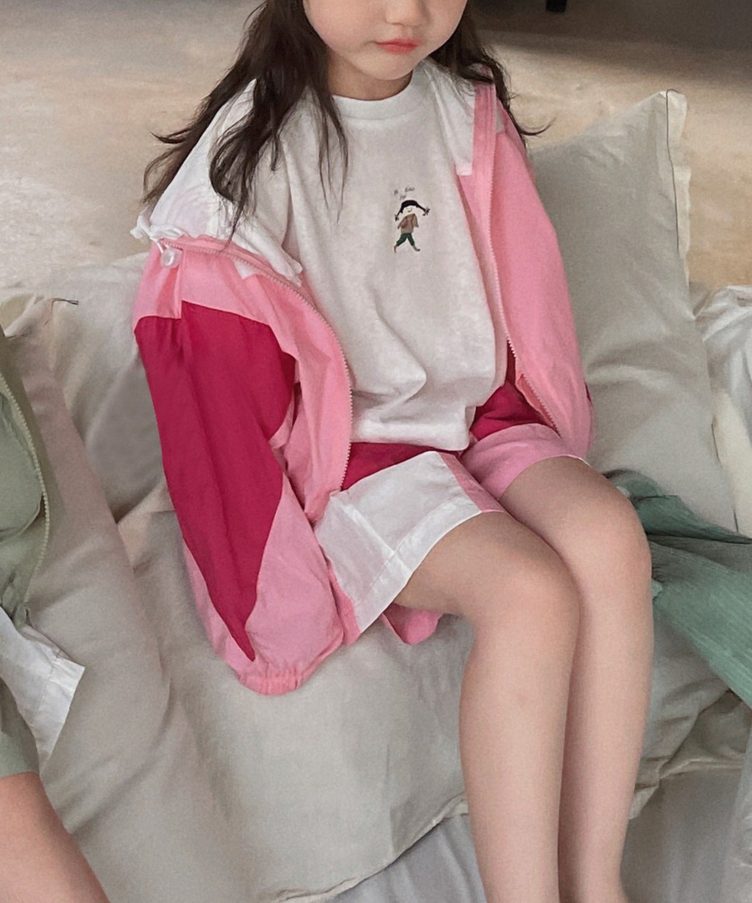 トップスはフード付きで前側がファスナーなので、中にTシャツなどを合わせて羽織のようにも着用いただけます。