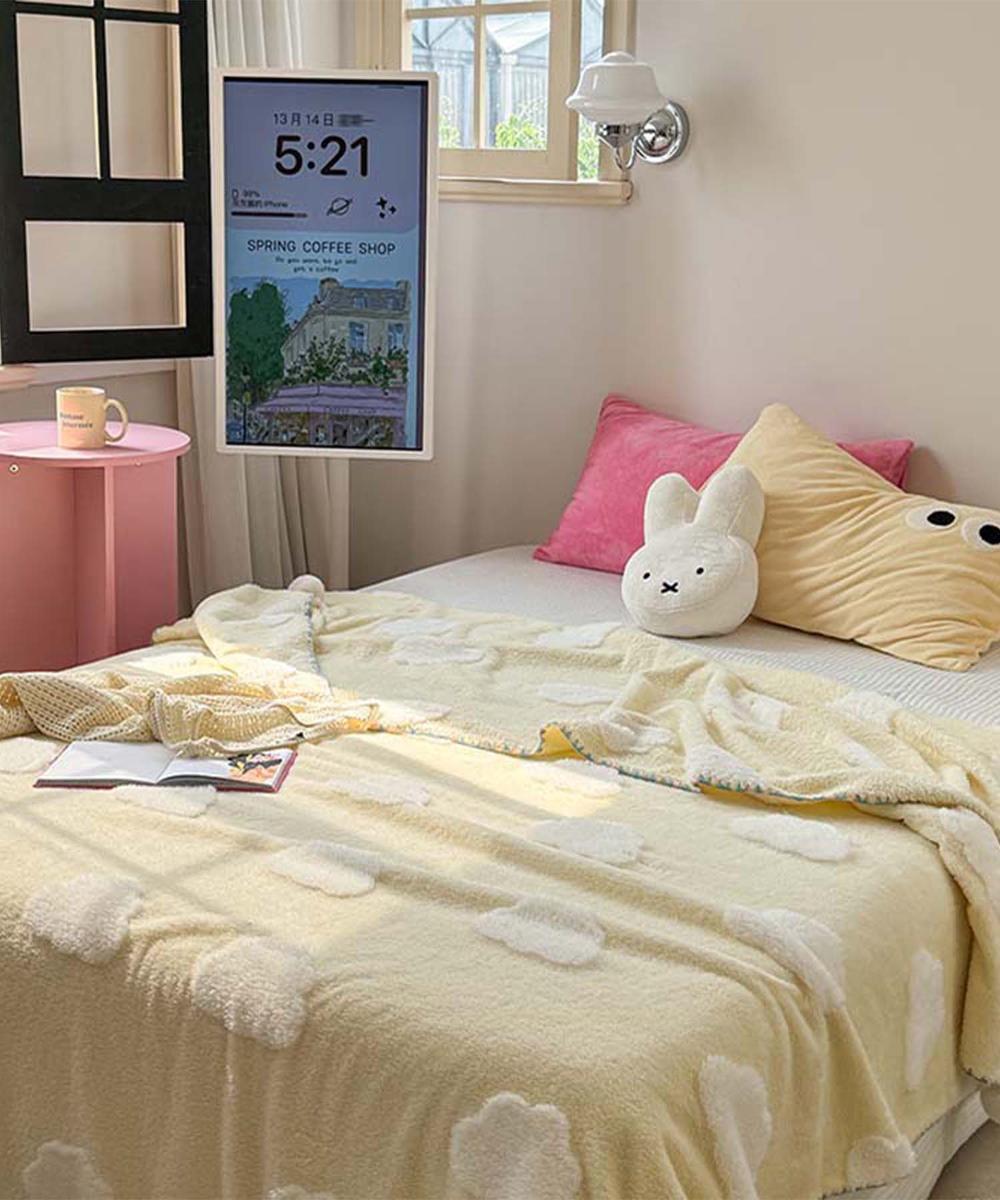 ふわふわの肌触りが魅力のブランケット。雲柄やハート、リボン柄など、遊び心あふれるデザインがとってもキュート!裾にはふんわりとしたポンポン付き。柔らかく軽い素材が身体を優しく包み込み、お部屋でのくつろぎタイムやオフィスでの冷房対策、アウトドアでのひざ掛けとしても大活躍◎シンプルなインテリアにも馴染みやすく、ソファやベッドにさっと掛けるだけでおしゃれな空間に♪