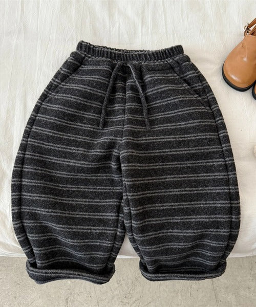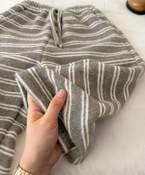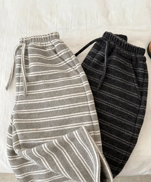 ふんわり裏起毛があったかいモノトーンボーダーのスウェットリラックスパンツ。