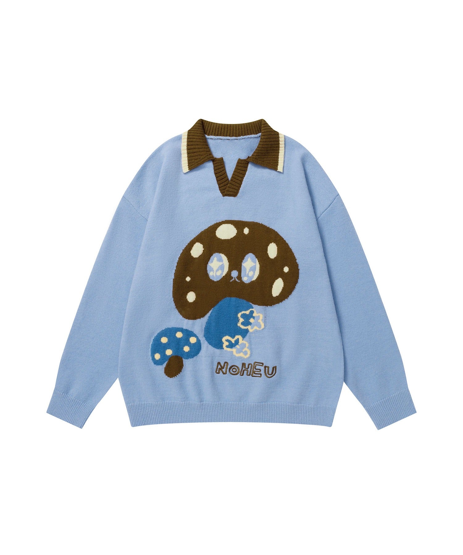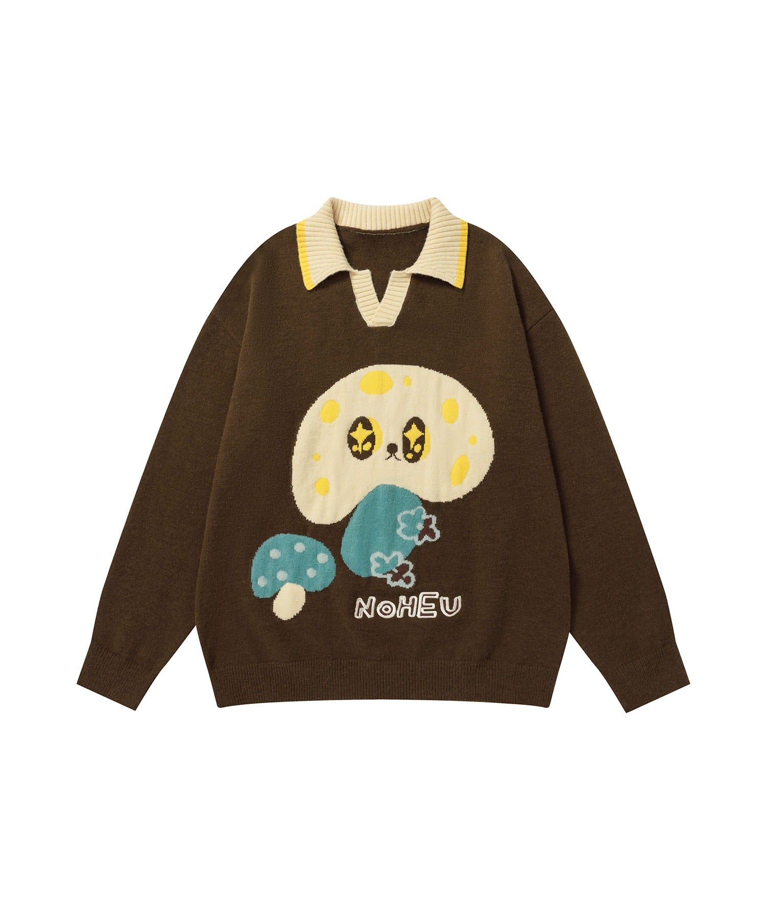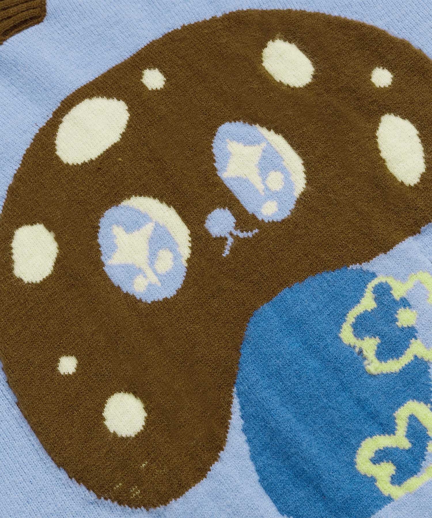 大きなキノコキャラクターがユーモアたっぷりに編み込まれた目を引くデザイン。