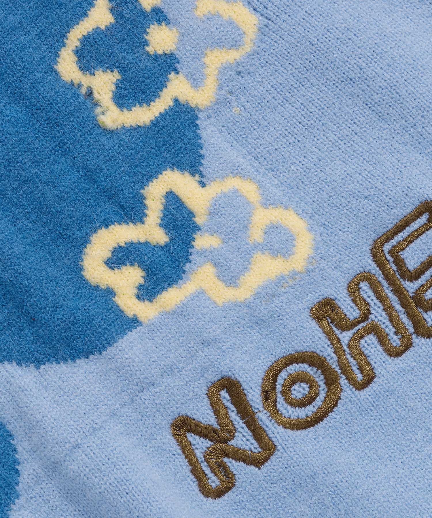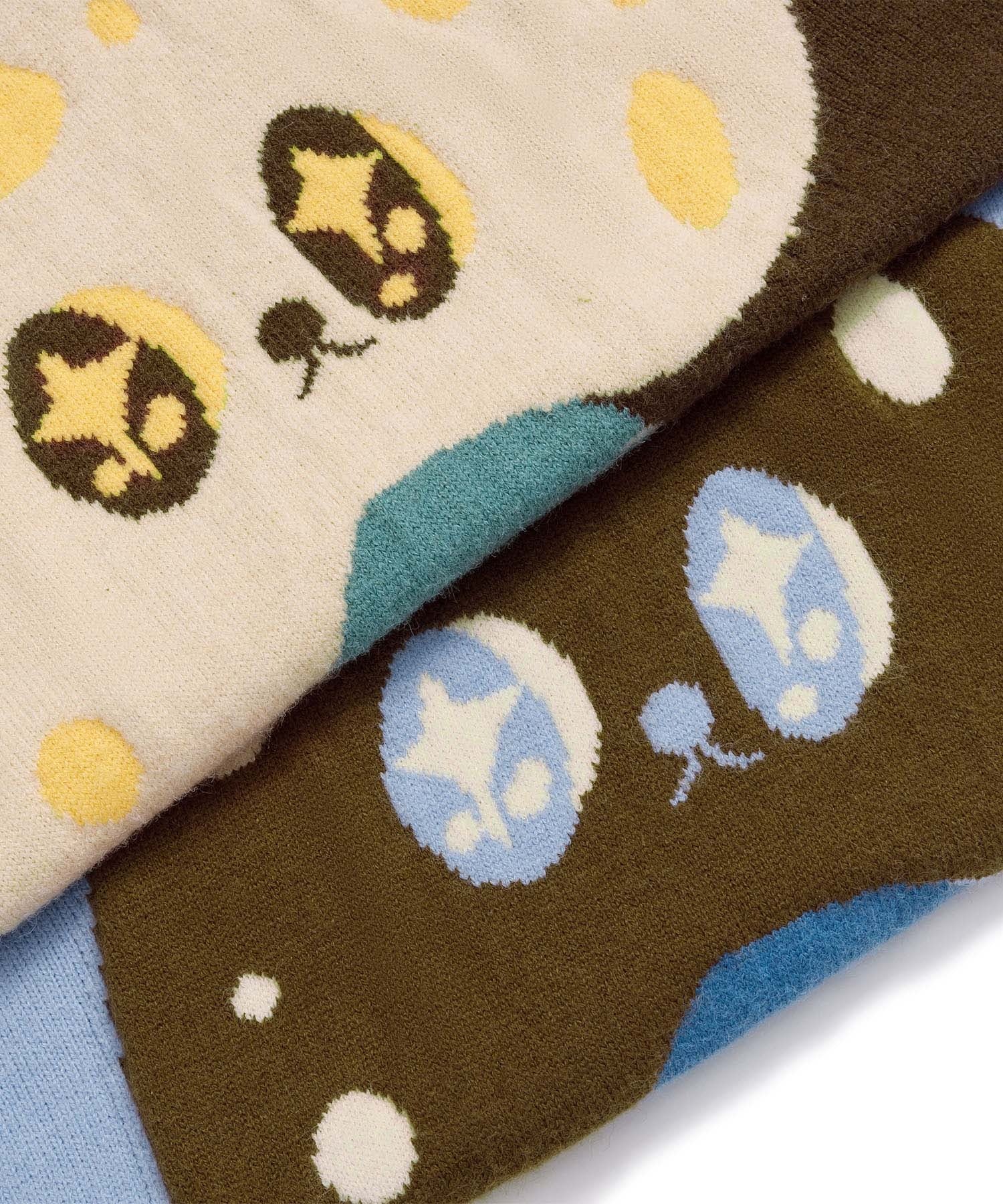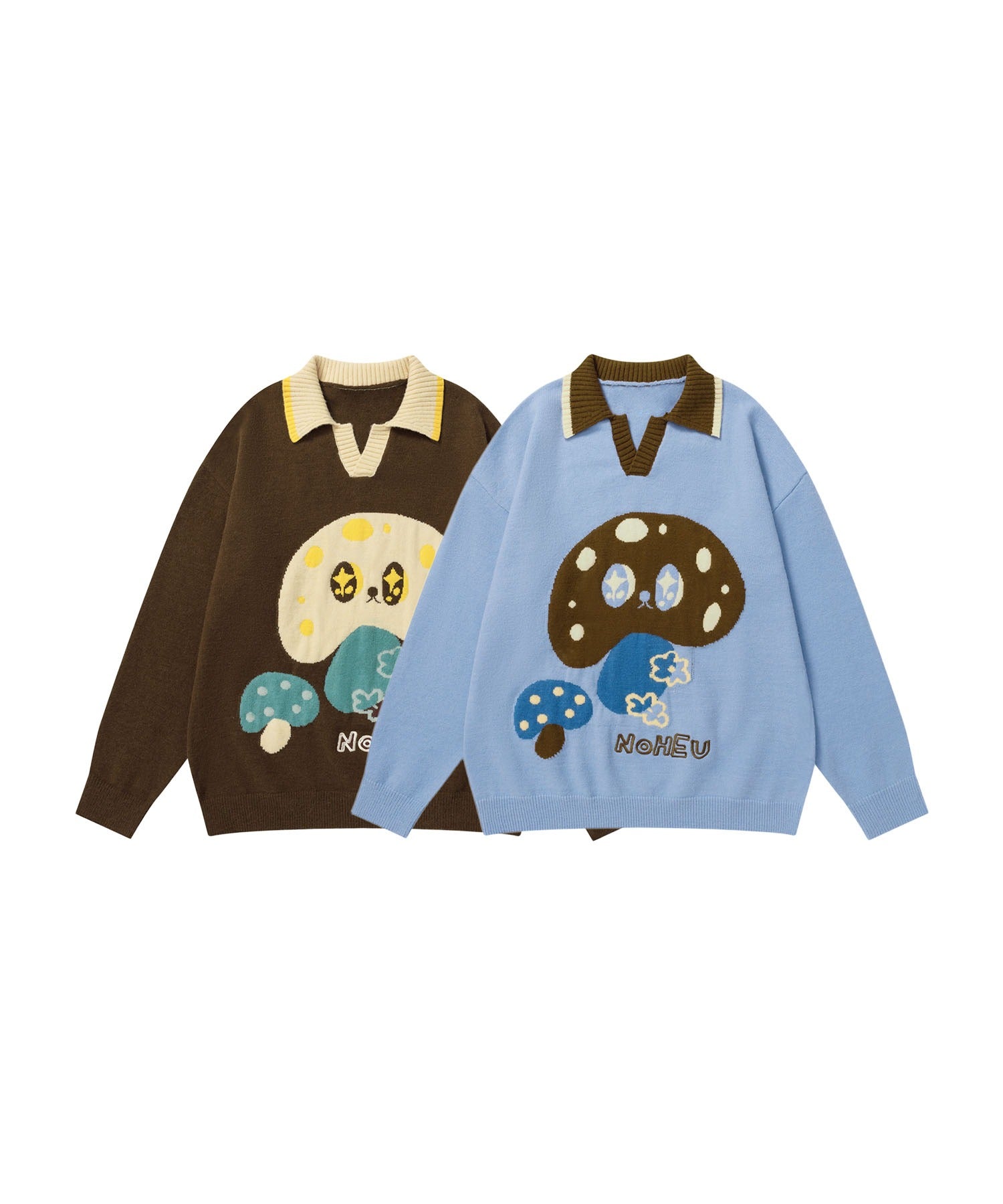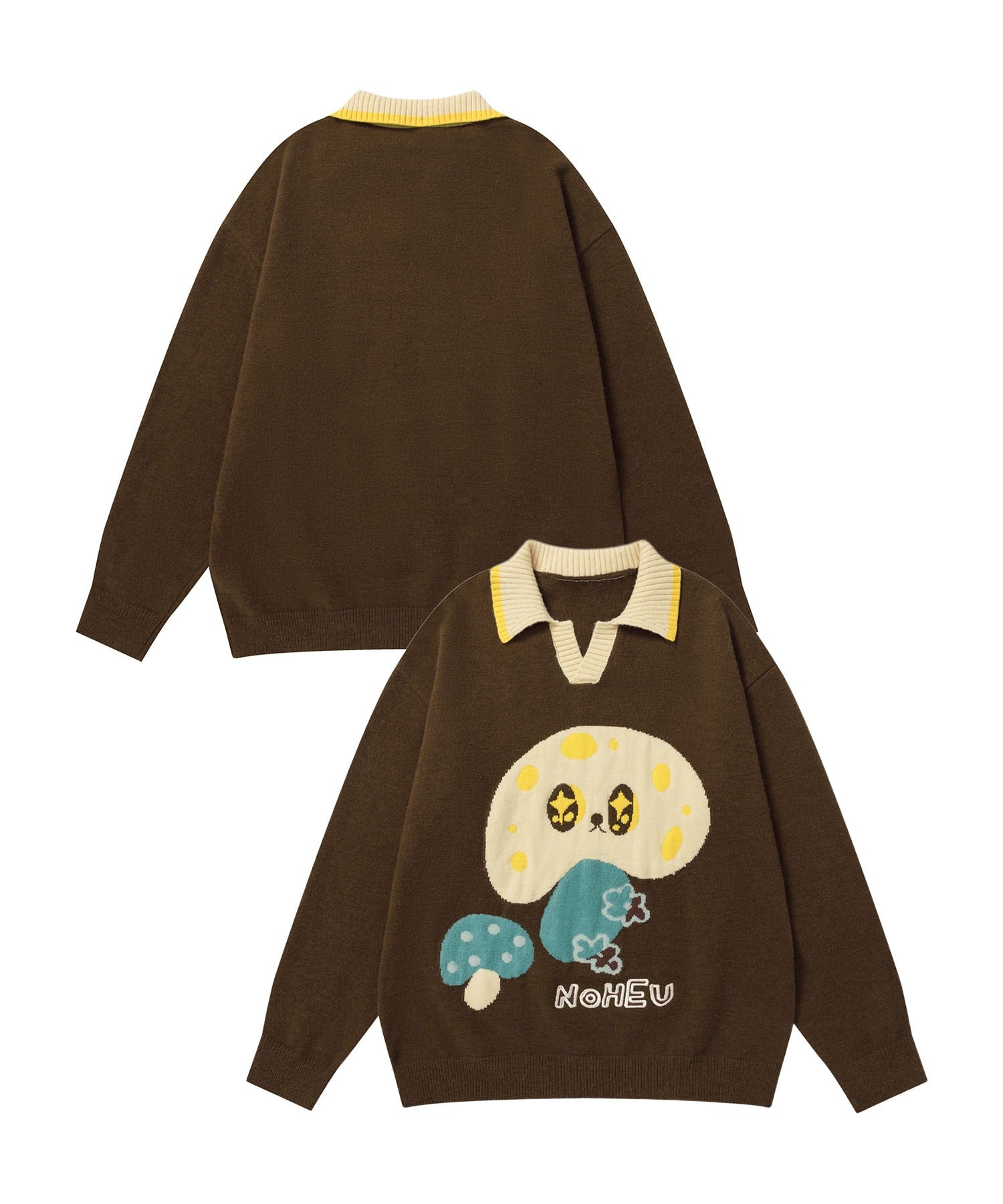 大きなキノコキャラクターがユーモアたっぷりに編み込まれた目を引くデザイン。