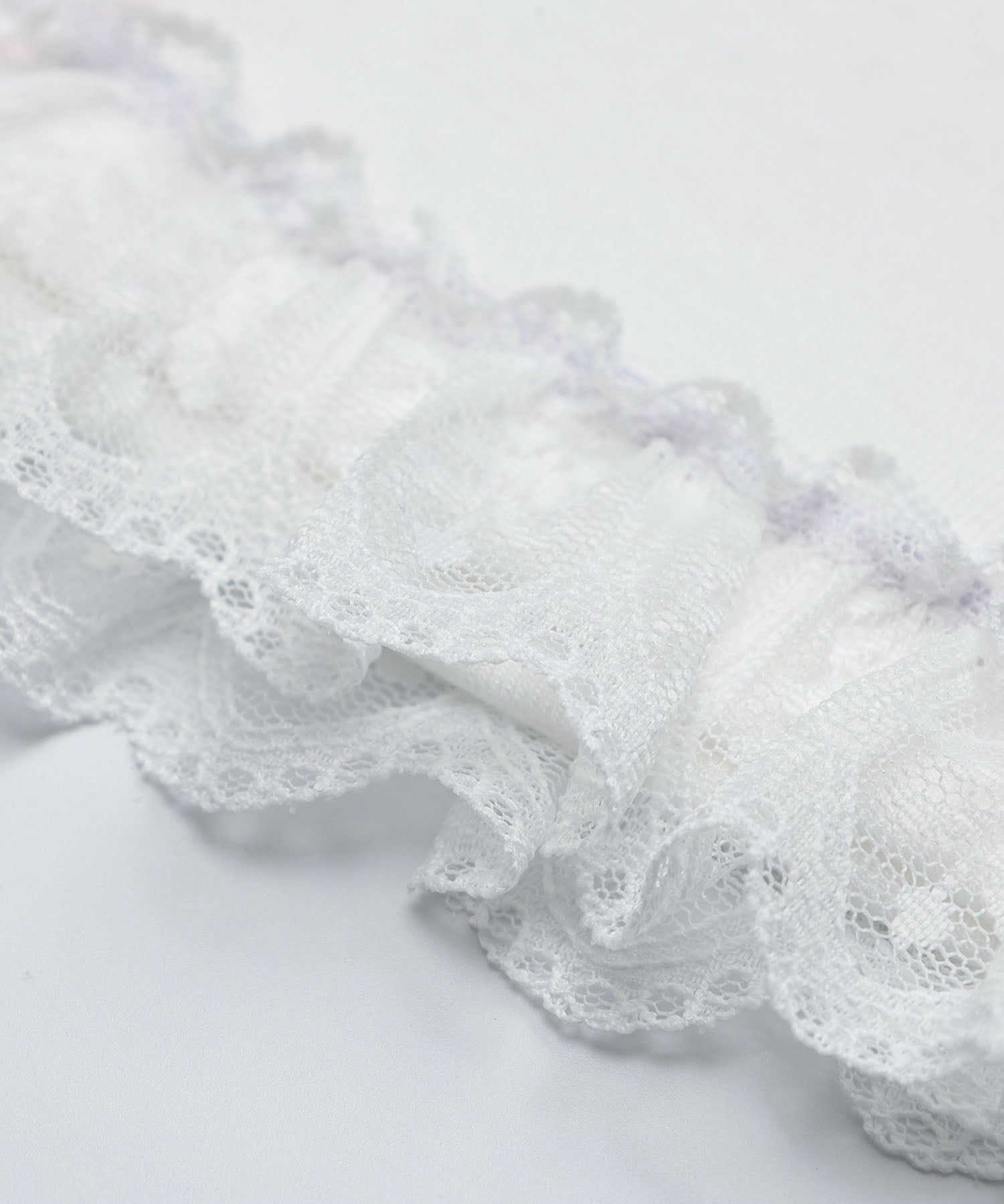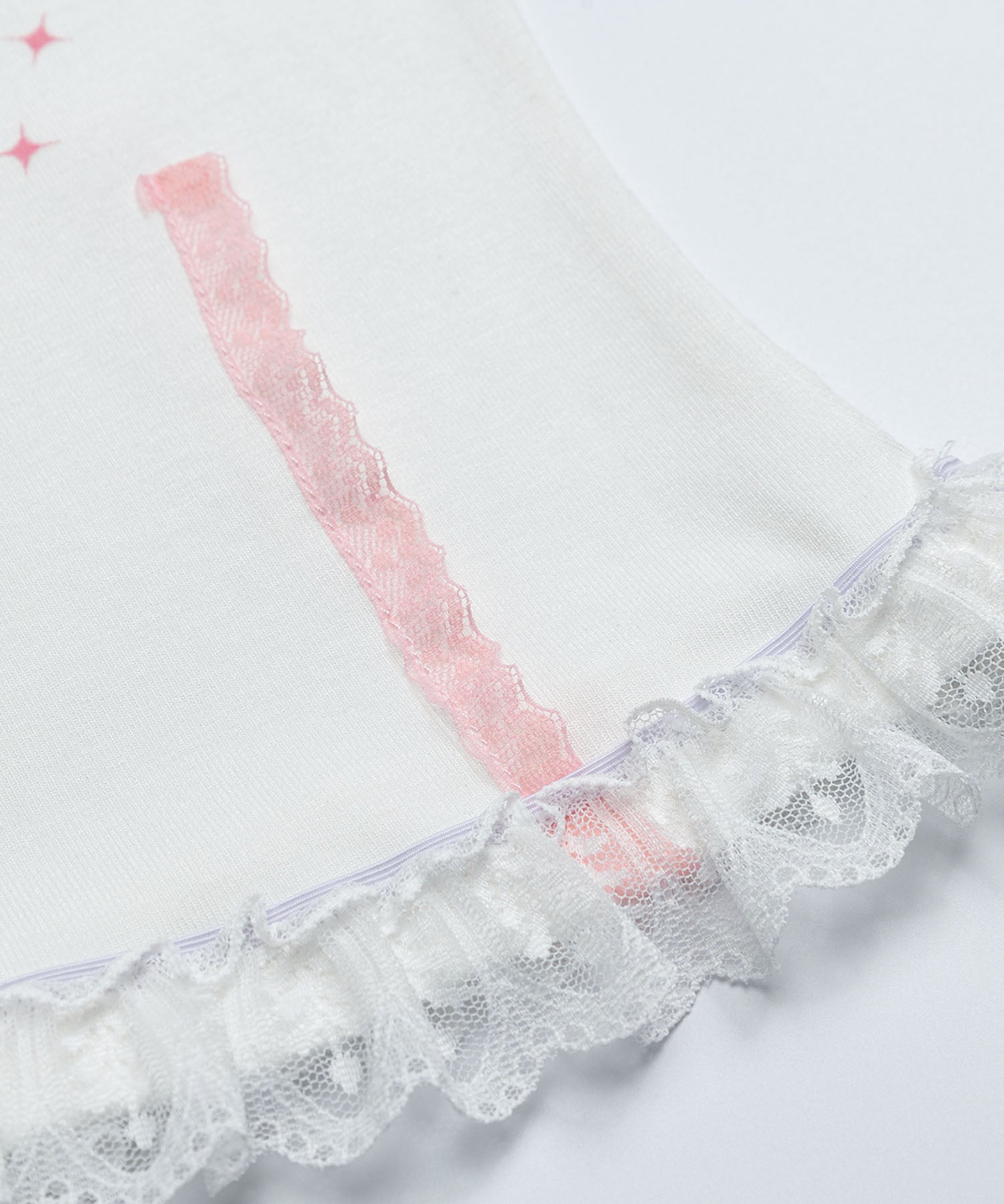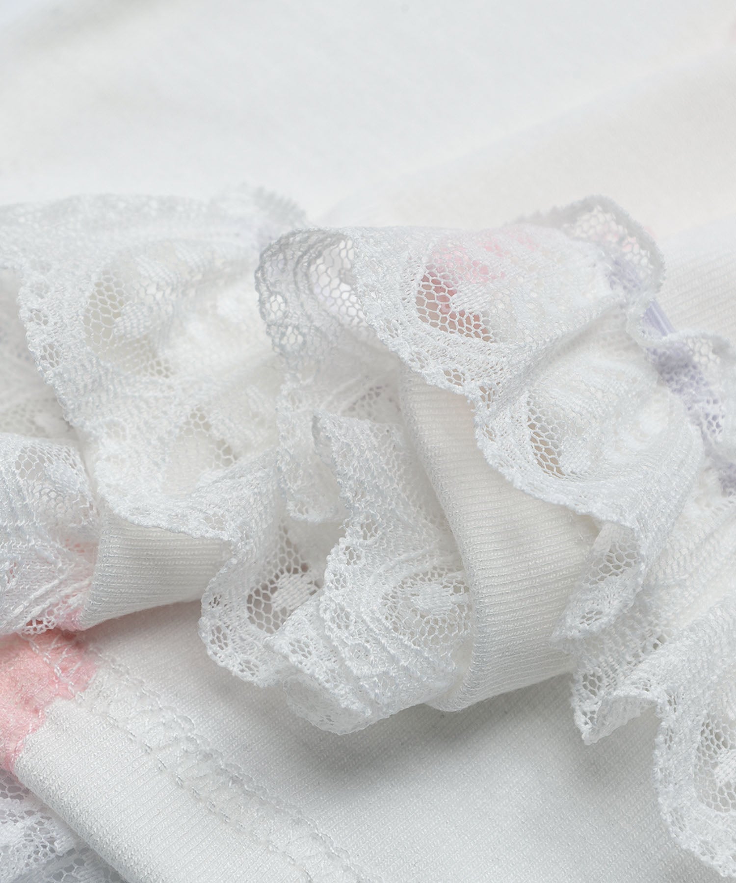 襟ぐりと裾には繊細なレースフリルをあしらい、女の子らしいガーリー感をプラス。