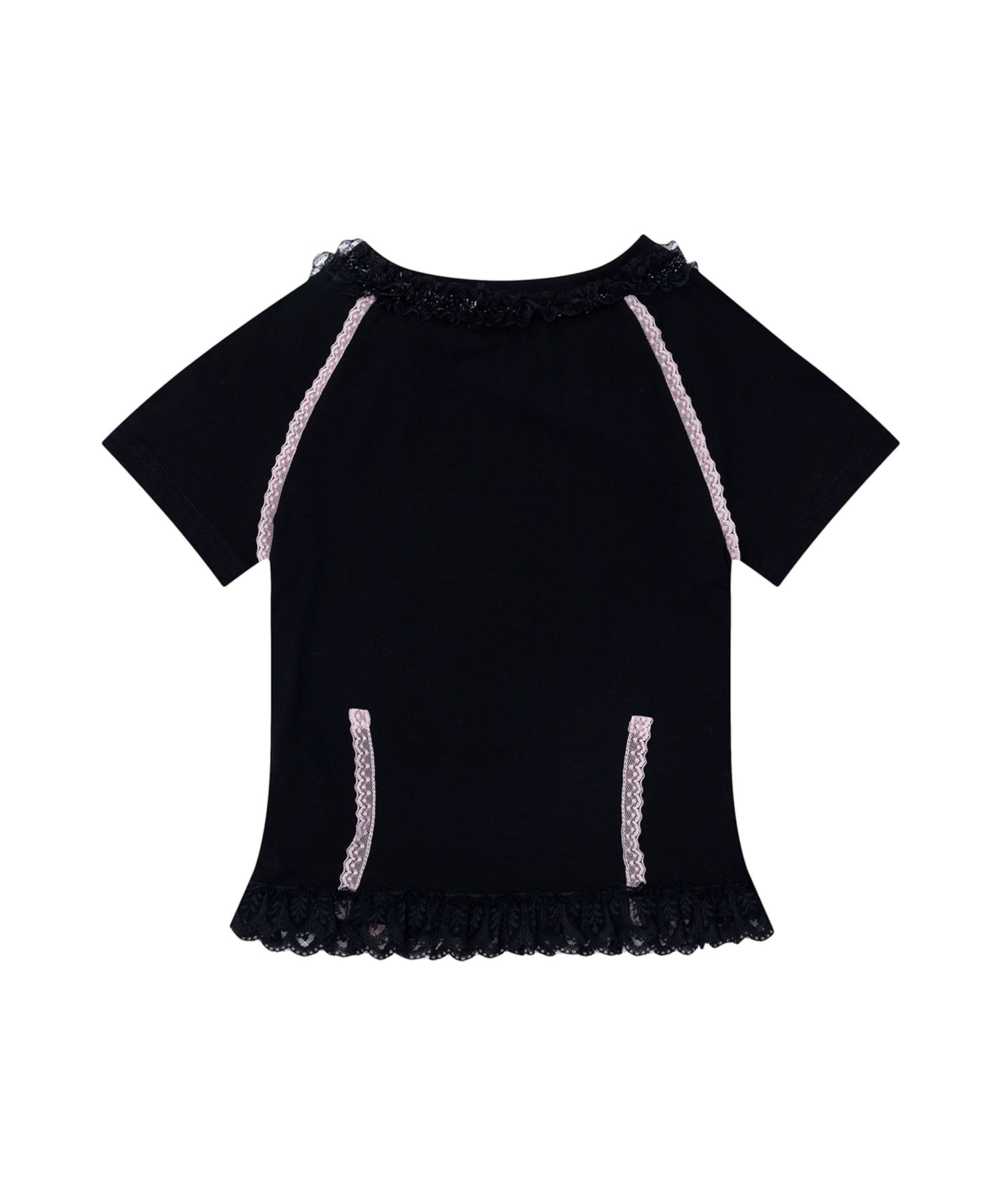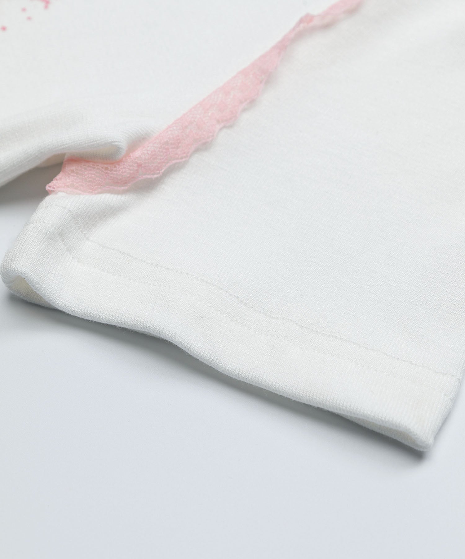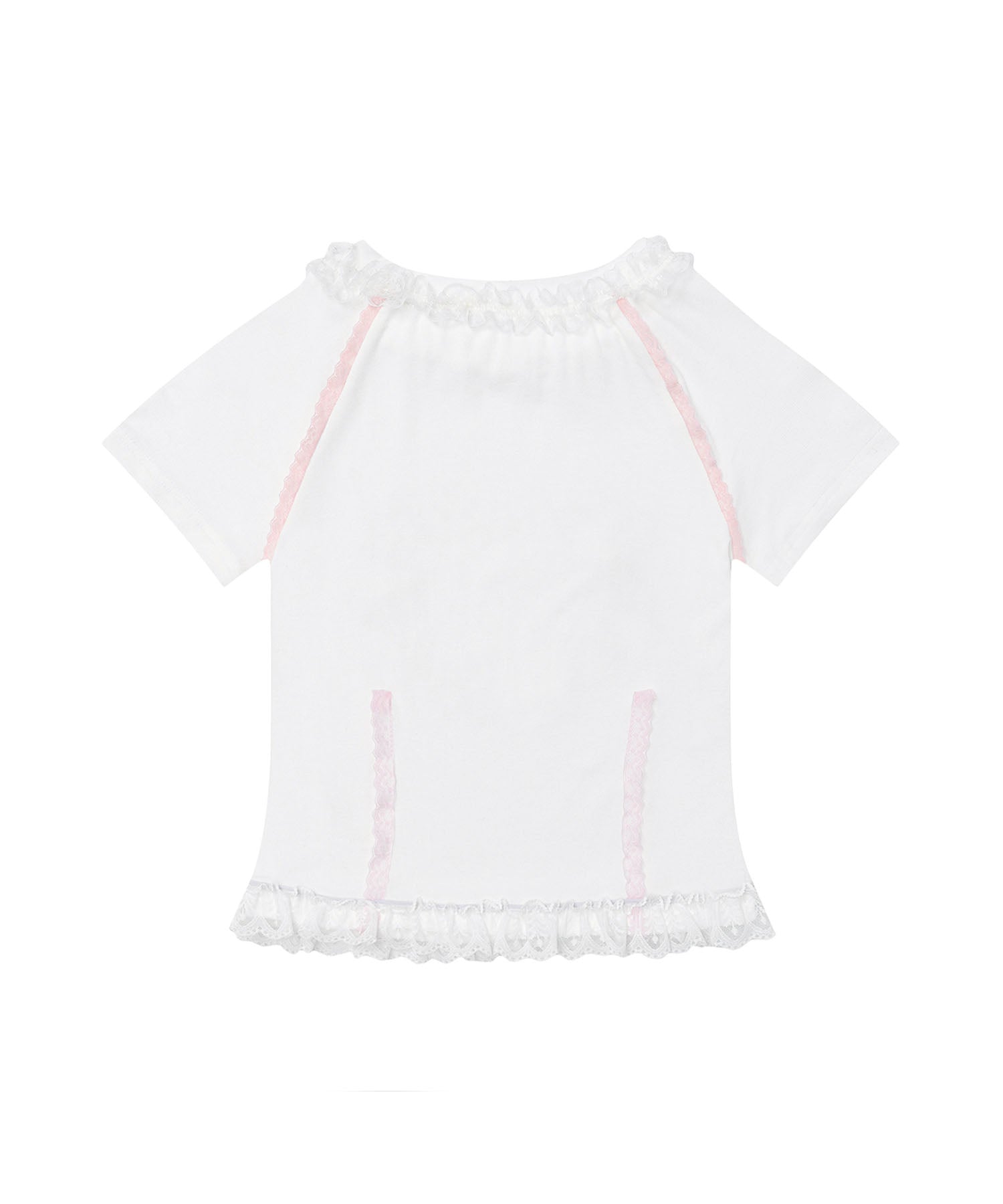 襟ぐりと裾には繊細なレースフリルをあしらい、女の子らしいガーリー感をプラス。