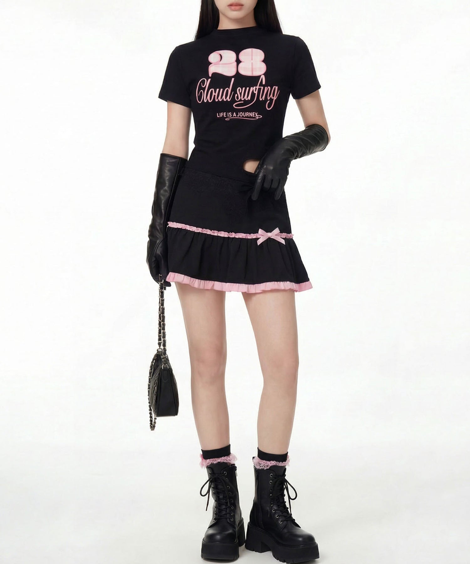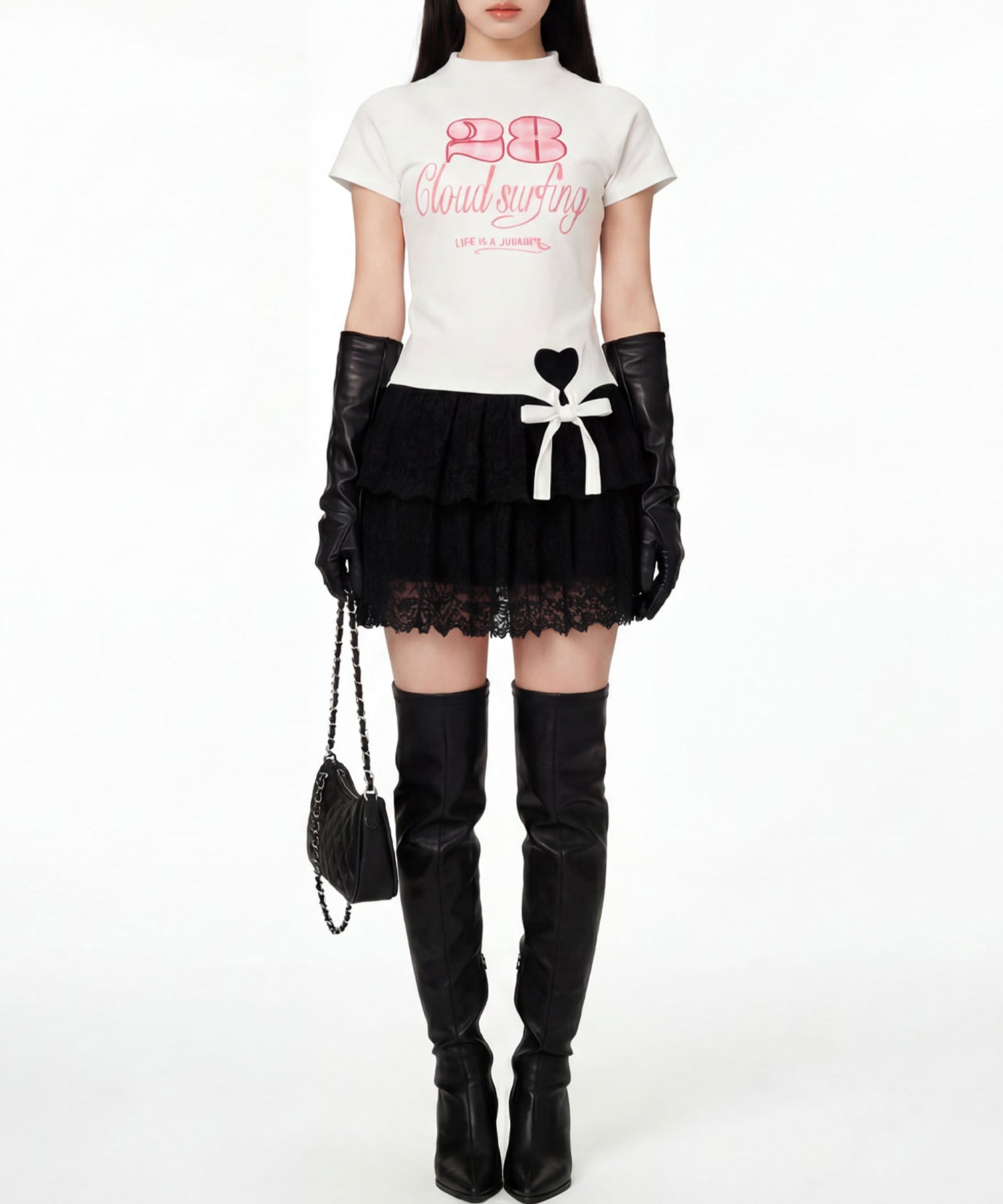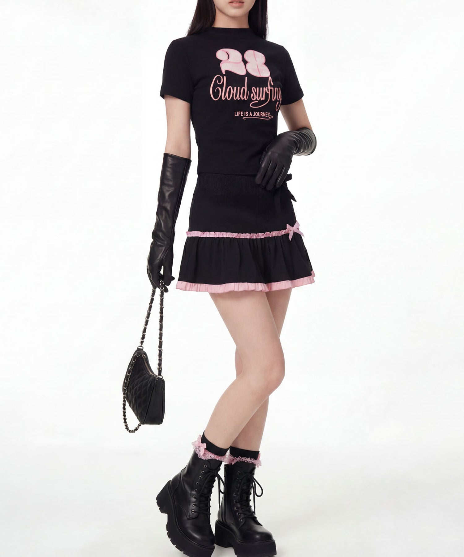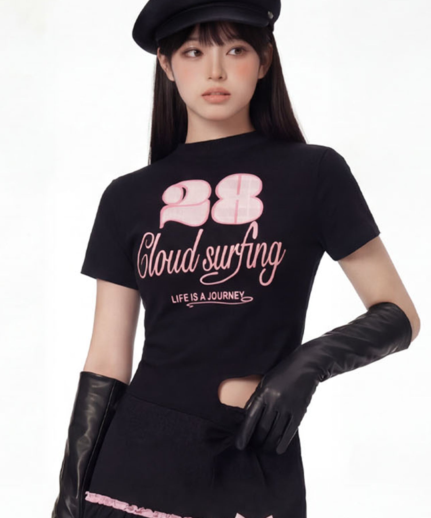 大きめの“28 Cloud surfing”英字ロゴが目を引くガーリーカジュアルTシャツ。