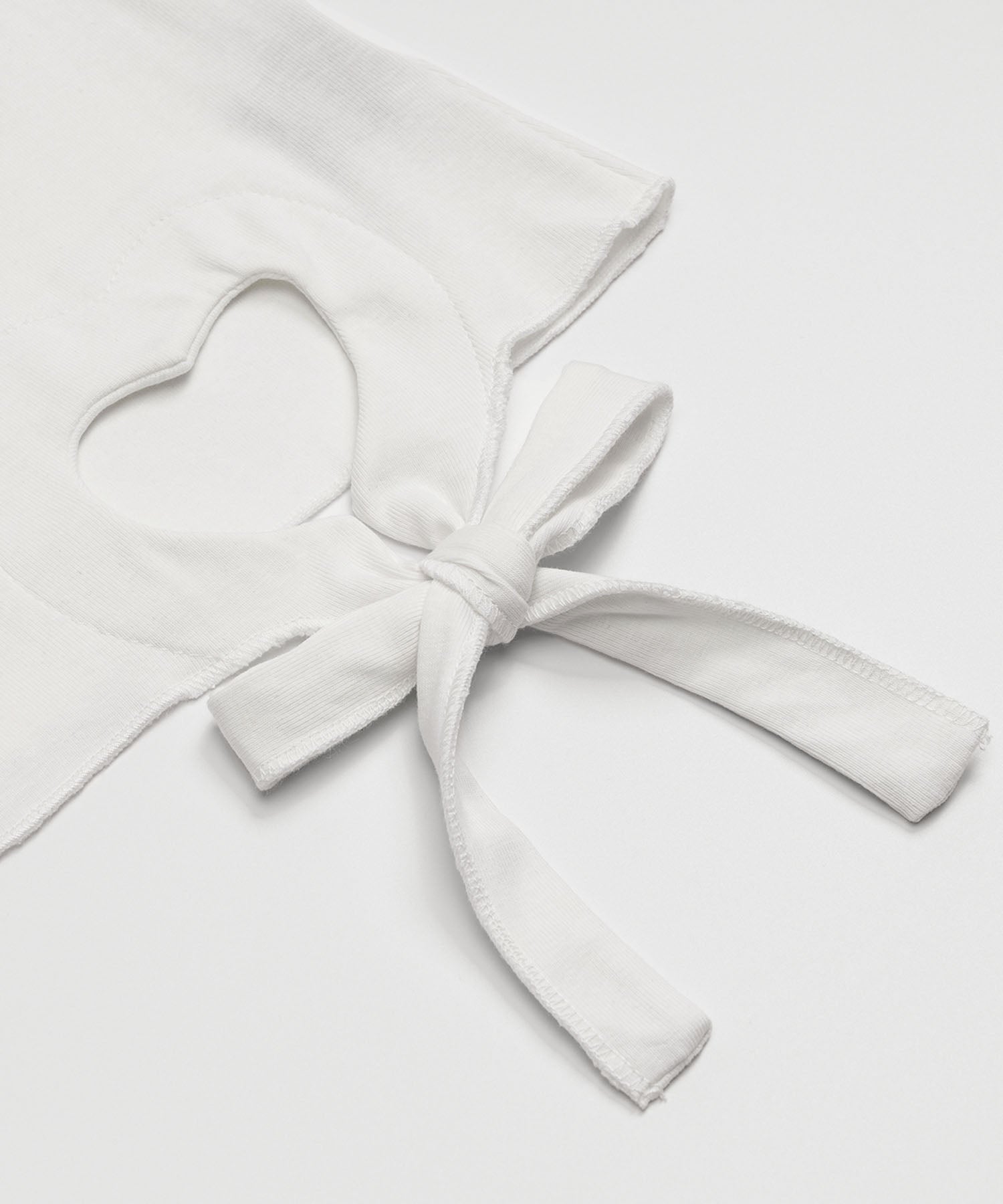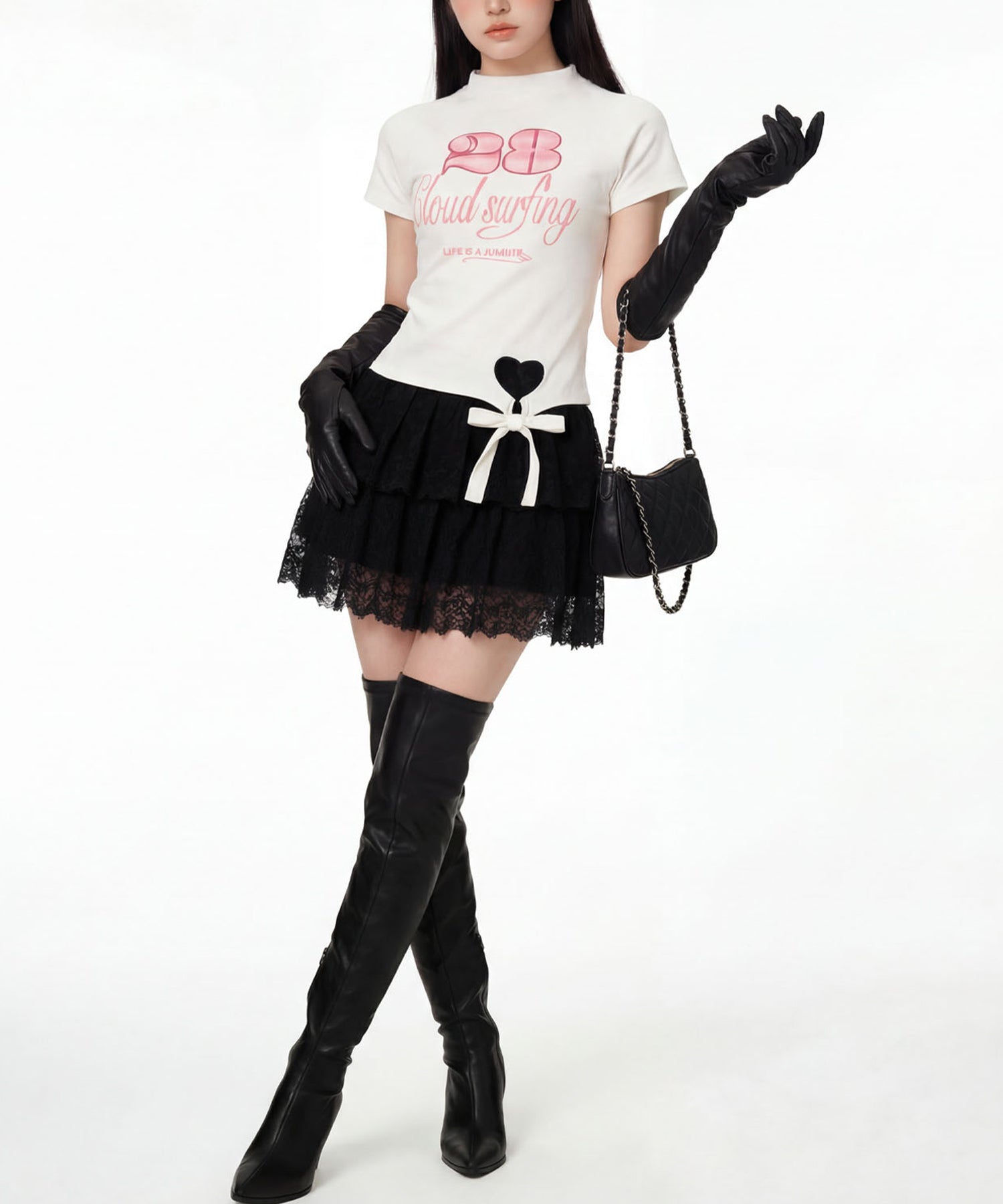 裾のハート型カットとリボン結び仕様がY2Kトレンド感のあるガーリーストリートスタイルに着こなしせます。