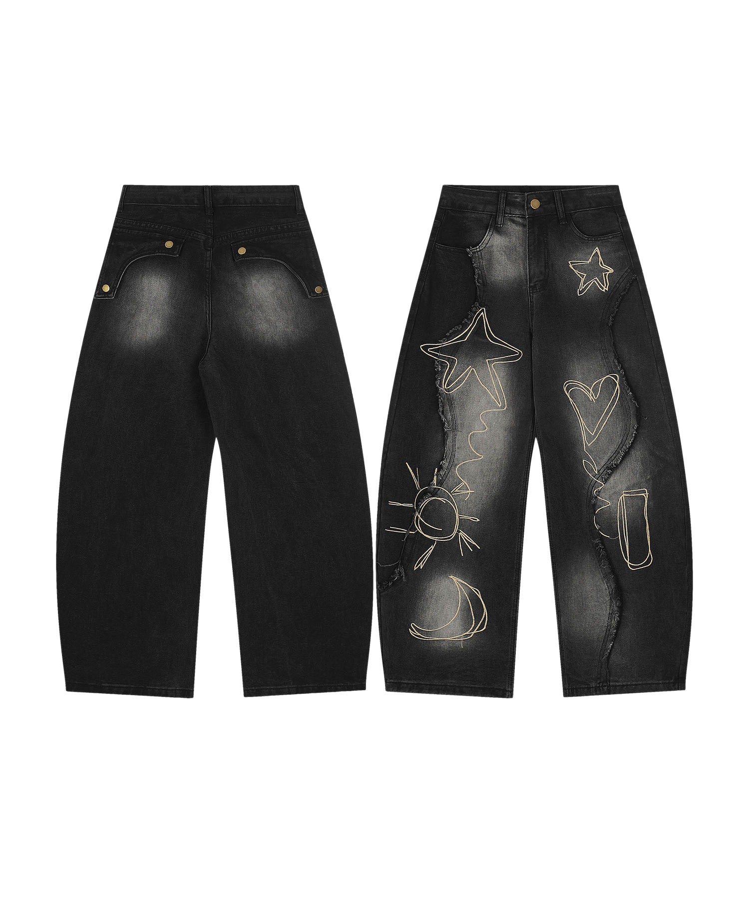グラフィックステッチ ダメージ加工 デニムパンツ