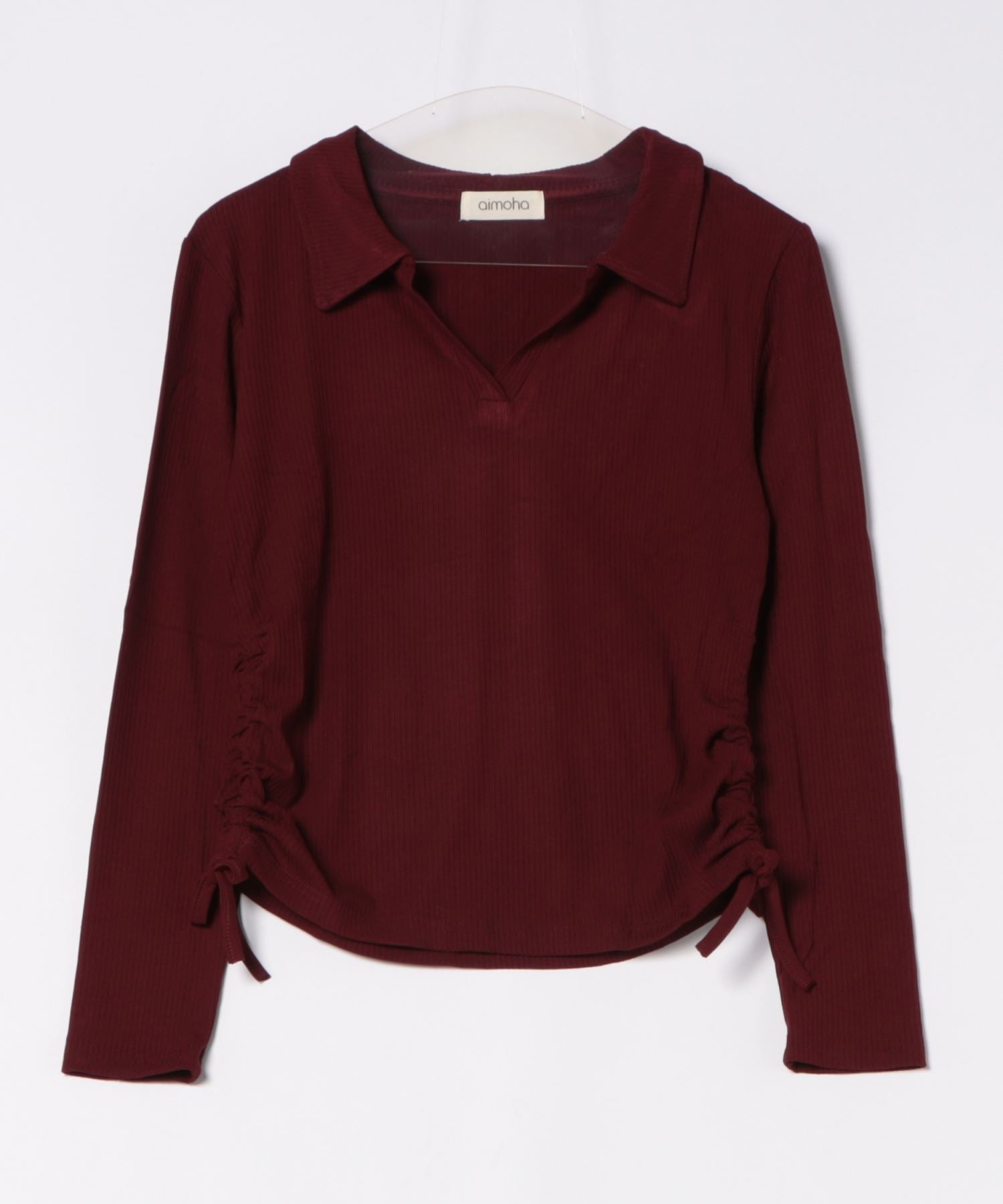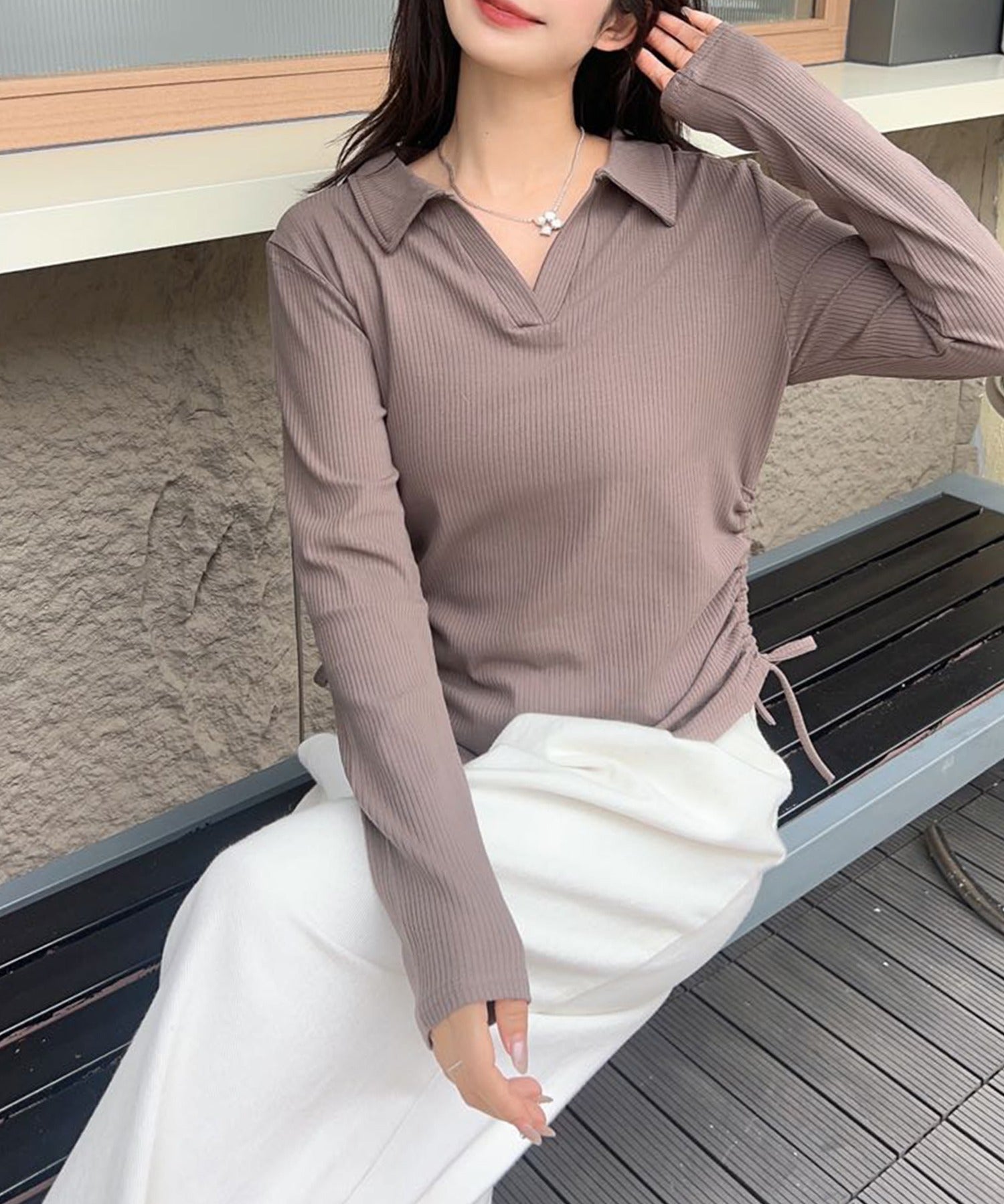 シンプルながらもトレンド感溢れる、デザイントップス。胸元のV字カットが顔周りをすっきりと見せつつ、リブの素材感がスタイリッシュな印象に仕上げてくれます。襟もついているので、きちんと感のあるキレイめな着こなしにも。サイドリボンでシルエットをお好みに調整可能。さまざまなカラーバリエーションがあり、デイリー使いからオフィスカジュアルまで、幅広いシーンで活躍する万能アイテムです。
