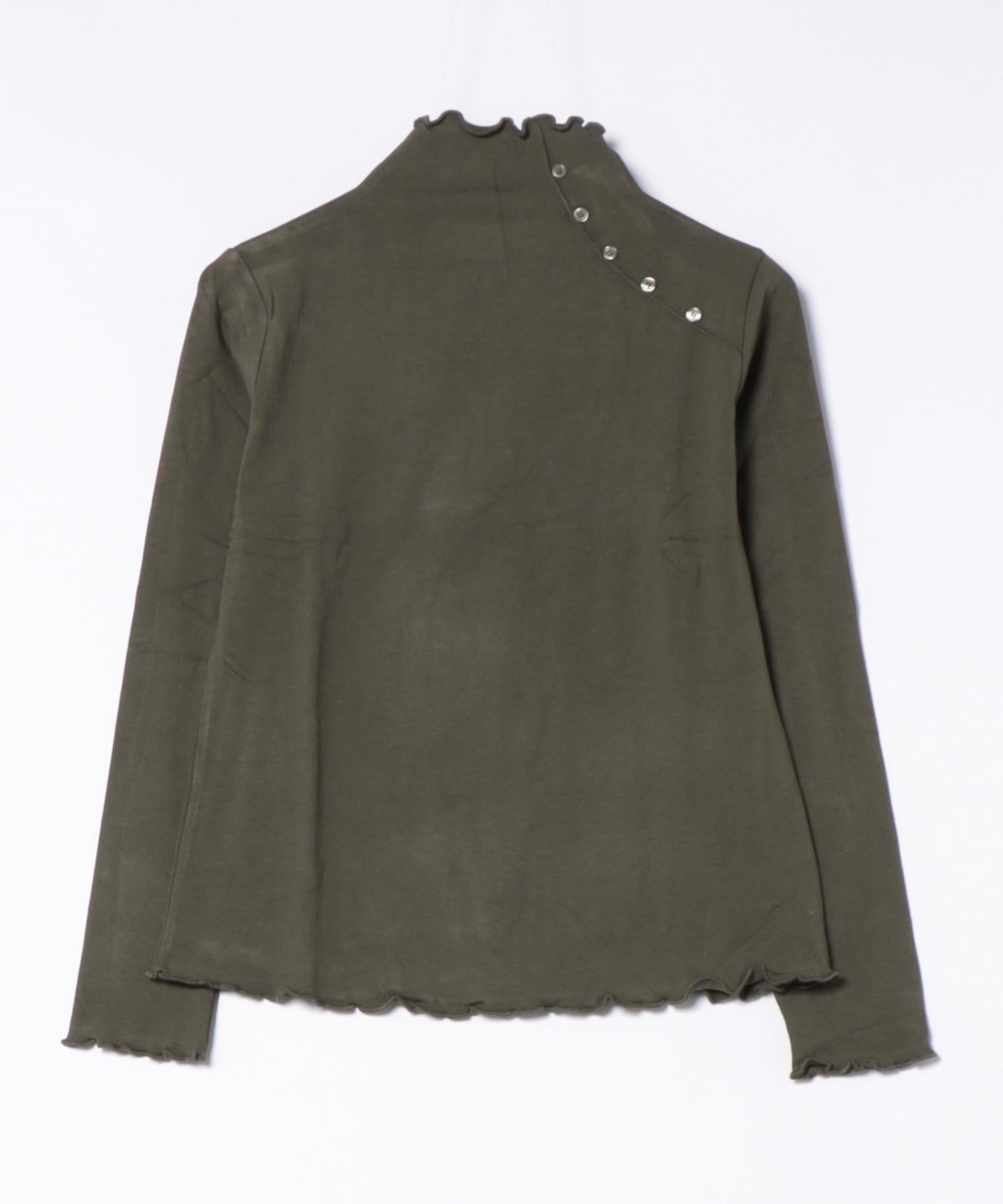 フリルデザインがフェミニンで可愛いハイネックトップスです。着回ししやすい、豊富なカラーバリエーション!斜めに配置されたボタンがアクセントとなり、シンプルながらも印象的なデザインです。リブ素材を使用しており、体にフィットしつつも快適な着心地を提供します。袖口と裾のフリルがエレガントな雰囲気をプラスし、デートやお出かけ、オフィスカジュアルとしても活躍する一枚です。女性らしさと上品さを兼ね備え、どんなボトムスにも合わせやすい万能アイテムです。