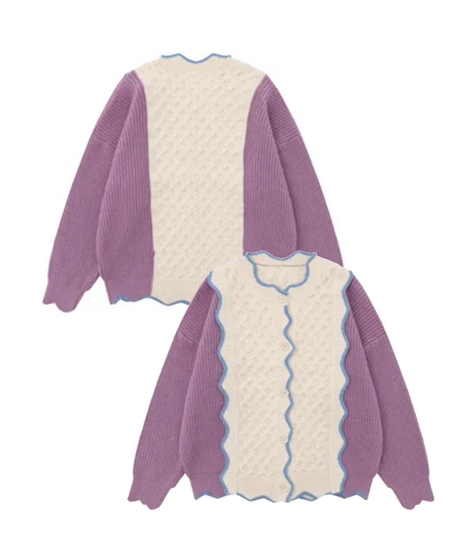 波形の縁とケーブル編みによるビスケットのようなデザインが可愛いニットカーディガンです。