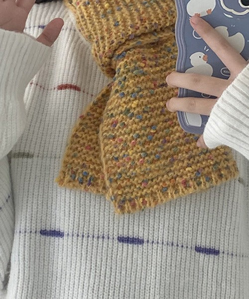どんなスタイルにも良く馴染むニットデザイン。 140cmの長さがきれいに結んでも、くるくる巻きにしてもOK! アウターやニット等、ボリュームのあるものにも合わせやすいマフラーは、ひとつ持っておくと重宝します。 色味が可愛いマルチカラーで秋冬スタイルのアクセントに大活躍する、何枚でも持っておきたいアイテムです。 シンプルなデザインなので服装を選ばず、色々な巻き方を楽しめます。 軽量糸使用、カバンに収納しでも重さ感じないです。 プチプライスなのも嬉しいポイントです。