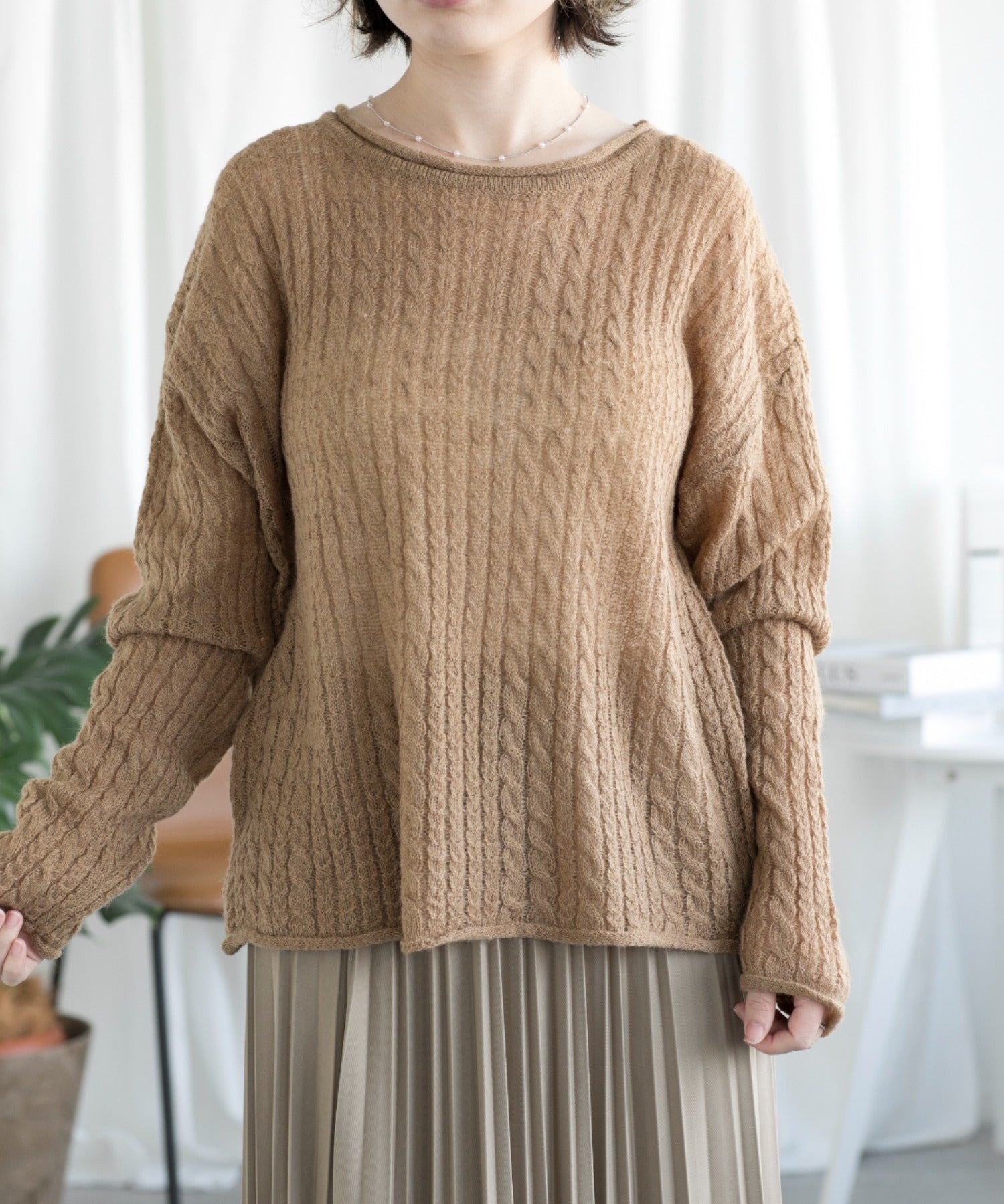 透け感のあるニットは、やさしく自由な雰囲気を演出し、春のファッションにぴったりです。