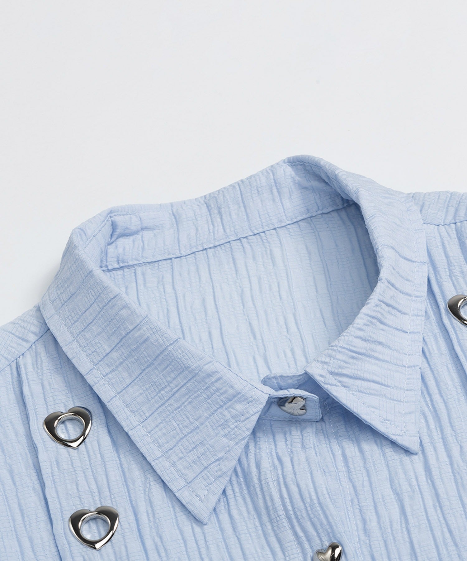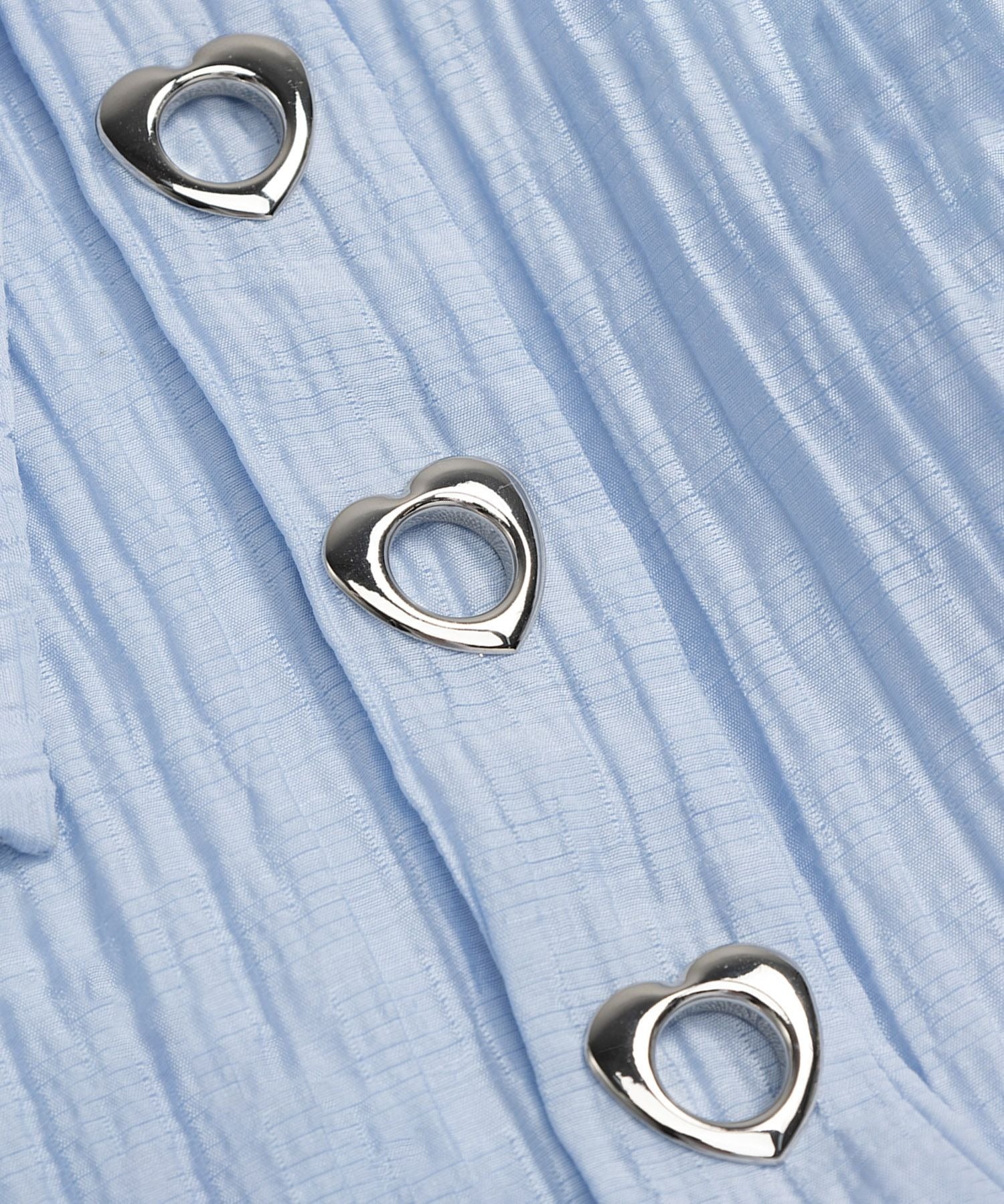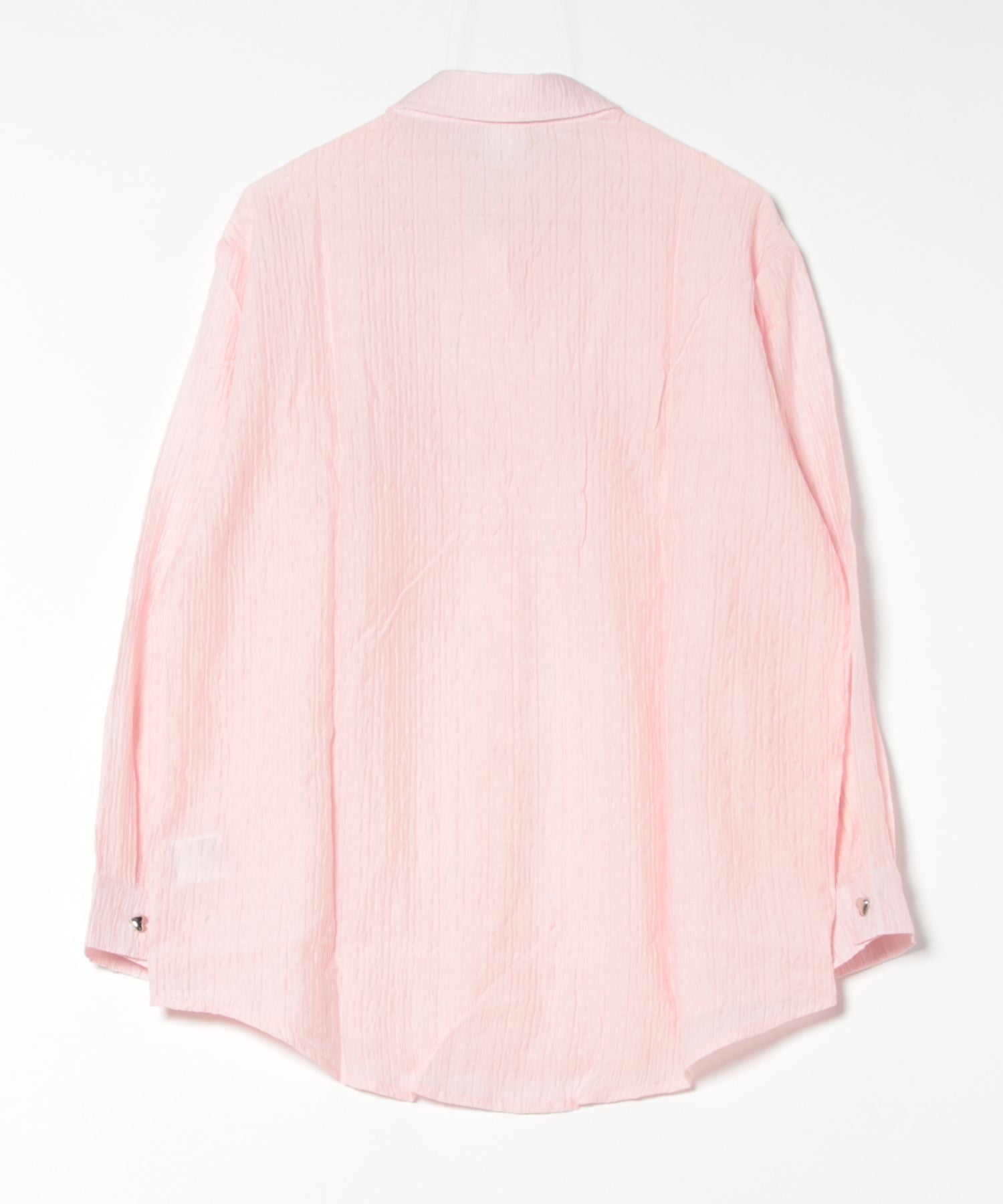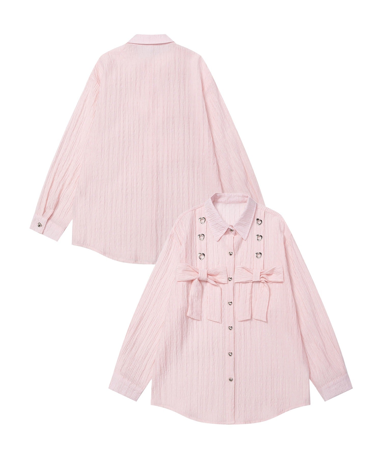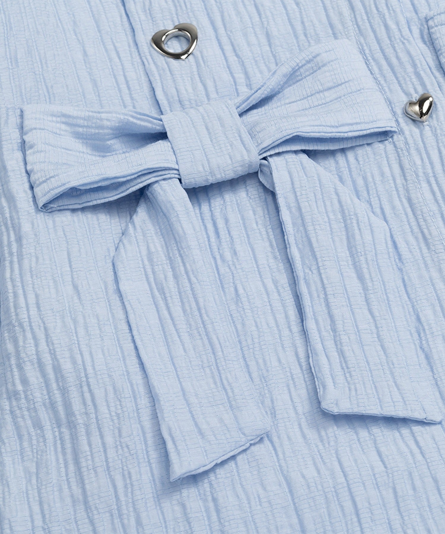 さわやかなストライプ生地に、胸元のリボン&アイレットデザインがアクセントになったロングシャツ。