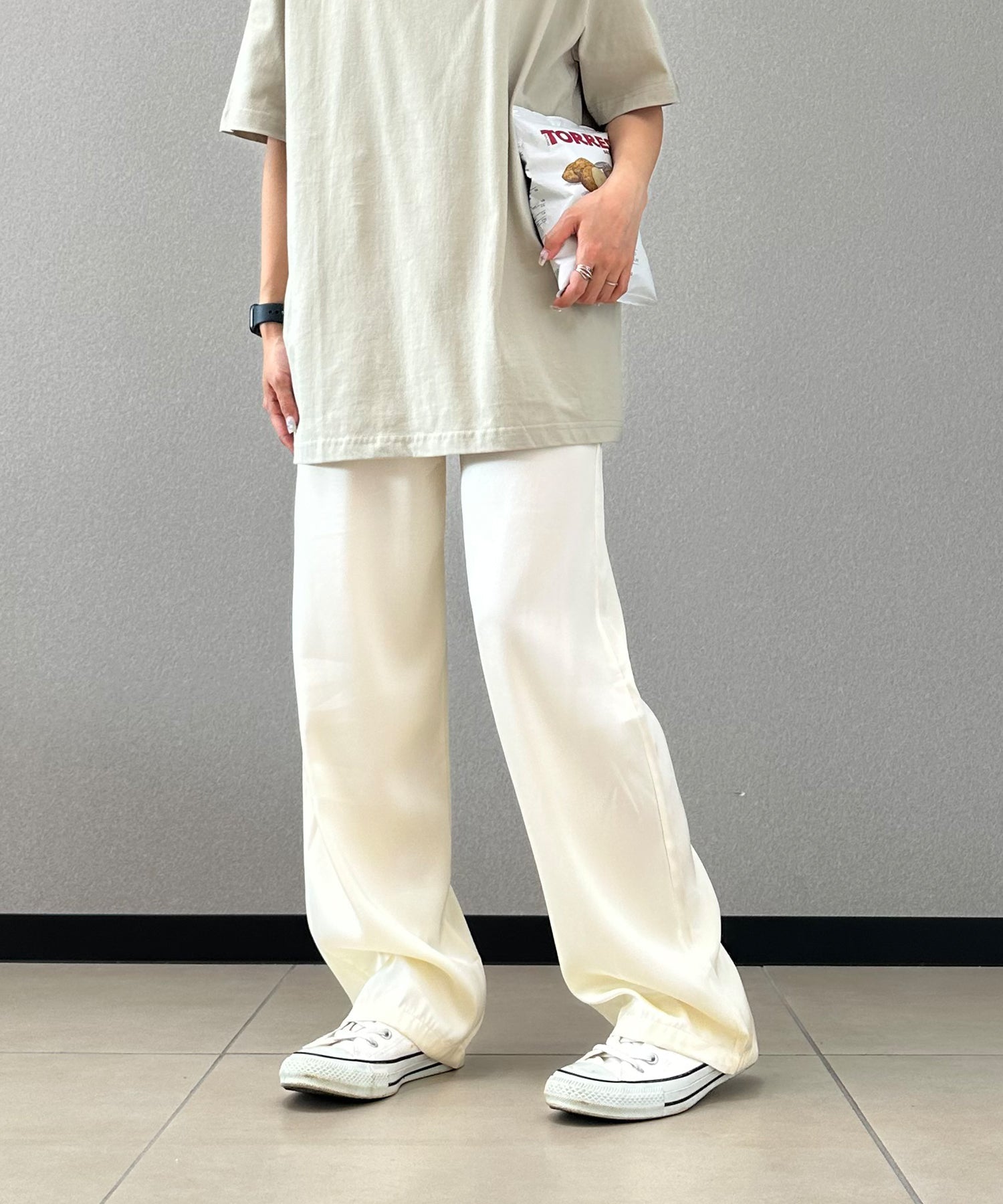 トレンドのワイドシルエットで、夏にサラサラ使えれるサテン素材を使用しており、光沢感があり、上品な印象を与えます。