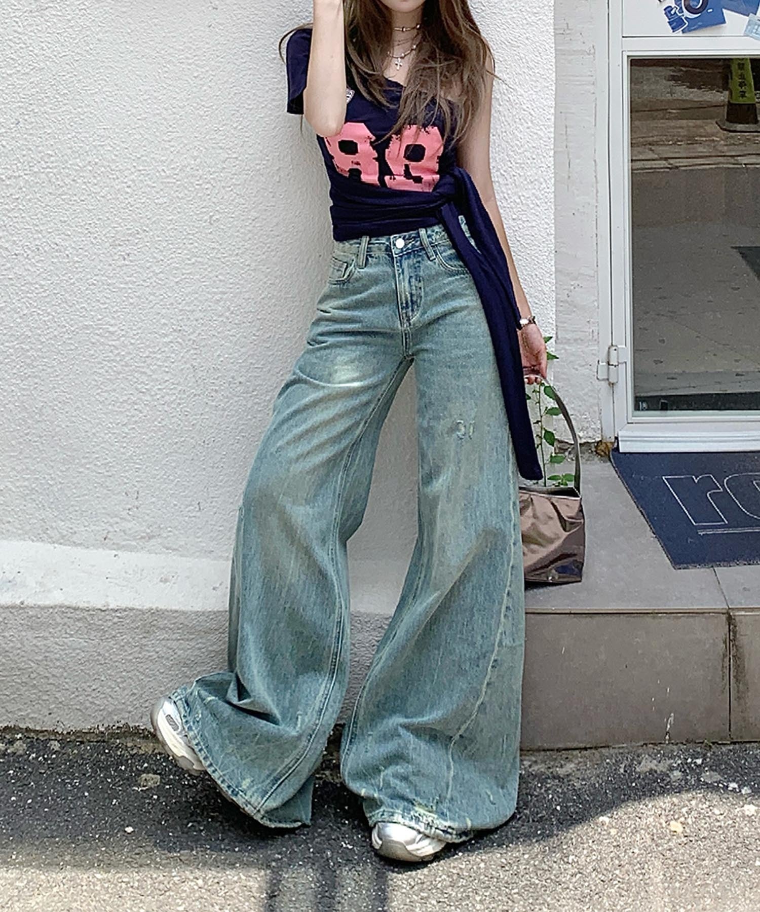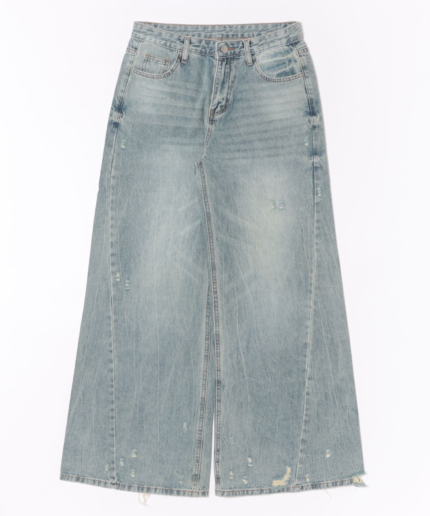 大胆なワイドシルエットと裾ダメージが特徴のストリート映えデニム。