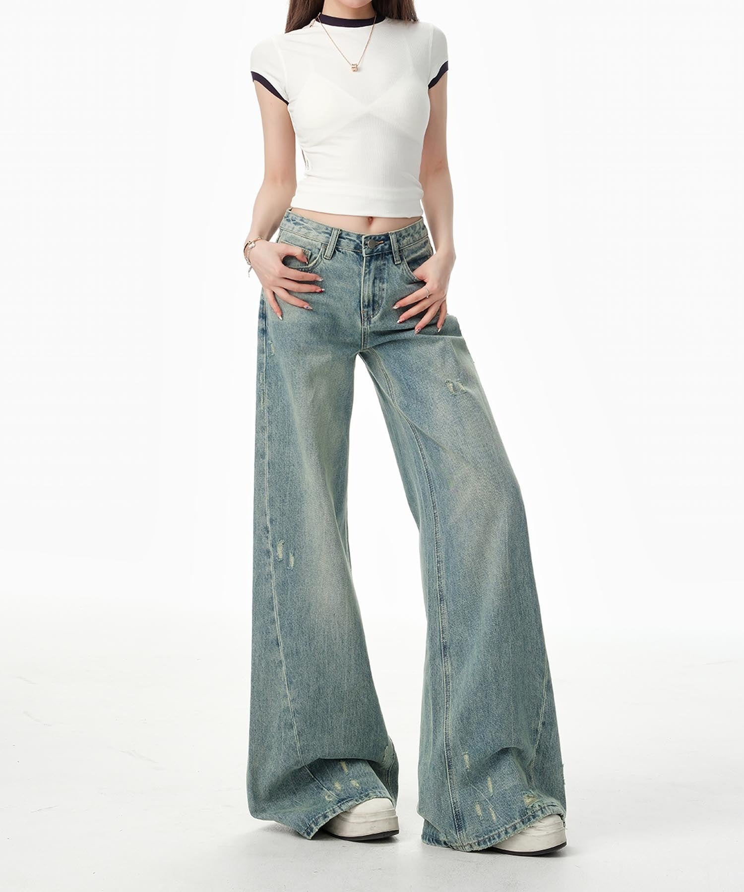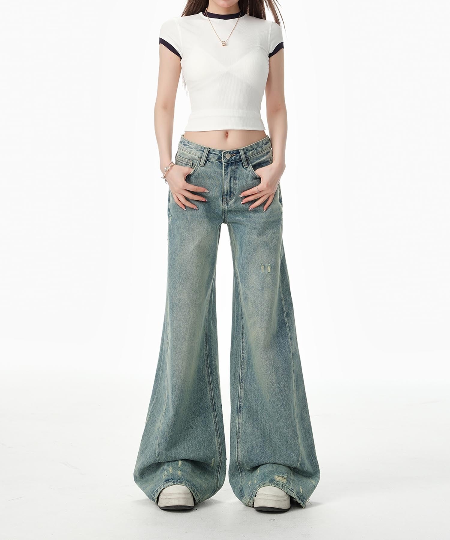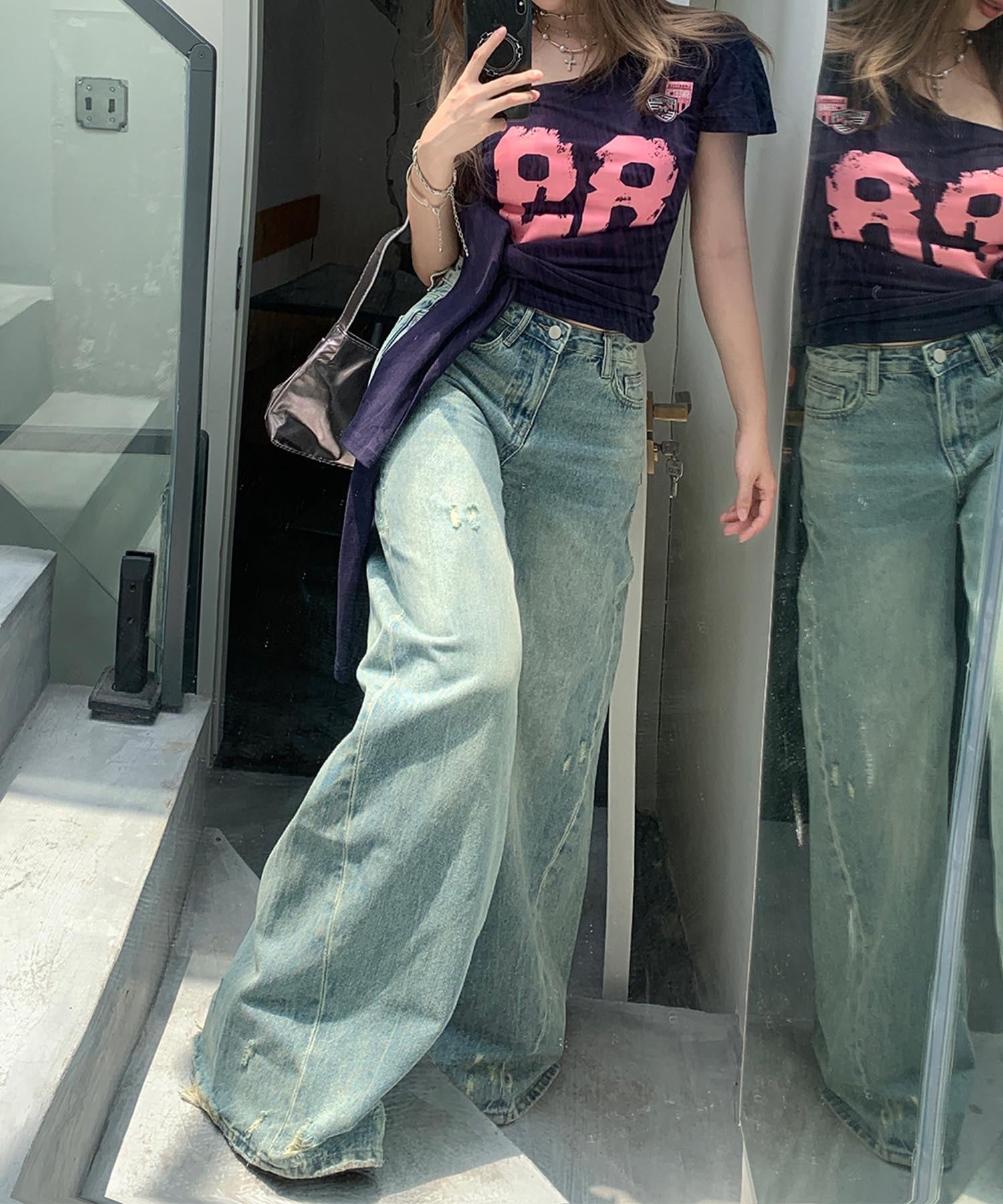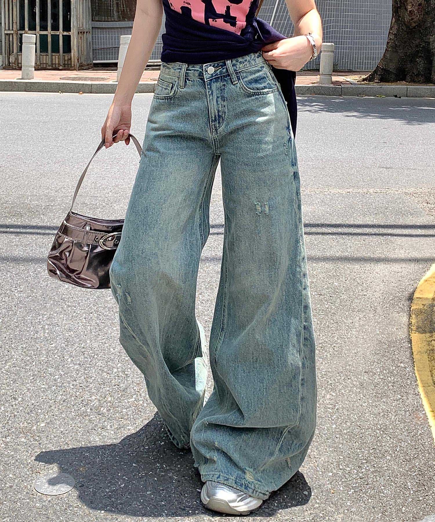 【HOOK】for girls Y2Kダメージルーズワイドデニムパンツ / ヴィンテージウォッシュバギー