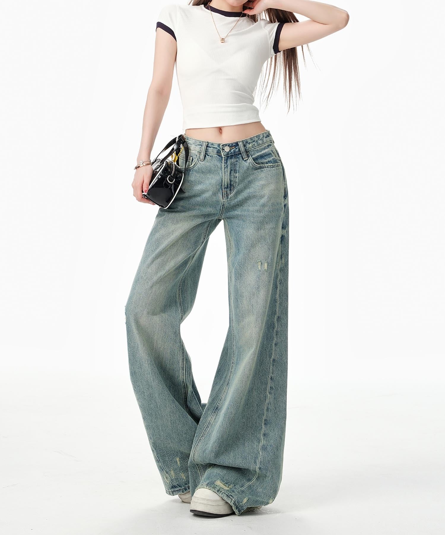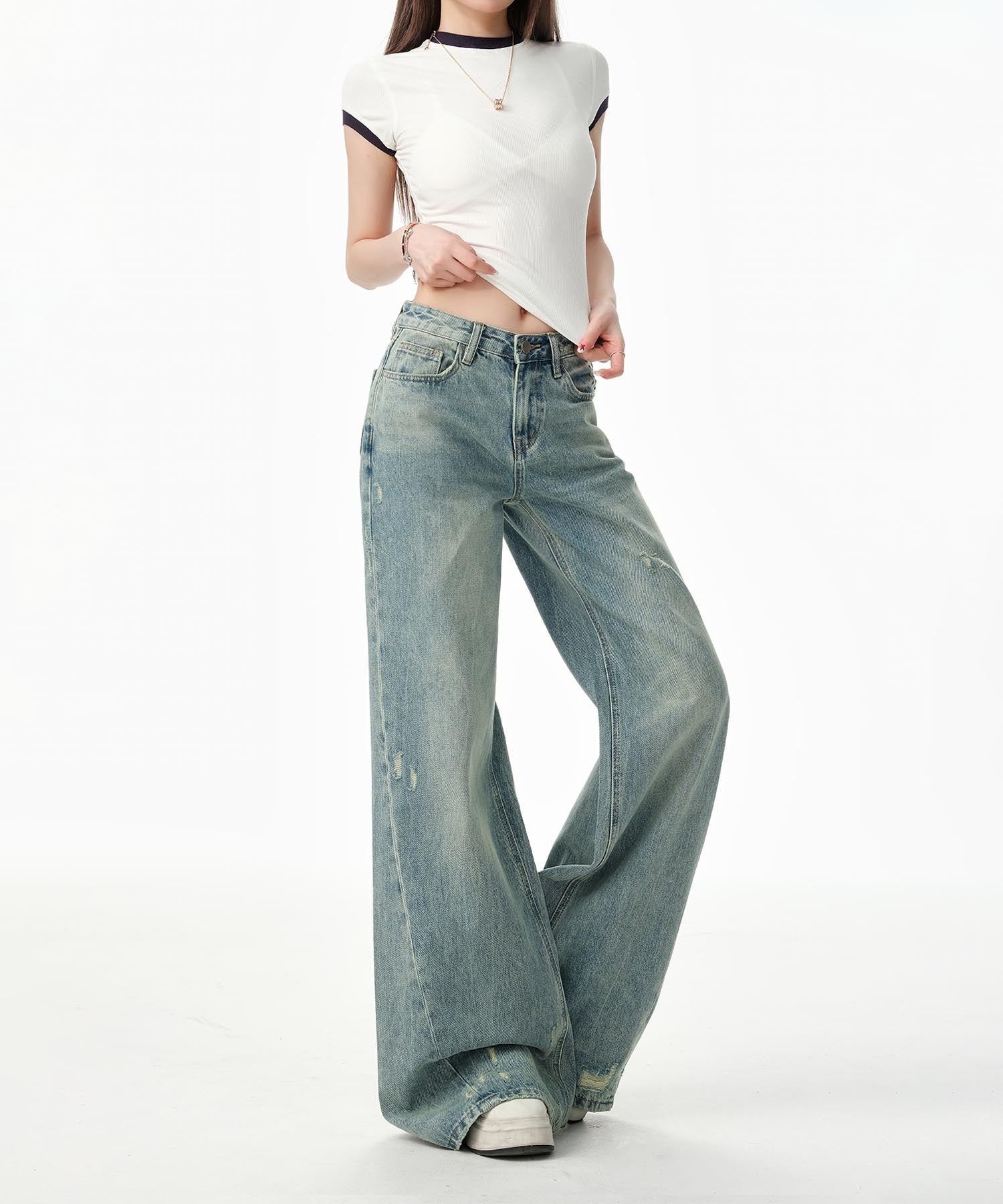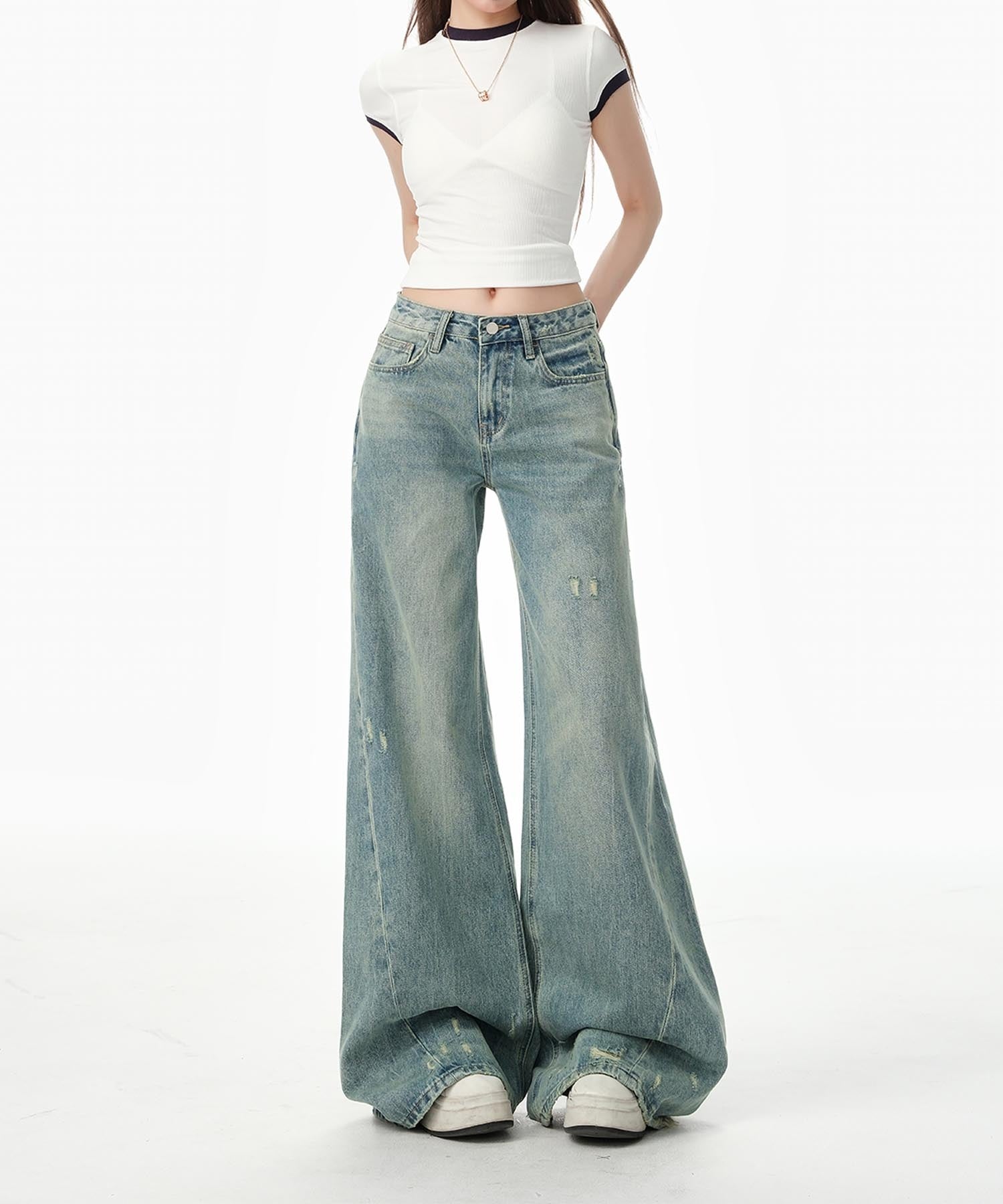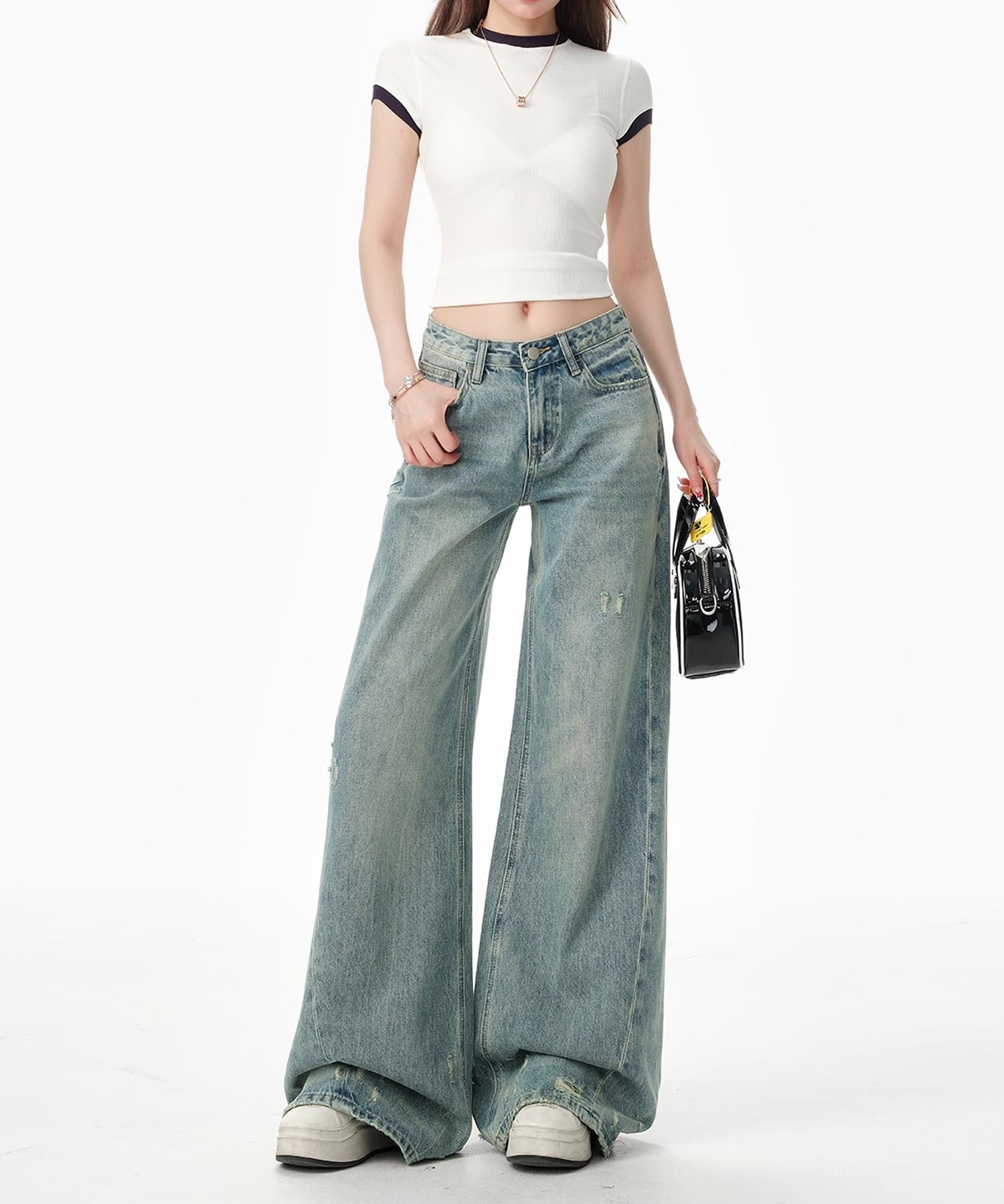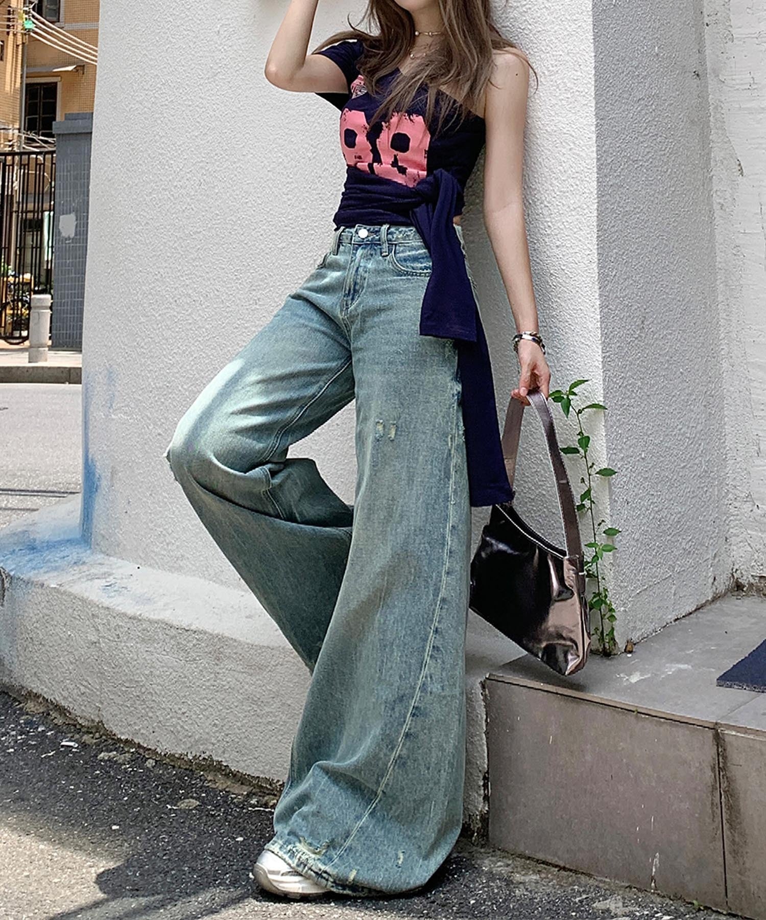 【HOOK】for girls Y2Kダメージルーズワイドデニムパンツ / ヴィンテージウォッシュバギー